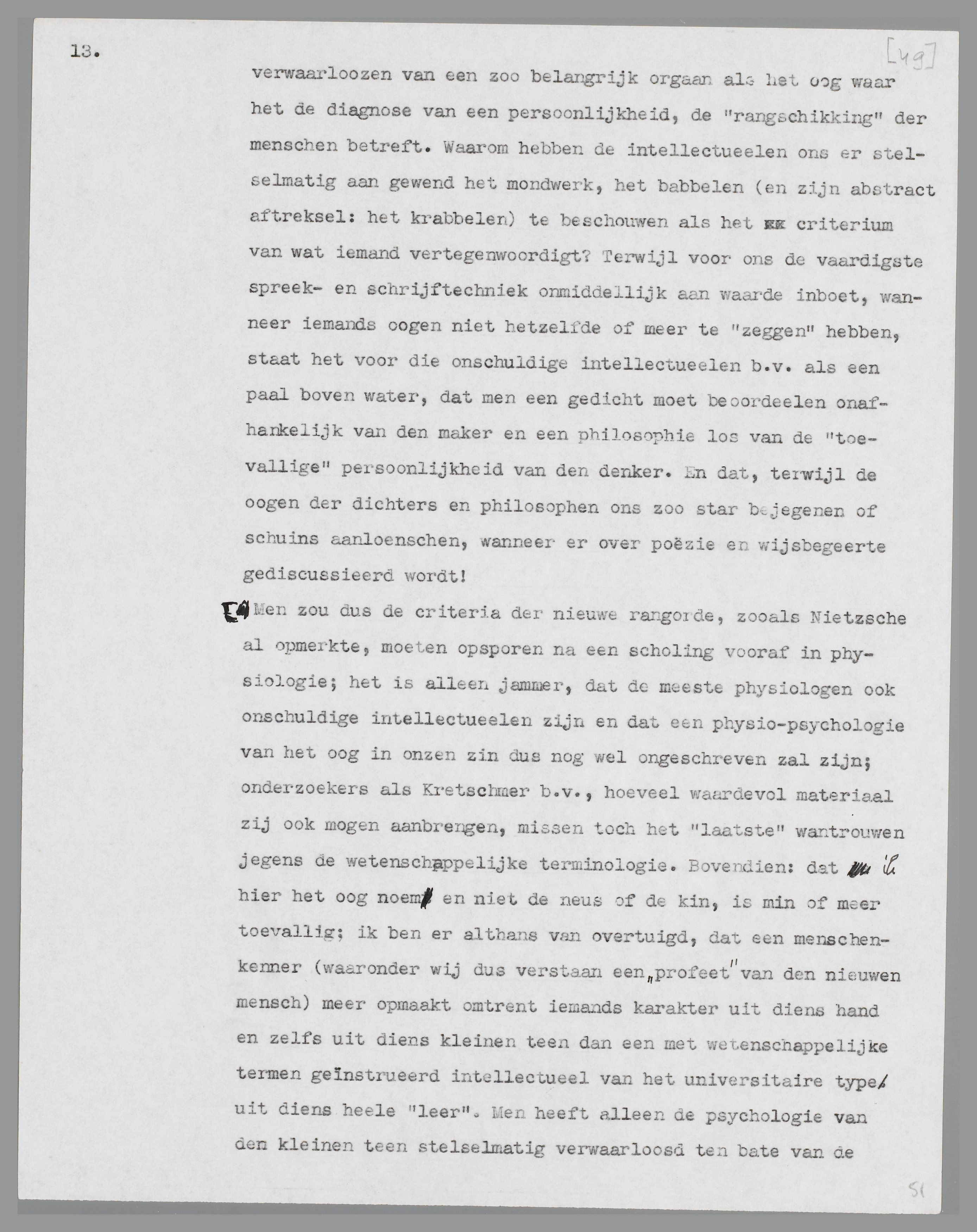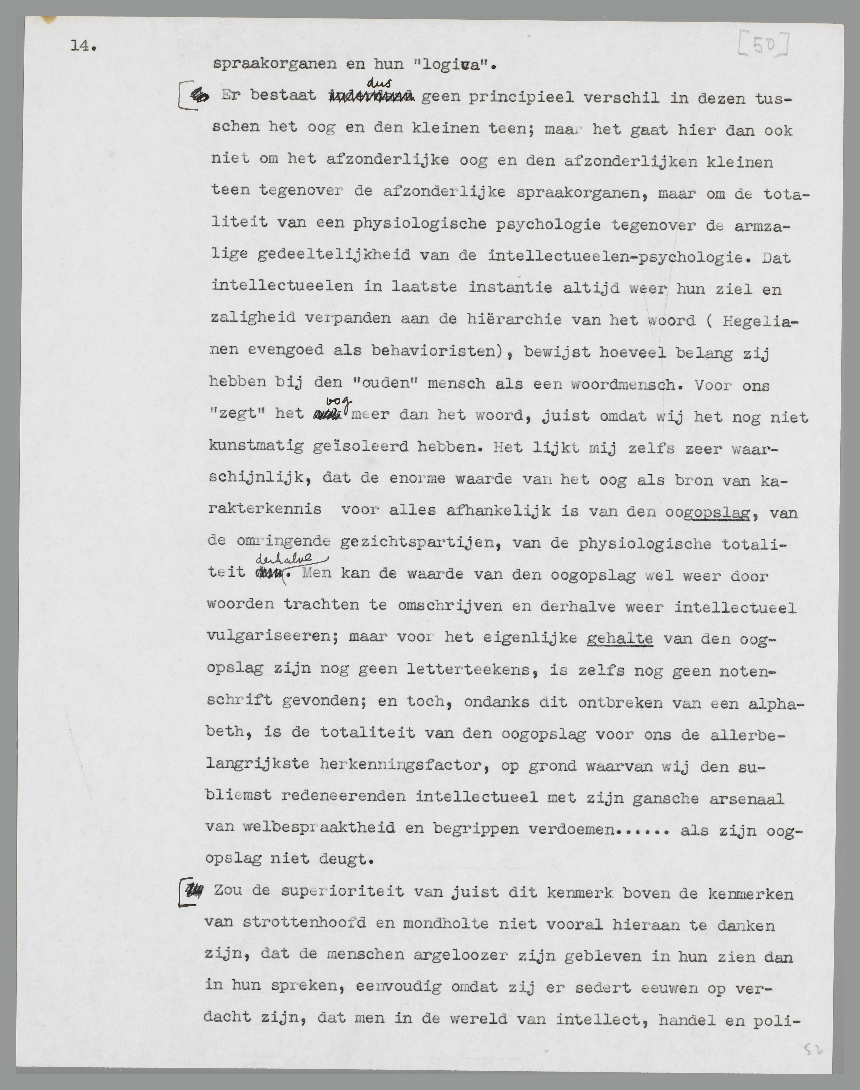 Iemands karakter bepaalt (d.i. herkent) men meestal in de eerste plaats aan zijn oogen. Typeerend voor de overschatting van het strottenhoofd en de mondholte, die door de woord-barbarie der intellectueelen mode is geworden, is de algemeene verwaarloozing van een zoo belangrijk orgaan als het oog, waar het de diagnose van een persoonlijkheid, de ‘rangschikking’ der menschen betreft. Waarom hebben de intellectueelen ons er stelselmatig aan gewend, het mondwerk, het babbelen (en zijn abstract aftreksel: het krabbelen) te beschouwen als het criterium bij uitstek voor wat iemand vertegenwoor-