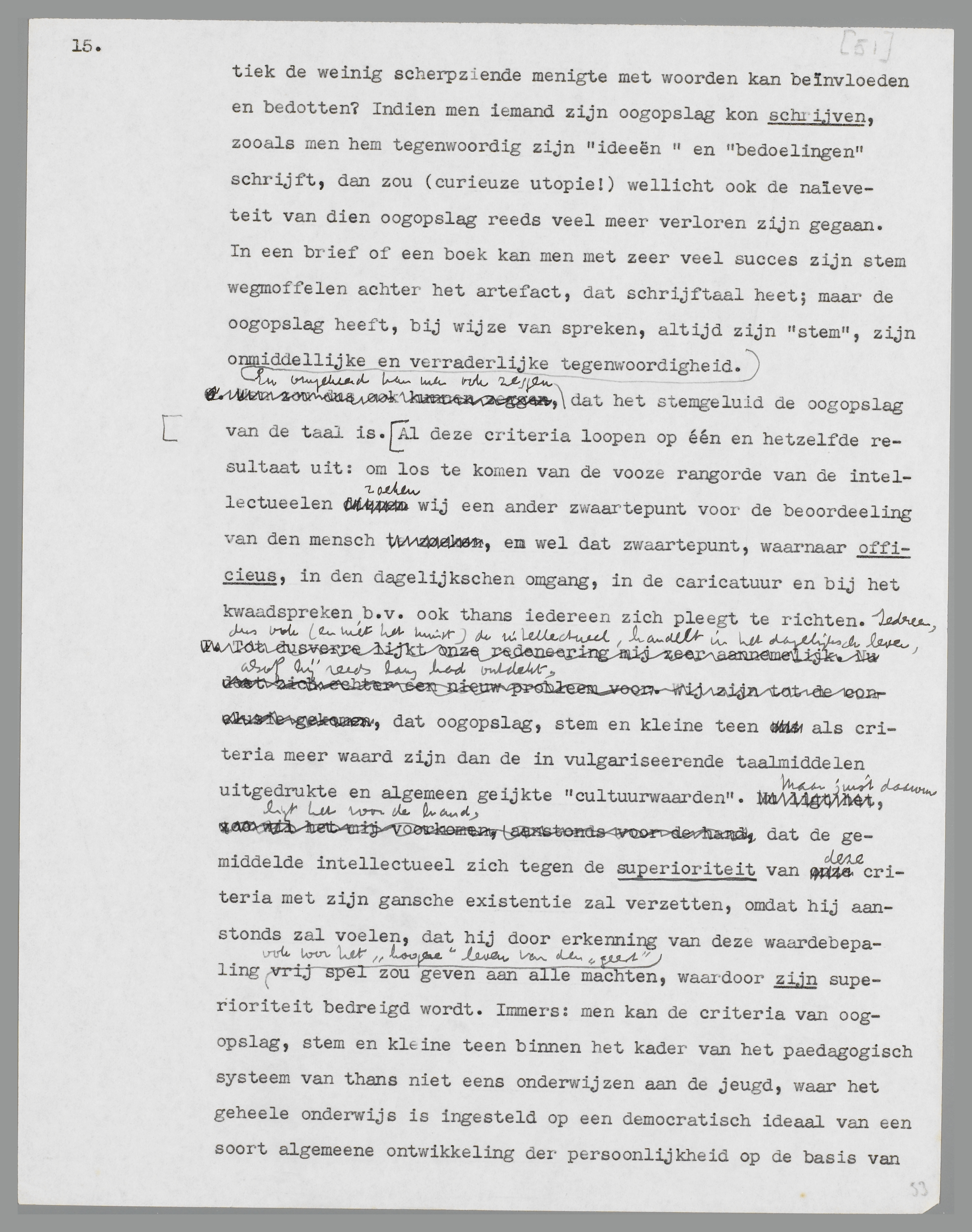 Het gaat hier, uiteraard, niet om een verheerlijking van het oog en den kleinen of grooten teen; ‘an und für sich’ zijn zij niets belangrijker, en in een cultuur van sprekers en schrijvers misschien zelfs minder belangrijk, dan het strottenhoofd. Men zal echter de spraakorganen in hun onschuld terug hebben te vinden via de onschuld van de verwaarloosde andere organen, die de intellectueelen-hiërarchie met haar armzalige voorkeur voor het taalmedium links liet liggen.