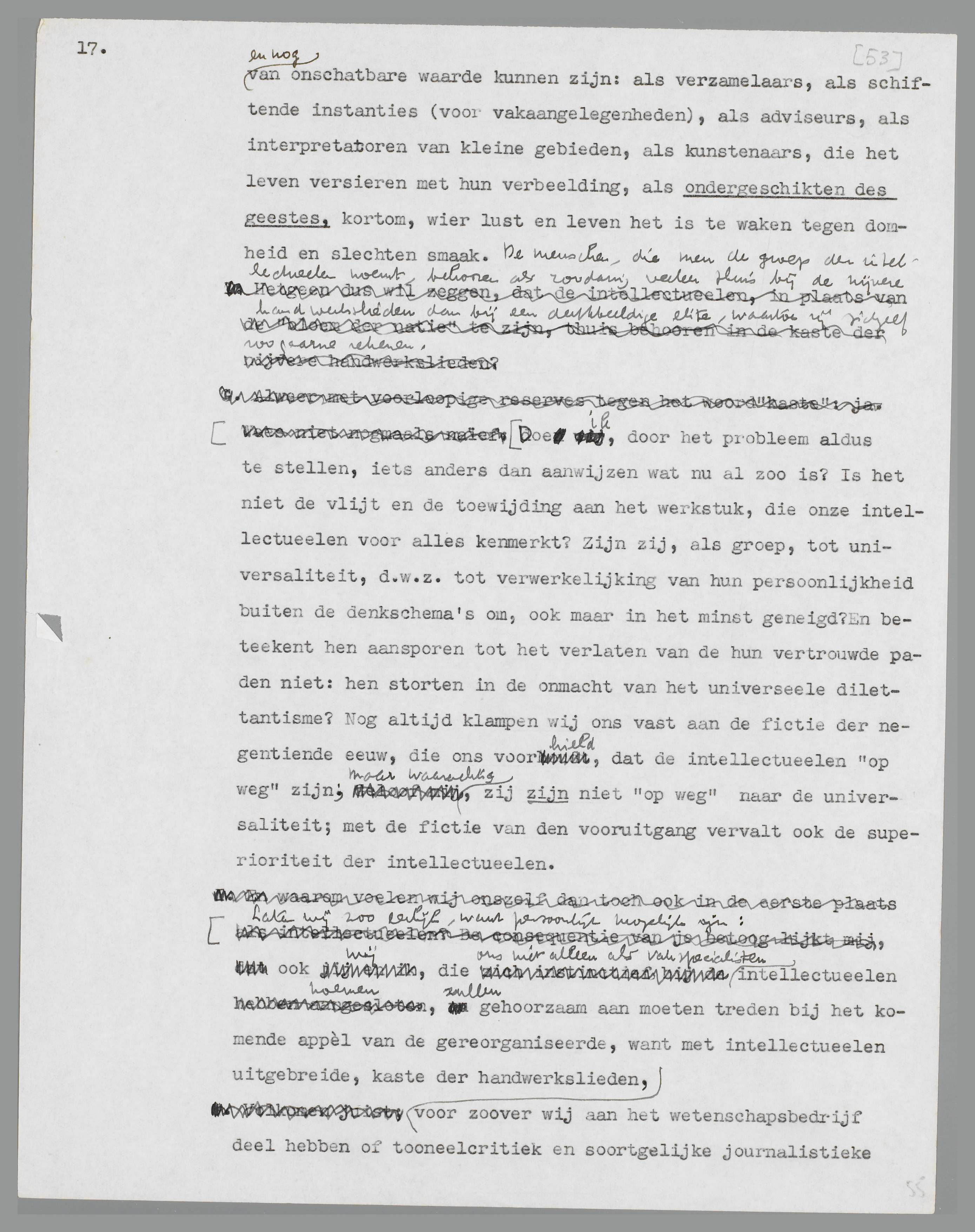 zijn: als verzamelaars, als schiftende instanties voor vakaangelegenheden, als adviseurs, als interpretatoren van kleine gebieden, als kunstenaars, die het bestaan versieren met hun verbeelding, als ondergeschikten des geestes, kortom, wier lust en leven het is te waken tegen domheid en slechten smaak. Zij zijn het in deze door het stelselmatig acteeren van elitehoudingen bedorven groep, die tevens begrepen hebben, dat men de domheid en den slechten smaak niet behoeft te verheerlijken, wanneer men zich, voor zoover men zich intellectueel voelt, aansluit bij de handwerkslieden; en wie, die werkelijk iets van wetenschappelijke verantwoordelijkheid of kunstenaarstoewijding in zich heeft, heeft zich geen handwerksman gevoeld? Zijn het niet de vlijt en de toewijding aan het werkstuk, die den echten intellectueel kenmerken tegenover den valschen, den dilettant, wiens lust en leven het is in de houding van het genie te poseeren? Zijn de intellectueelen, als groep, tot universaliteit, tot verwerkelijking van hun persoonlijkheid buiten de denkschema's van het vak om, ook maar in het minst voorbeschikt? En beteekent hen aansporen tot het verloochenen van het handwerkerschap niet: hen storten in de onmacht van het universeele dilettantisme? Nog altijd klampt men zich vast aan de fictie der negentiende eeuw, die de intellectueelen als ‘stootbrigade’ der cultuur en ‘op weg’ zag, als speciale dragers van een ideaal van menschelijke waardigheid. Vergeefs! Met de fictie vervalt ook hun klasse-superioriteit, de intellectueelen