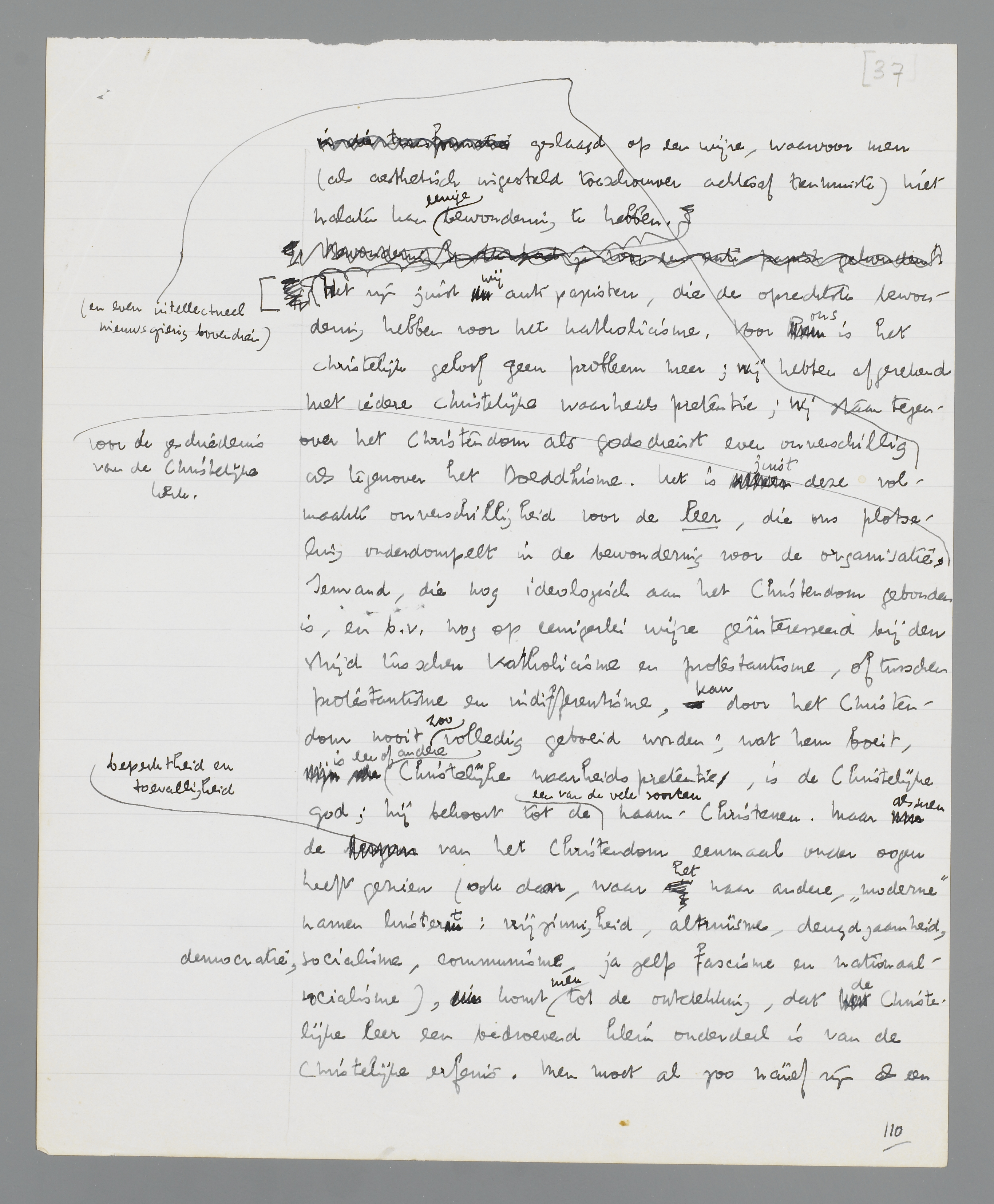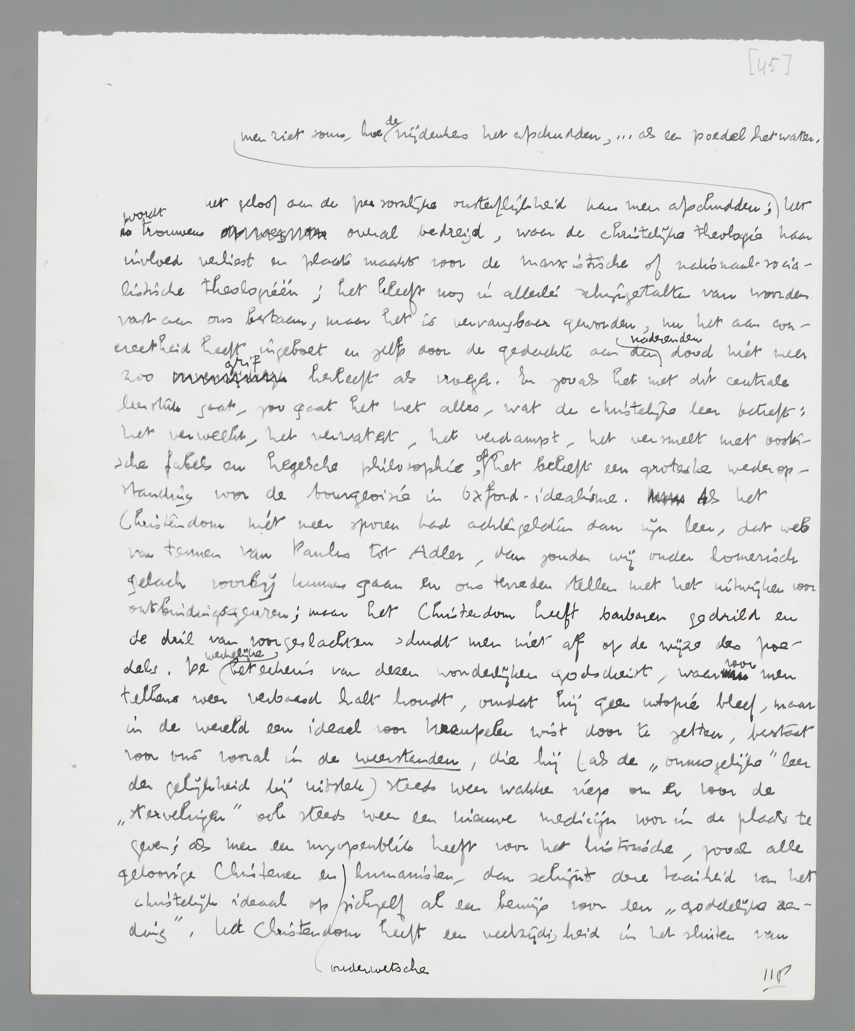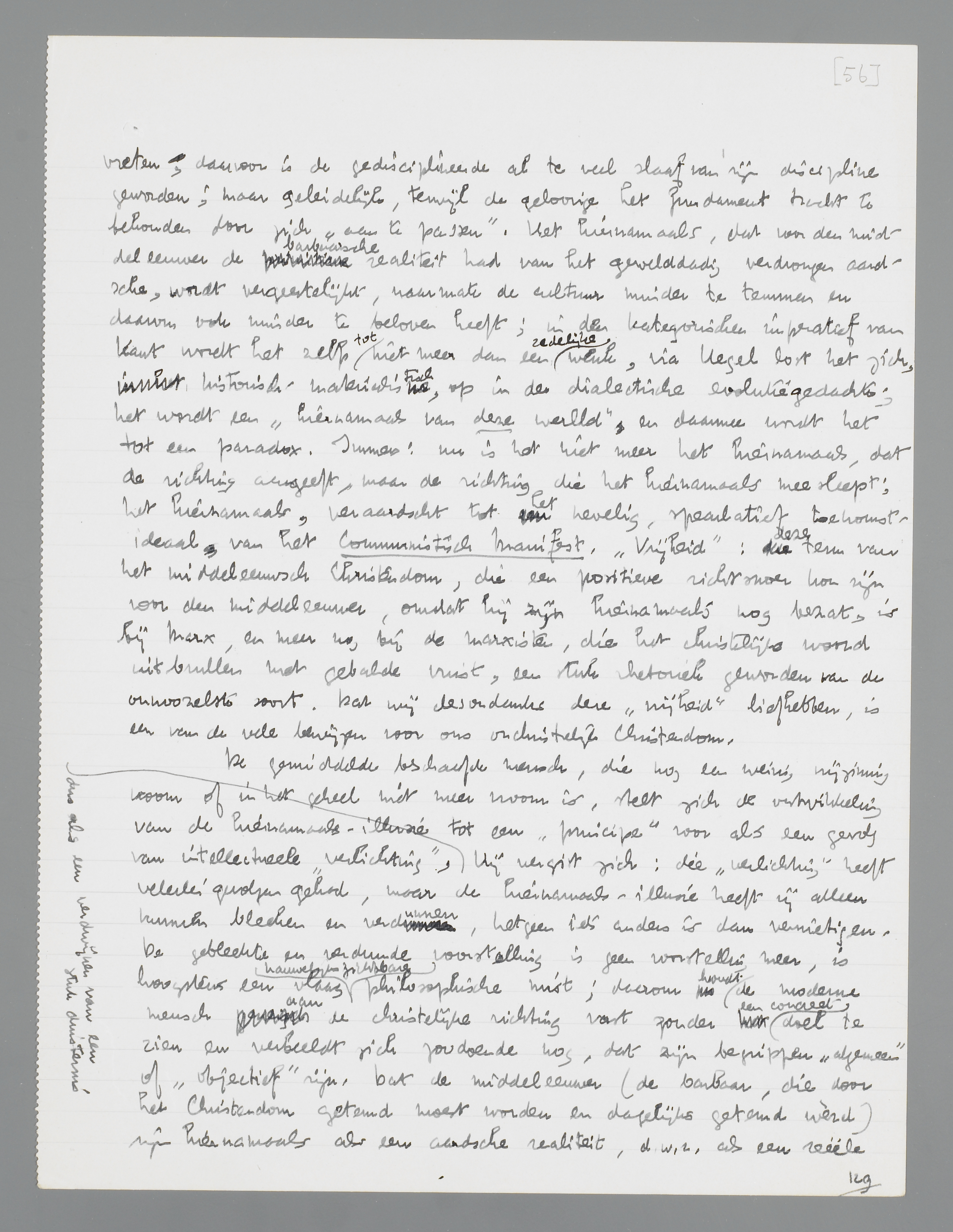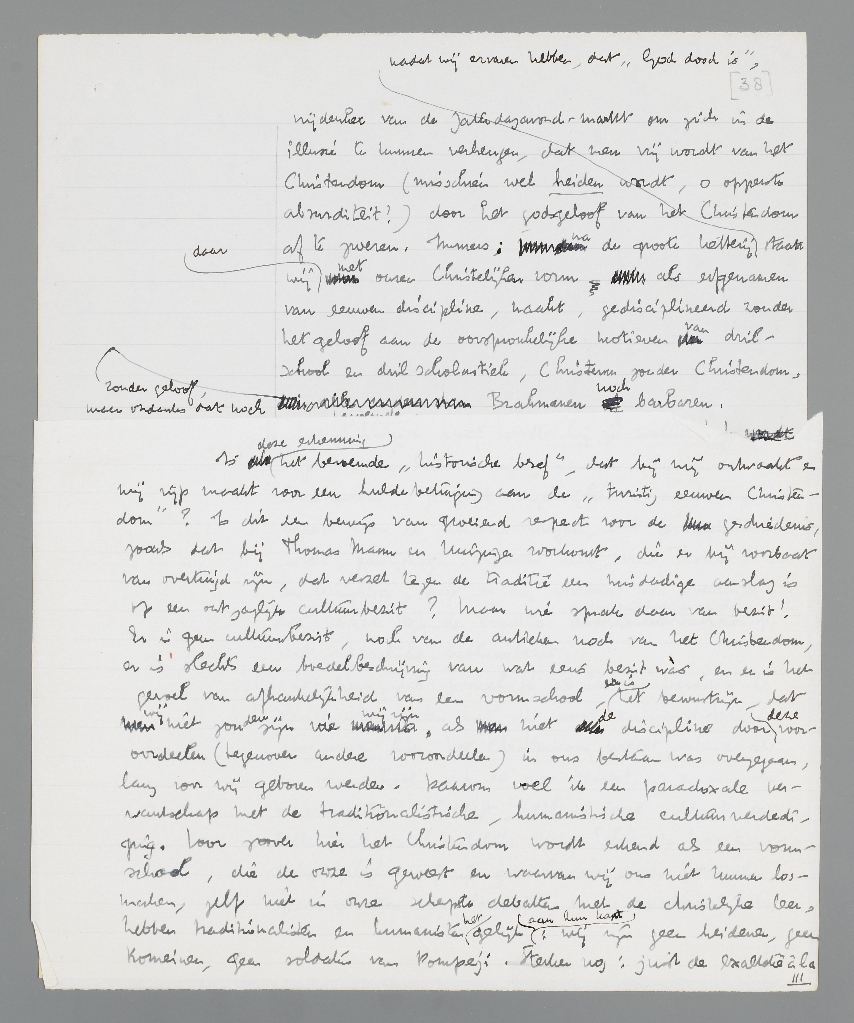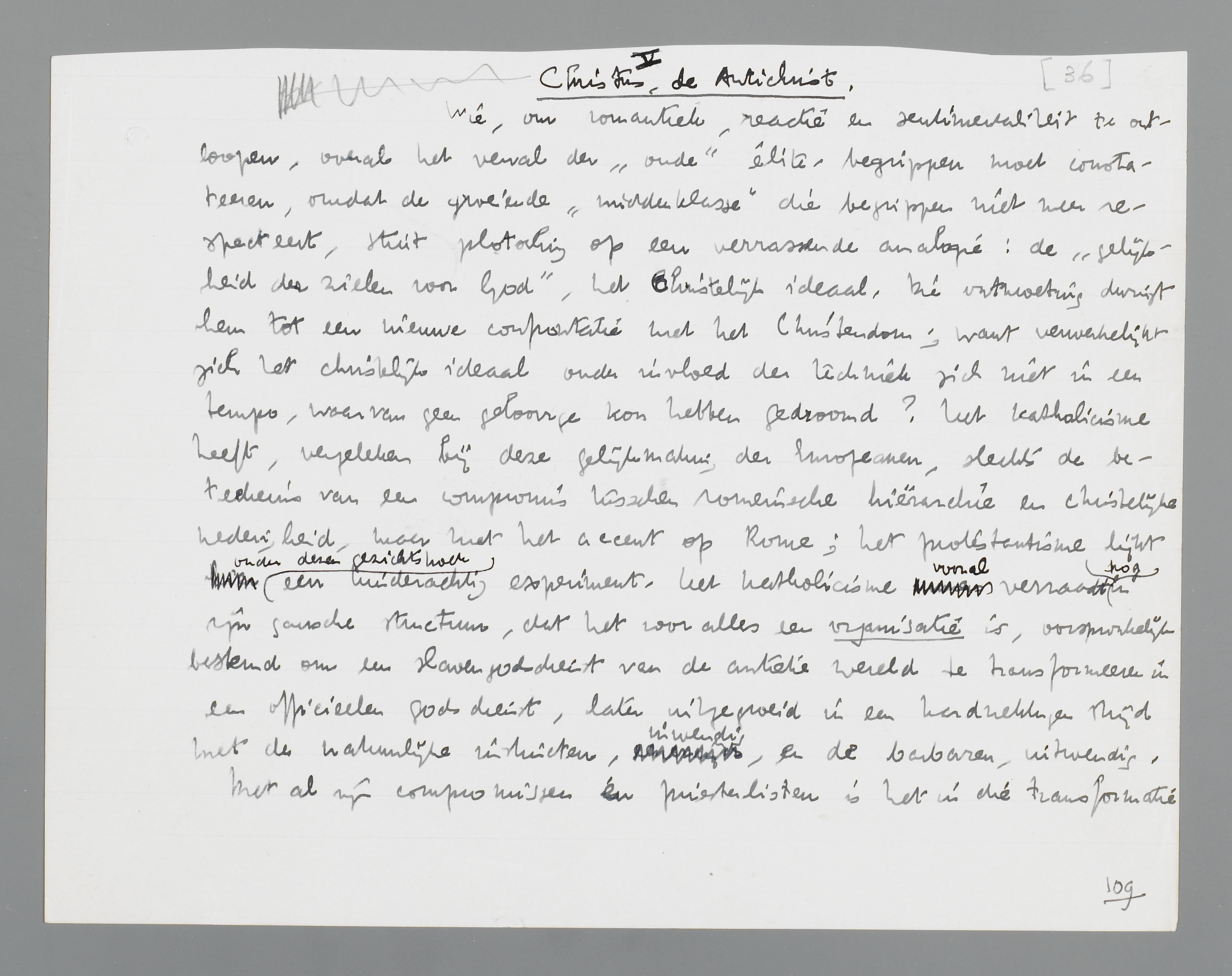 Is deze erkenning het beroemde ‘historische besef’, dat bij mij ontwaakt en mij rijp maakt voor een huldebetuiging aan de ‘twintig eeuwen Christendom’? Is dit een bewijs van groeiend respect voor de geschiedenis, zooals dat bij Thomas Mann en Huizinga voorkomt, die er bij voorbaat van overtuigd zijn, dat verzet tegen de traditie een misdadige aanslag is op een ontzaglijk cultuurbezit? Maar wie sprak daar van bezit? Er is geen cultuurbezit, noch van de antieken noch van het Christendom, er is slechts een boedelbeschrijving van wat eens bezit wàs, en er is het gevoel van afhankelijkheid van een vormschool, er is het bewustzijn, dat wij niet zouden zijn, wie wij zijn, als niet de discipline door deze vooroordeelen (tegenover andere vooroordeelen) in ons bestaan was overgegaan, lang voor wij geboren werden. Daarom voel ik een paradoxale verwant-