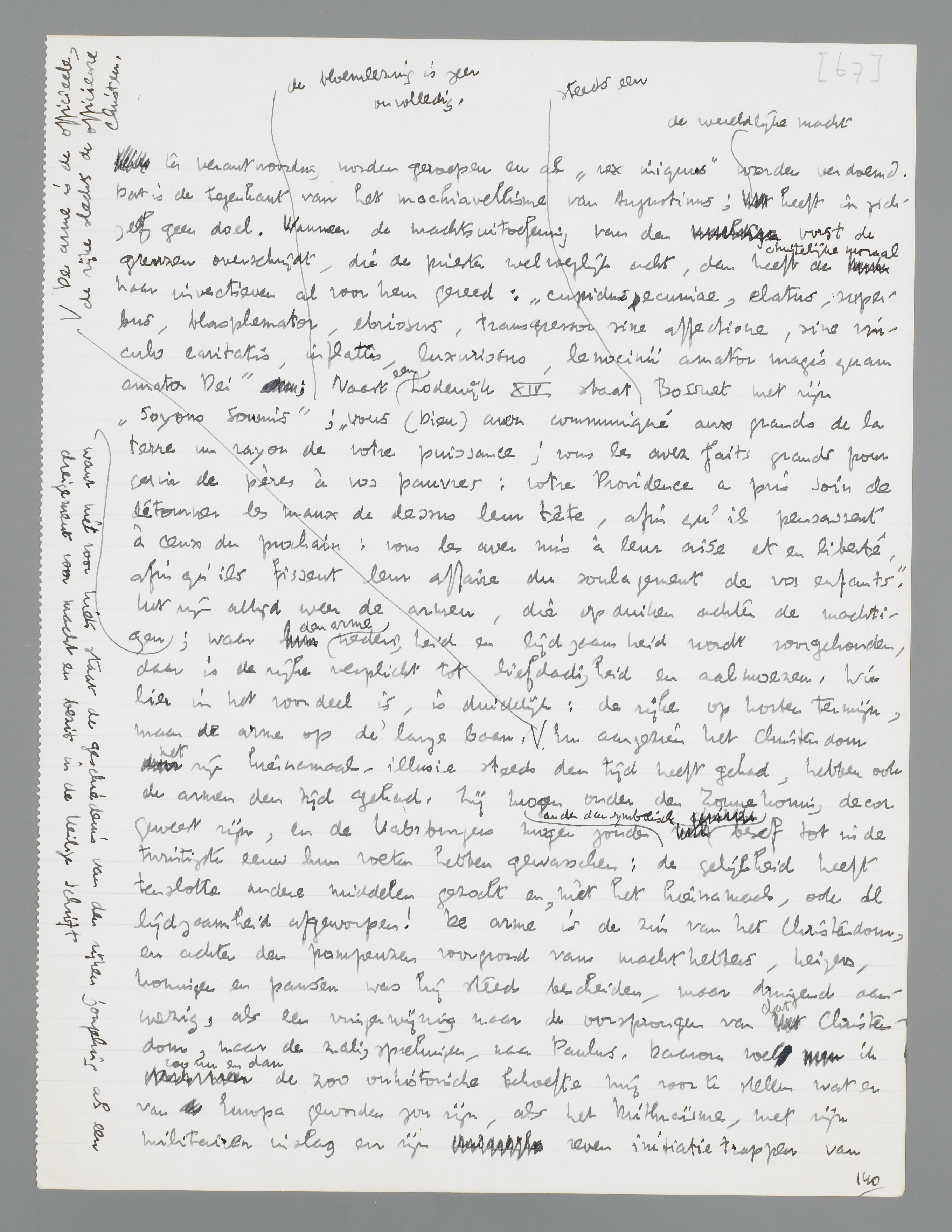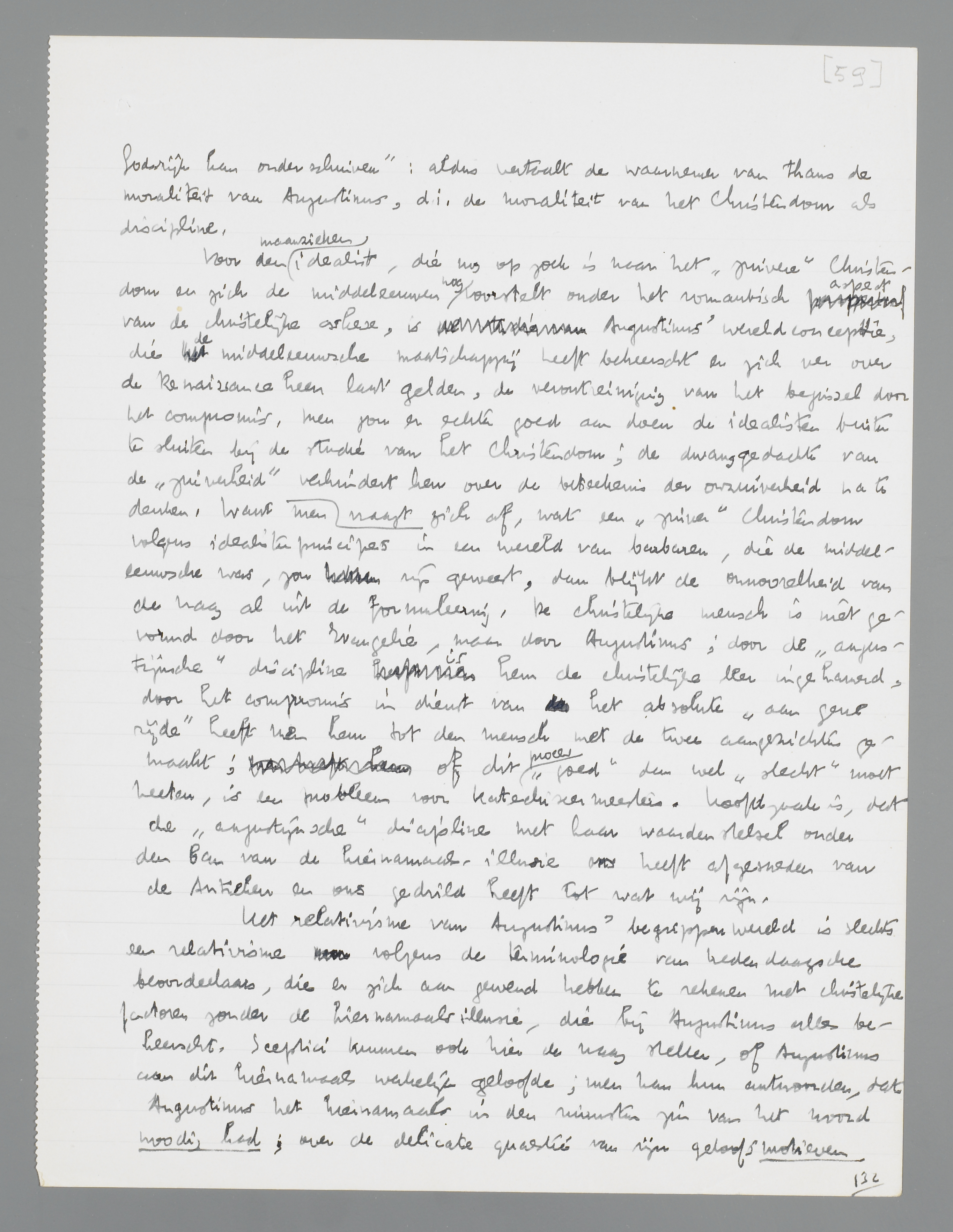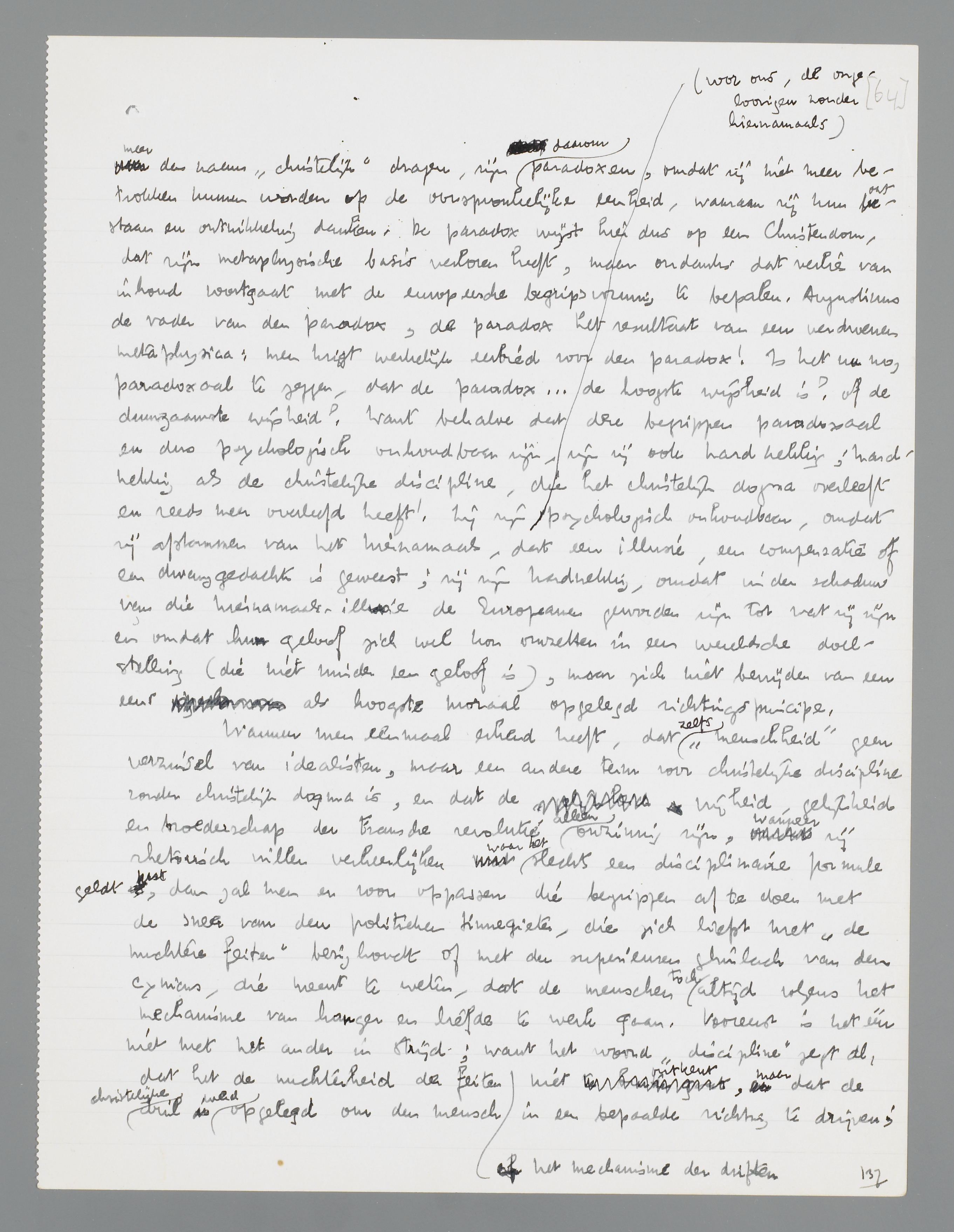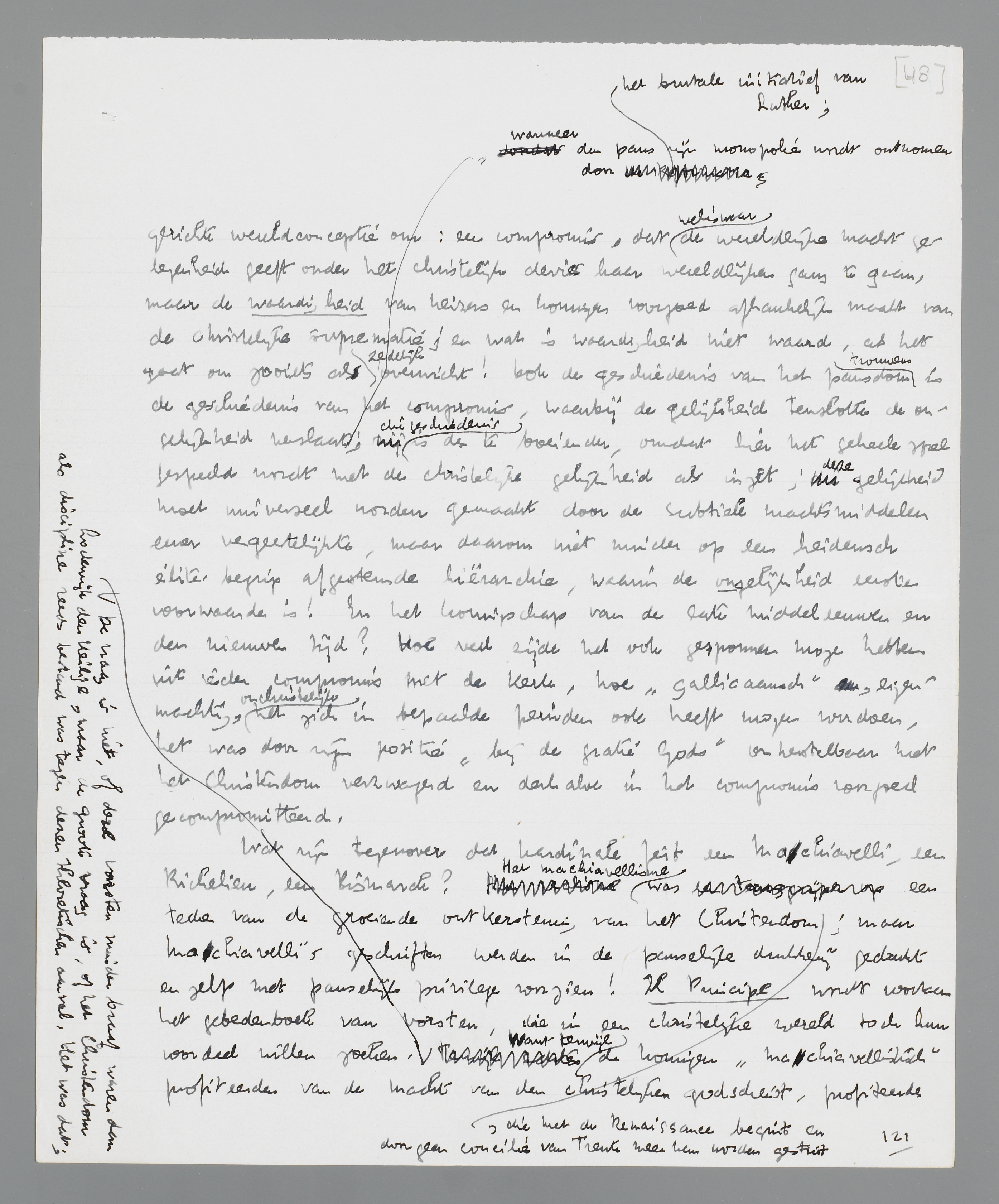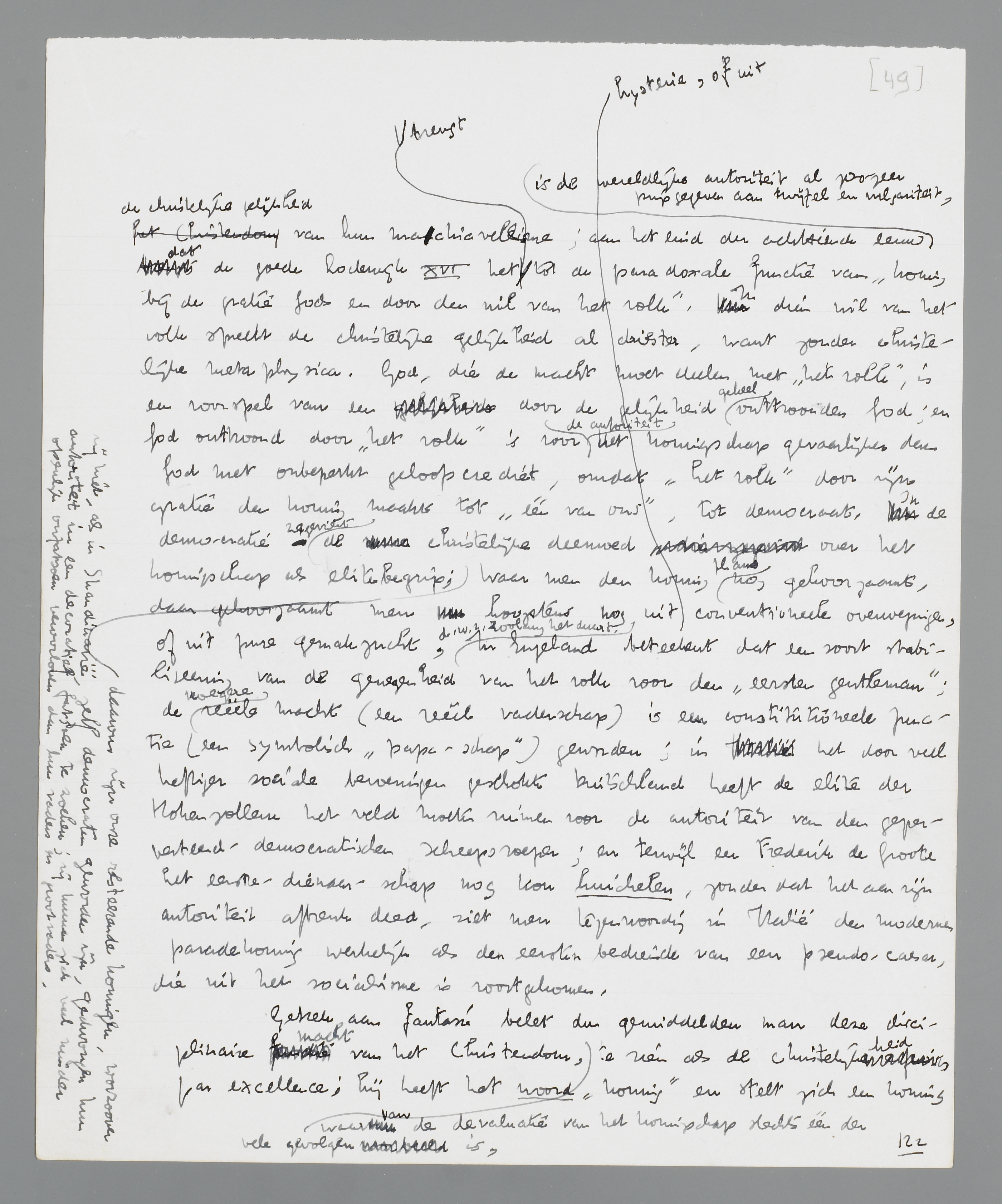 Is deze erkenning het beroemde ‘historische besef’, dat bij mij ontwaakt en mij rijp maakt voor een huldebetuiging aan de ‘twintig eeuwen Christendom’? Is dit een bewijs van groeiend respect voor de geschiedenis, zooals dat bij Thomas Mann en Huizinga voorkomt, die er bij voorbaat van overtuigd zijn, dat verzet tegen de traditie een misdadige aanslag is op een ontzaglijk cultuurbezit? Maar wie sprak daar van bezit? Er is geen cultuurbezit, noch van de antieken noch van het Christendom, er is slechts een boedelbeschrijving van wat eens bezit wàs, en er is het gevoel van afhankelijkheid van een vormschool, er is het bewustzijn, dat wij niet zouden zijn, wie wij zijn, als niet de discipline door deze vooroordeelen (tegenover andere vooroordeelen) in ons bestaan was overgegaan, lang voor wij geboren werden. Daarom voel ik een paradoxale verwant-