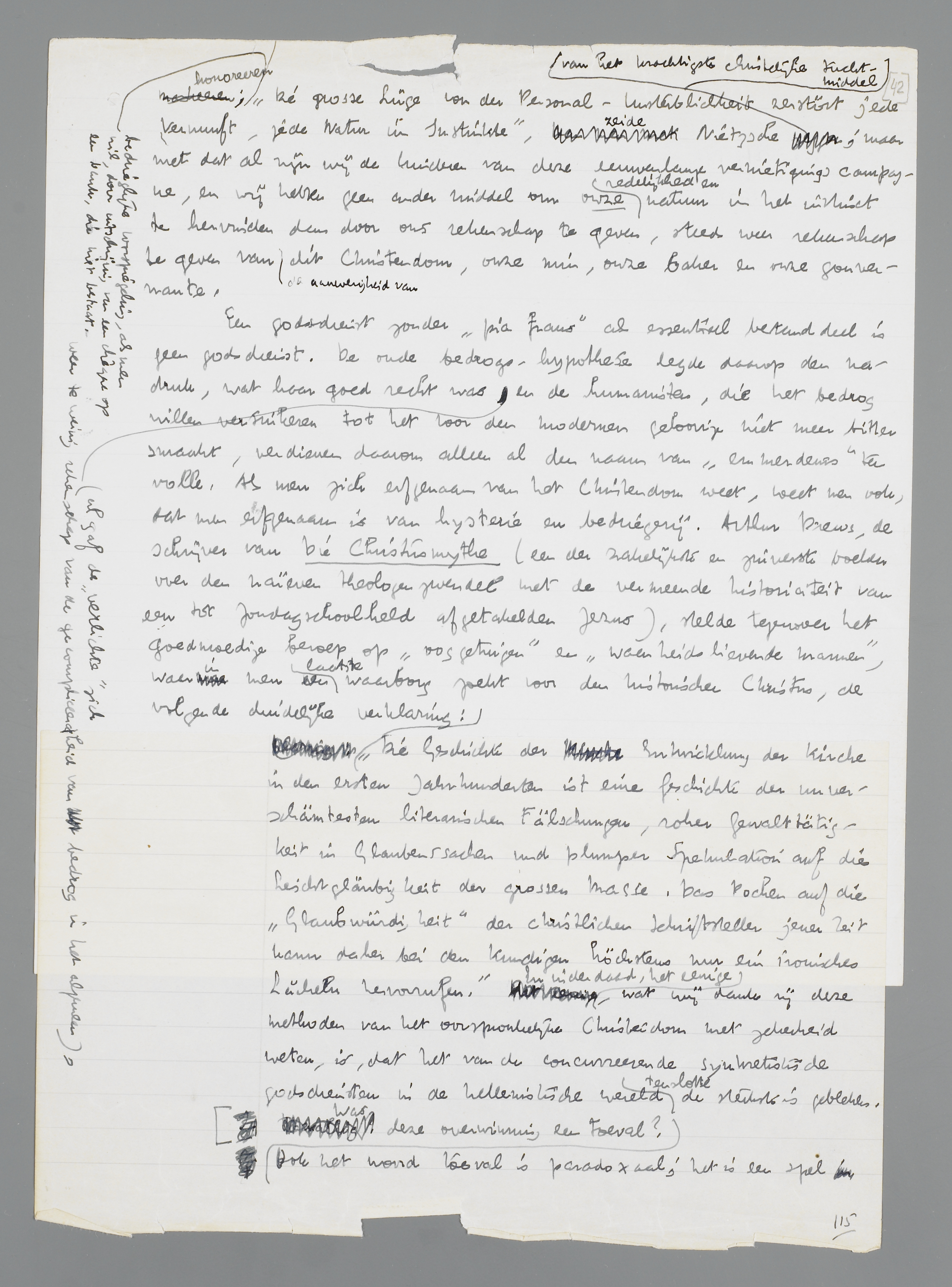 Een godsdienst zonder ‘pia fraus’ als essentieel bestanddeel is geen godsdienst. De oude bedrogshypothese legde daarop den nadruk, wat haar goed recht was (al gaf de ‘verlichte’ zich weer te weinig rekenschap van de gecompliceerdheid van bedrog in het algemeen), en de humanisten, die het bedrog willen versuikeren tot het voor den modernen geloovige niet meer bitter smaakt, verdienen daarom alleen al den naam van ‘emmerdeurs’ ten volle. Als men zich erfgenaam van het Christendom weet, weet men ook, dat men erfgenaam is van hysterie en bedriegerij. Arthur Drews, de schrijver van Die Christusmythe (een der zakelijkste en zuiverste boeken over den naïeven theologenzwendel met de vermeende historiciteit van een tot Zondagsschoolheld afgetakelden Jezus), stelde eens tegenover het goedmoedige beroep dier theologen op ‘ooggetuigen’ en ‘waarheidslievende mannen’, waarin men een laatsten waarborg zocht voor den historischen Christus, de volgende duidelijke verklaring: