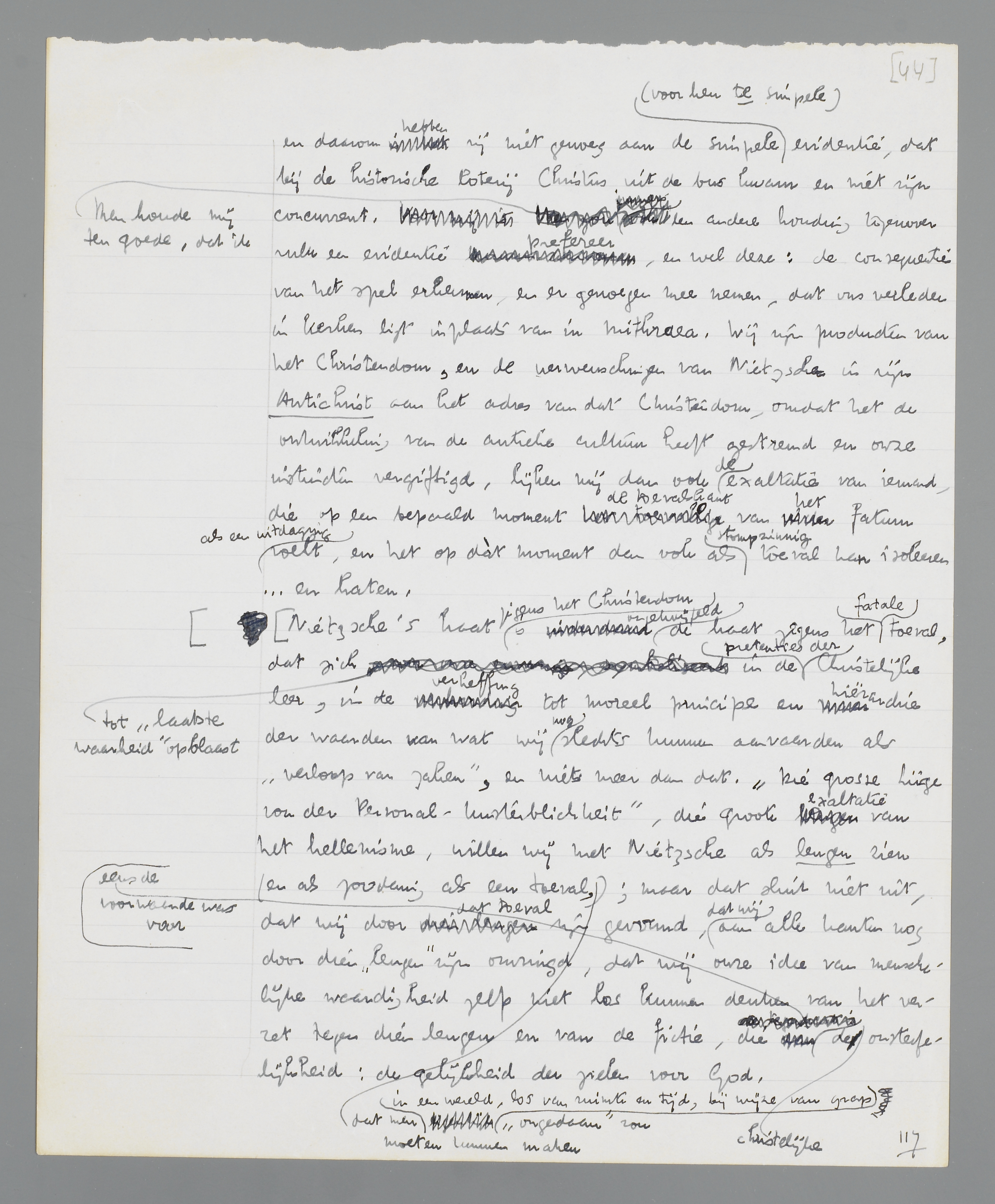 Nietzsche's haat jegens het Christendom is ongetwijfeld de haat jegens het fatale toeval, dat zich tot ‘laatste waarheid’ opblaast in de pretenties der christelijke leer, in de verheffing tot moreel principe en hiërarchie der waarden van wat wij nog slechts kunnen aanvaarden als ‘verloop van zaken’, en niets meer dan dat. ‘Die grosse Lüge von der Personal-Unsterblichkeit’, die groote exaltatie van het hellenisme, willen wij met Nietzsche als leugen zien (en als zoodanig als een toeval, dat men in een wereld, los van ruimte en tijd, bij wijze van grap ‘ongedaan’ zou moeten kunnen maken); maar dat sluit niet uit, dat wij door dat toeval zijn gevormd, dat wij aan alle kanten nog door dien ‘leugen’ zijn omringd, dat wij onze idee van menschelijke waardigheid zelfs niet los kunnen denken van onze ontmoeting met dien leugen en met de fictie, die eens de voorwaarde was voor de christelijke onsterfelijkheid: de gelijkheid der zielen voor God.