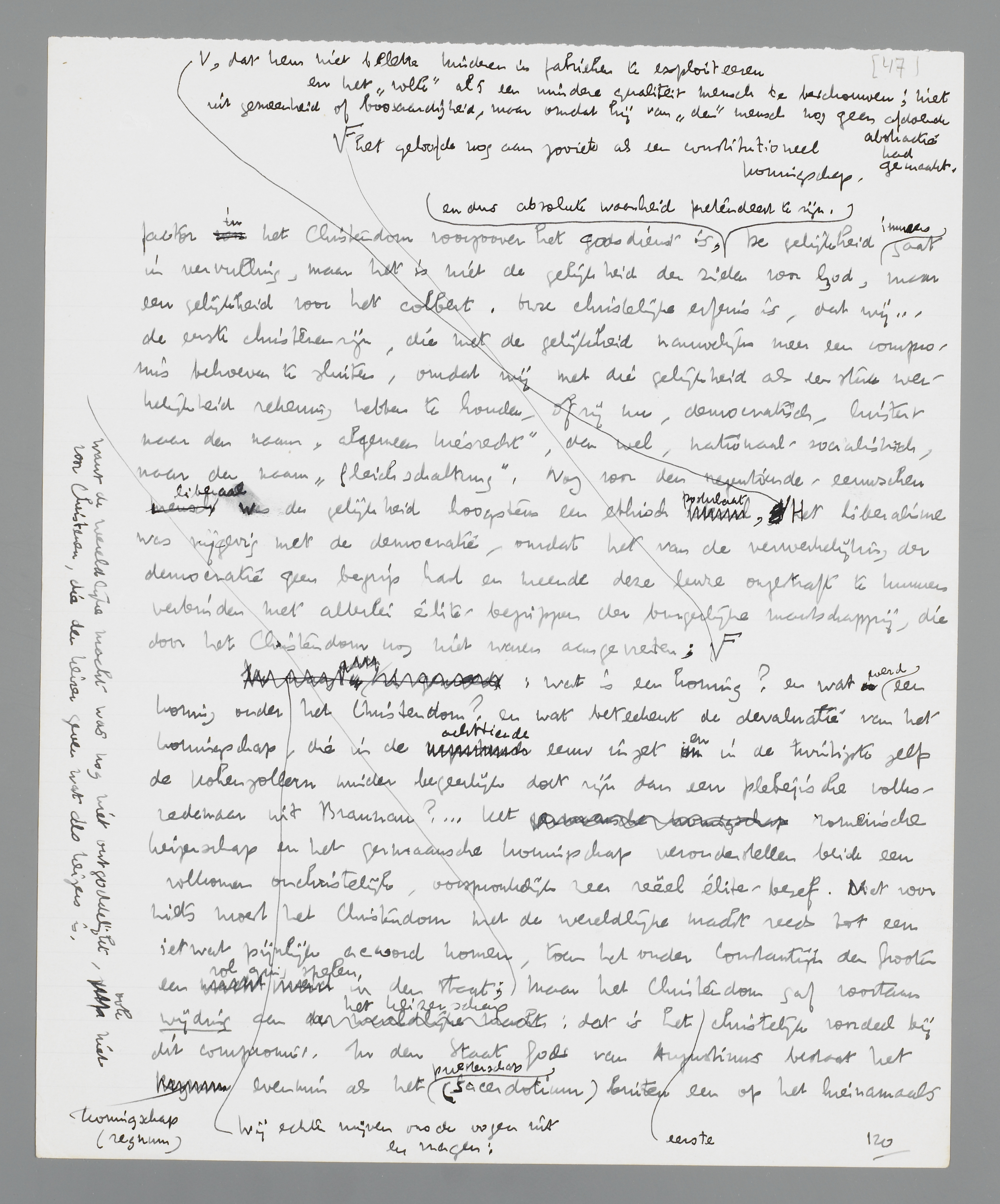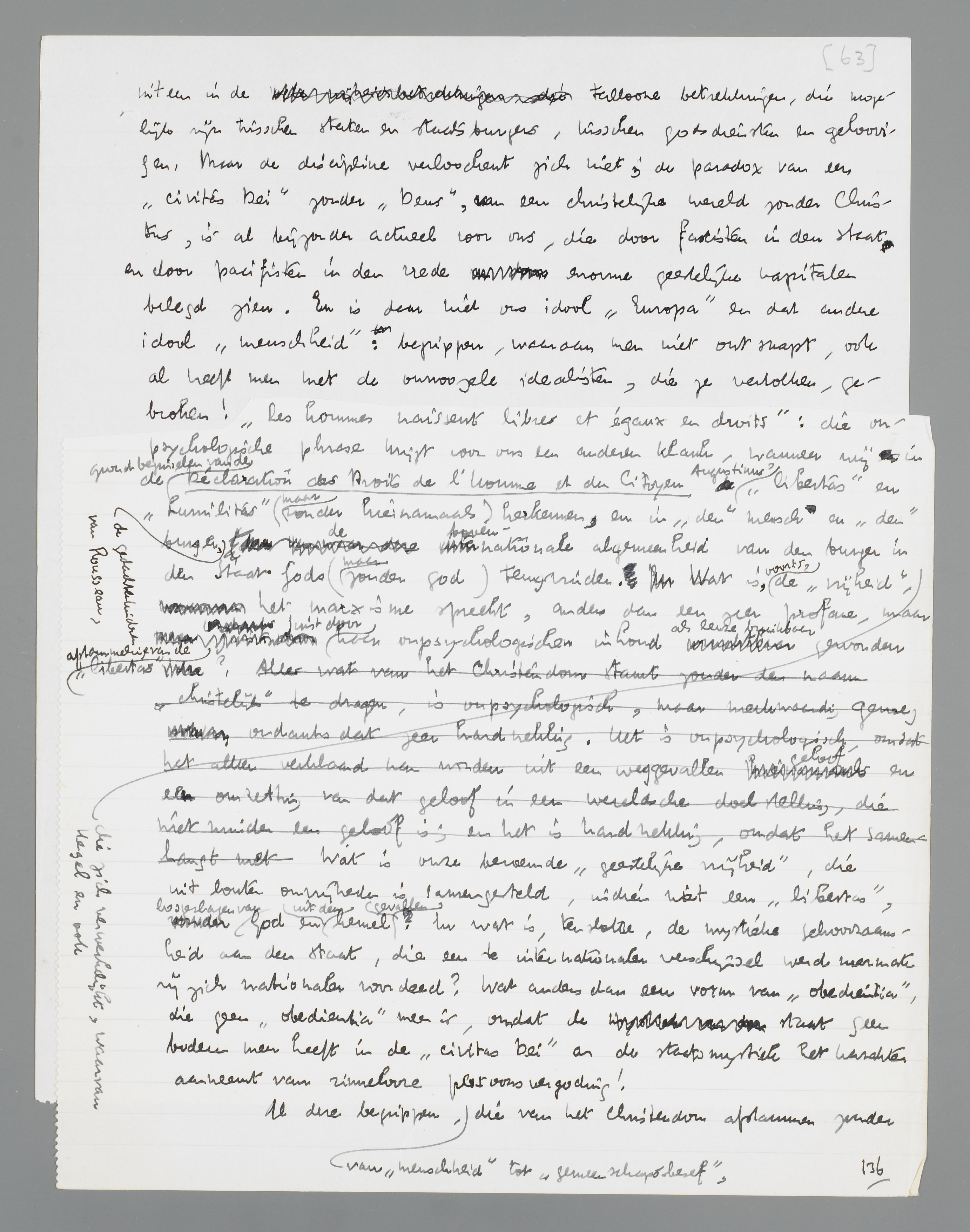 Het gansche arsenaal van onsamenhangende en zoogenaamd onpsychologische begrippen, waarvan het democratische Europa is vervuld, met name van die begrippen als ‘gerechtigheid’ en ‘vrijheid’, waarmee de idealisten zich in hun ledige uren bezighouden en waarvan de politieke realisten of tinnegieters vol afgrijzen verkondigen, dat zij in het rijk der illusies thuis hooren, is een arsenaal van de christelijke discipline, die door Augustinus in de architectuur van De Civitate Dei tot een maatschappelijk systeem is verwerkt, maar waarvan het fundamenteele beginsel: het hiernamaals, verloren is gegaan. Wie Christendom zegt,