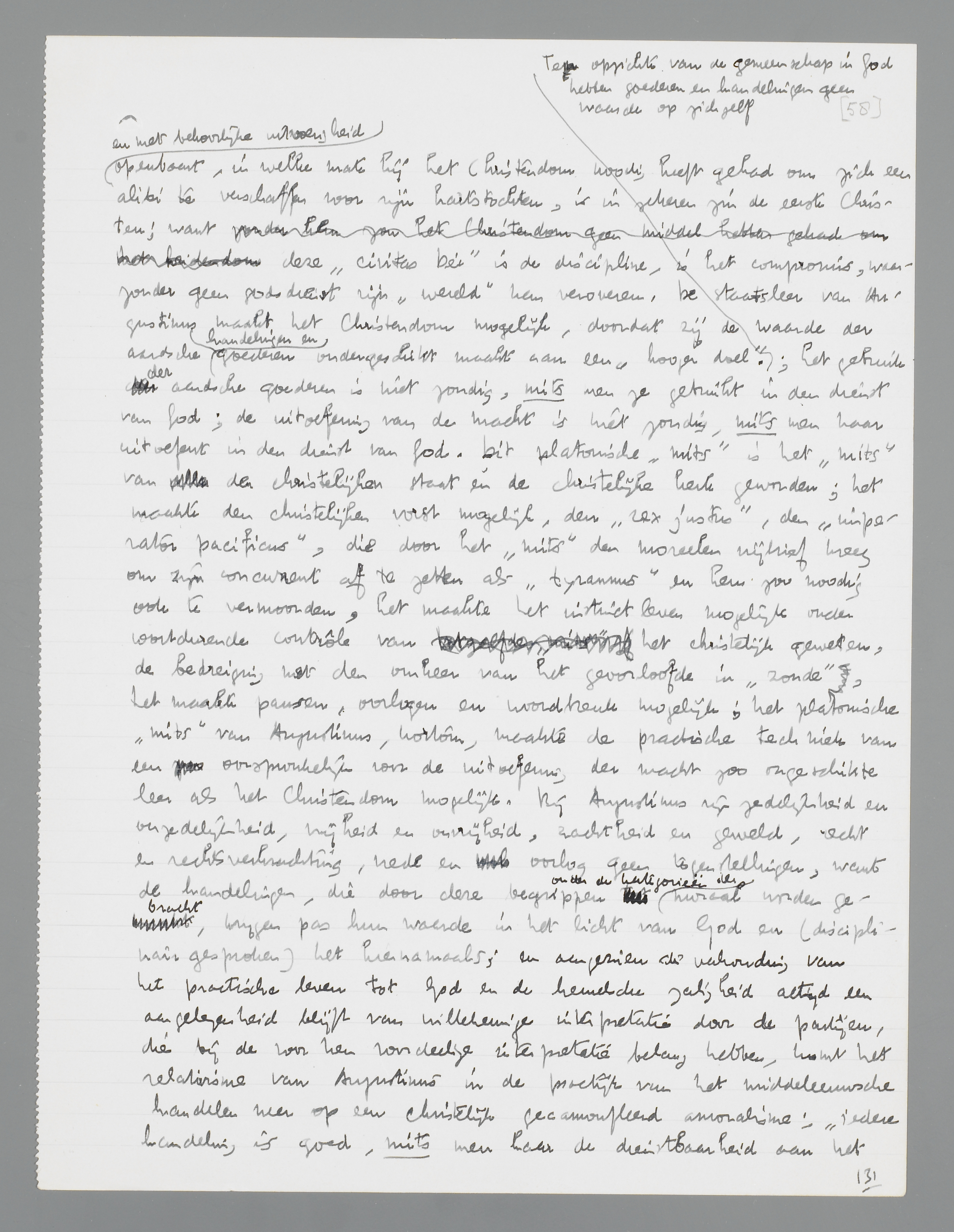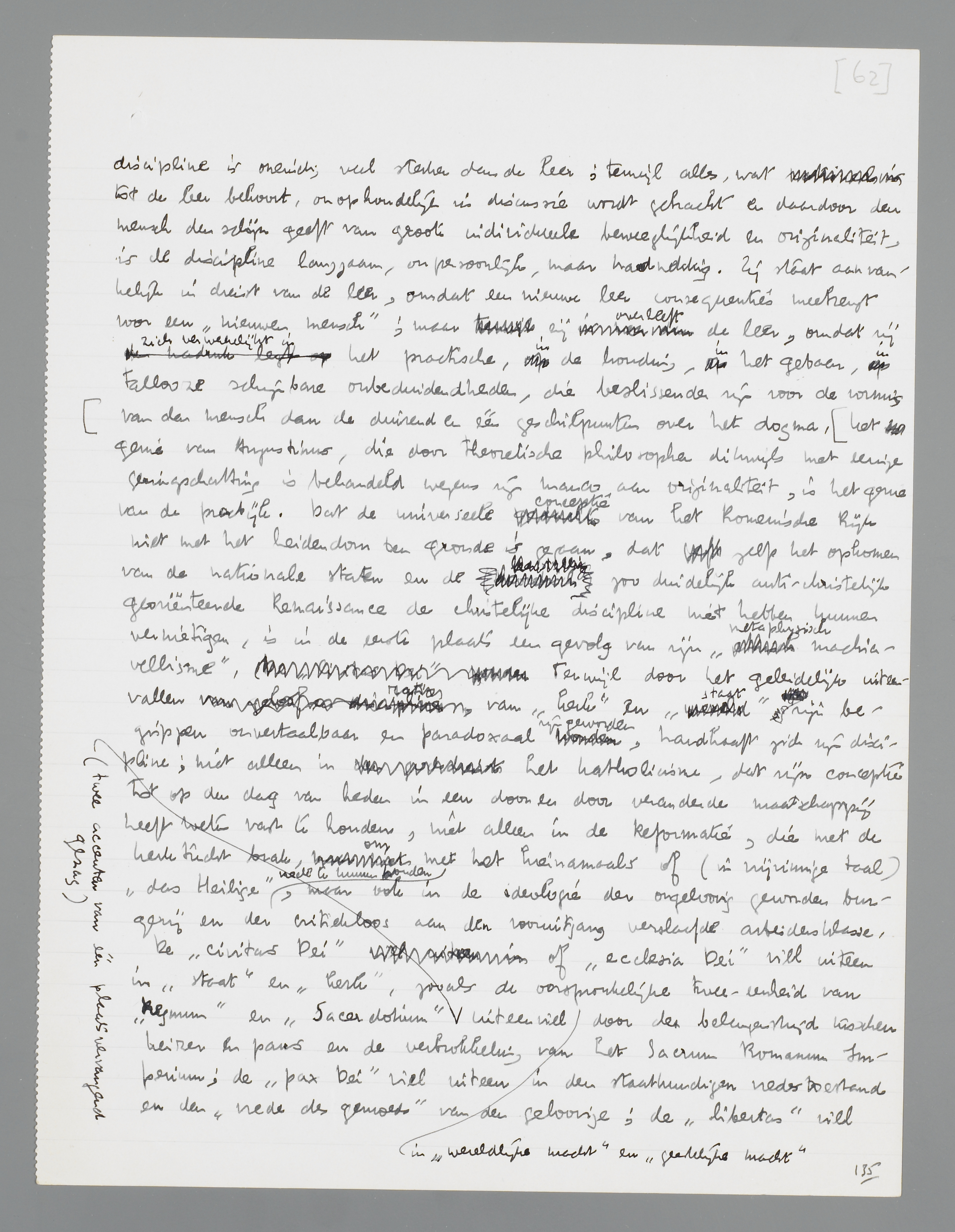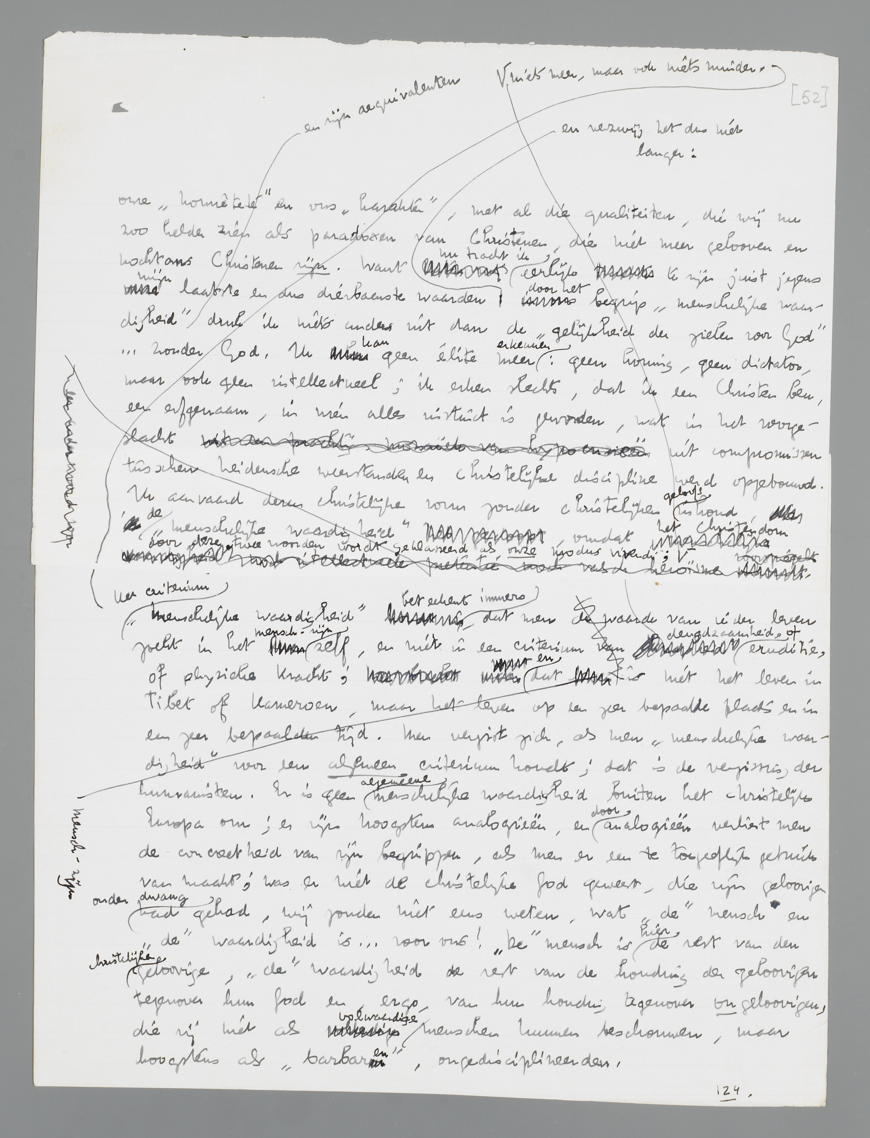 dat zijn ruimheid en absoluutheid ontleent aan zijn christelijke beperktheid en relativiteit. Het is een begrip, dat niet te overschrijden is, omdat het onze christelijke erfenis resumeert; onvereenigbaar met de élite-pretenties van deugd, kennis en macht (het veronderstelt noch den braven, noch den geleerden, noch den bruten mensch als het bij uitstek respectabele wezen), is het alleen te herleiden tot het christelijk geloof, dat wij niet meer bezitten. En derhalve is ‘menschelijke waardigheid’, het ‘hoogste goed’, tevens het paradoxale begrip bij uitstek; want hoe kan een bezit, dat wij niet meer bezitten, ons beheerschen? Niemand kan op die vraag antwoorden, zonder zijn rekening met het Christendom te hebben vereffend.