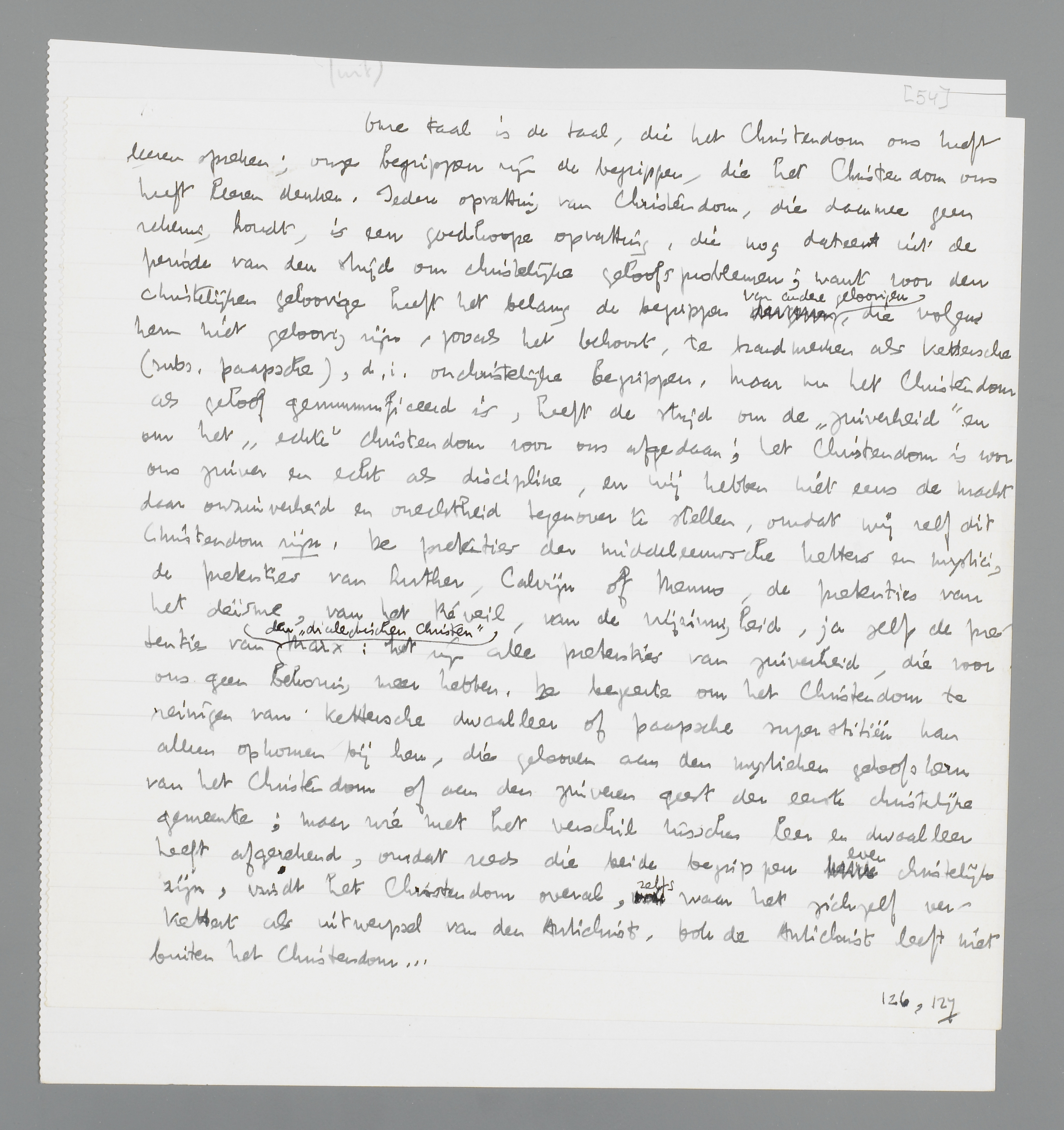 is voor ons zuiver en echt als discipline, en wij hebben niet eens de macht daar onzuiverheid en onechtheid tegenover te stellen, omdat wij zelf dit Christendom zijn. De pretenties der middeleeuwsche ketters en mystici, de pretenties van Luther, Calvijn of Menno, de pretenties van het deïsme, van het Réveil, van de vrijzinnigheid, ja zelfs de pretenties van den ‘dialectischen Christen’ Marx: het zijn alle pretenties van zuiverheid, die voor ons geen bekoring meer hebben. De begeerte om het Christendom te reinigen van kettersche dwaalleer of paapsche superstitiën kan alleen opkomen bij hen, die aanspraak maken op de mystieke geloofskern van het Christendom of op den zuiveren geest der eerste christelijke gemeente; maar wie met het verschil tusschen leer en dwaalleer heeft afgerekend, omdat reeds die beide begrippen even christelijk zijn, vindt het christendom overal, zelfs waar het zichzelf verkettert als uitwerpsel van den Antichrist. Ook de Antichrist leeft niet buiten het Christendom...