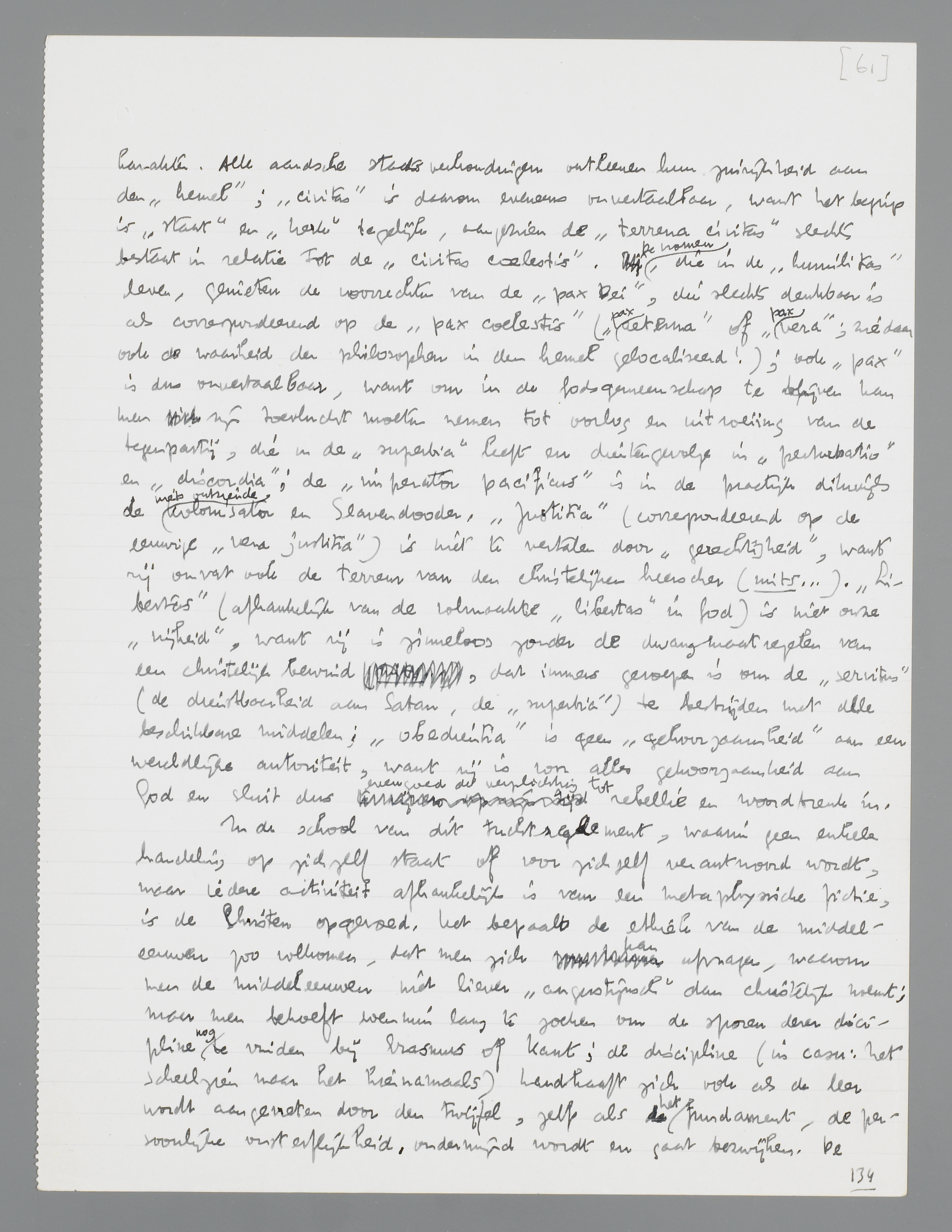 (‘pax aeterna’ of ‘pax vera’: ziedaar ook de Waarheid der philosophen in den hemel gelocaliseerd!); ‘pax’ is dus wederom onvertaalbaar, want het getuigt van een harmonie, waaruit de hemel niet is weg te denken. Om in de Godsgemeenschap te blijven kan men zijn toevlucht moeten nemen tot oorlog en uitroeiing van de tegenpartij, die in de ‘superbia’ leeft en dientengevolge in ‘perturbatio’ en ‘discordia’; de ‘imperator pacificus’ is in de practijk dikwijls de niets ontziende kolonisator en Slavendooder, de man van dezen christelijken ‘vrede’ is qua talis de man die zijn heele bestaan met vechten tegen de ongeloovigen en ketters doorbrengt. ‘Justitia’ (correspondeerend op de eeuwige ‘vera justitia’) is niet te vertalen door ‘gerechtigheid’, want zij omvat ook de terreur van den christelijken heerscher (mits...). ‘Libertas’ (afhankelijk van de volmaakte ‘libertas’ in God) is geen aardsche ‘vrijheid’, want zij is zinneloos zonder de dwangmaatregelen van een christelijk bewind, dat immers geroepen is om de ‘servitus’ (de dienstbaarheid aan Satan, de ‘superbia’) te bestrijden met alle beschikbare middelen en de opstandingen tegen God te tuchtigen; ‘obedientia’ is dus evenmin ‘gehoorzaamheid’ aan een wereldlijke autoriteit, want zij is voor alles gehoorzaamheid aan God en sluit evengoed de verplichting tot rebellie en woordbreuk in, wanneer die autoriteit de gehoorzaamheid aan God wil afschudden.