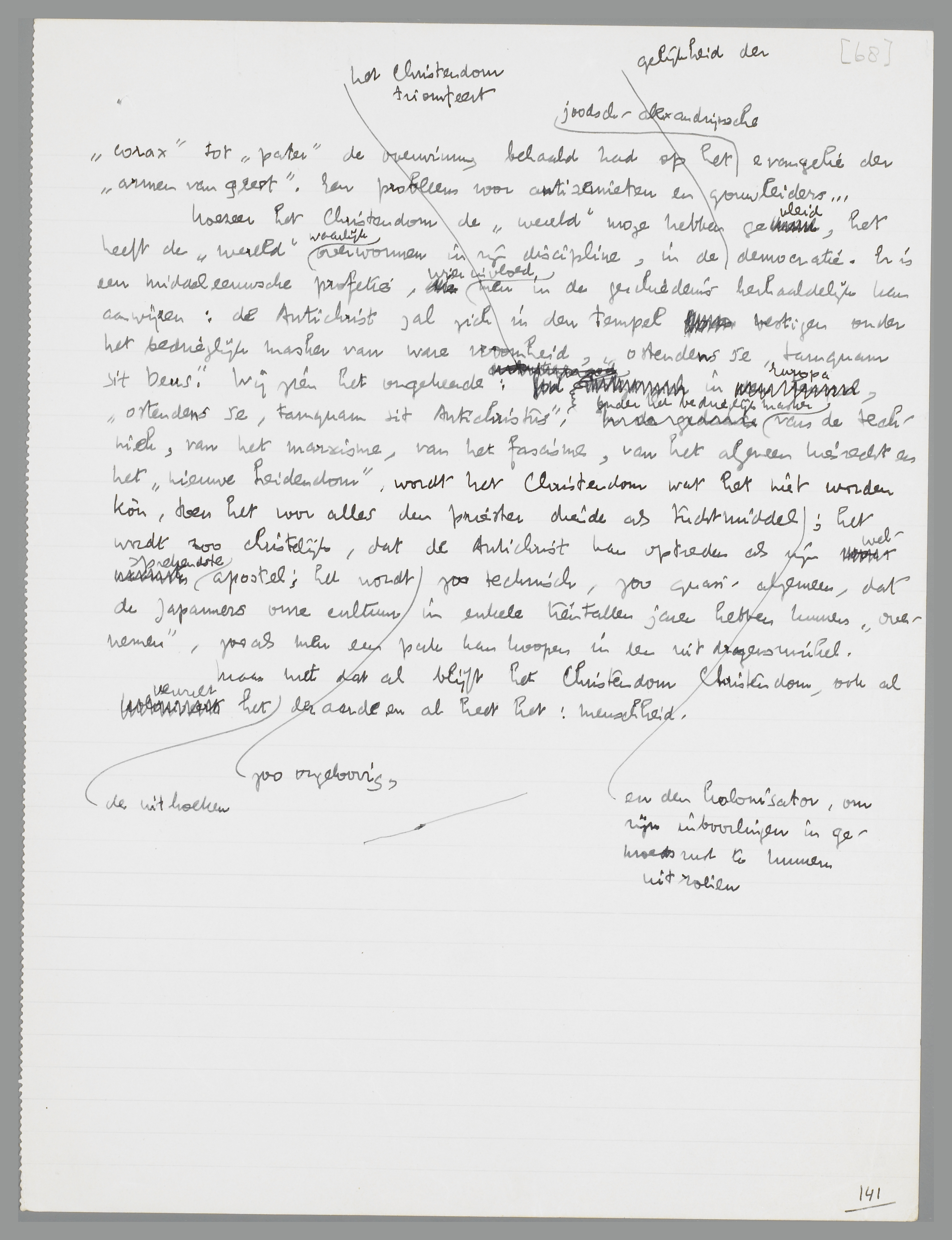Tegenover deze laatste christelijke gemeente is inderdaad veel hardheid geboden; men zou den humanisten gaarne een woord van Malraux willen voorhouden over de eerste Christenen: ‘Les premiers chrétiens aussi étaient des emmerdeurs, mais ils étaient le sens du monde.’ Dit ‘aussi’ sloeg weliswaar niet op de humanisten, maar op een zeker soort Sowjet-Russen; want van de humanisten kan men met den besten wil niet zeggen, dat zij nog ‘de zin der wereld’ zijn. De humanisten zouden het zelfs niet wagen op een zoo stoutmoedige gedachte te komen, dat ‘emmerdeurs’ kunnen zijn uitverkoren om een wereld haar zin te geven! En toch is een hard woord hier een waar woord; er is geen enkele reden om het oude Christendom te idealiseeren tot wat het niet geweest is. Waarom zouden wij niet erkennen, wat wij thans kunnen erkennen, ‘omdat God dood is’: dat onze cultuur rust op het Christendom, door en door christelijk is tot in haar felste onchristelijkheid.... hoewel wij, de paradoxale Christenen, die zelfs het humanisme hebben afgeworpen, desondanks niets meer uitstaande hebben met de waarheidspretenties van een propagandistischen ‘emmerdeur’ als Paulus, of Augustinus? Het één sluit het andere niet uit, sterker nog: van zijn christelijke erfenis wordt alleen hij zich volledig bewust, die met geen christelijke illusie meer gemeene zaak maakt. Want zelfs die eersterangs-gelukssensatie: zich los te weten