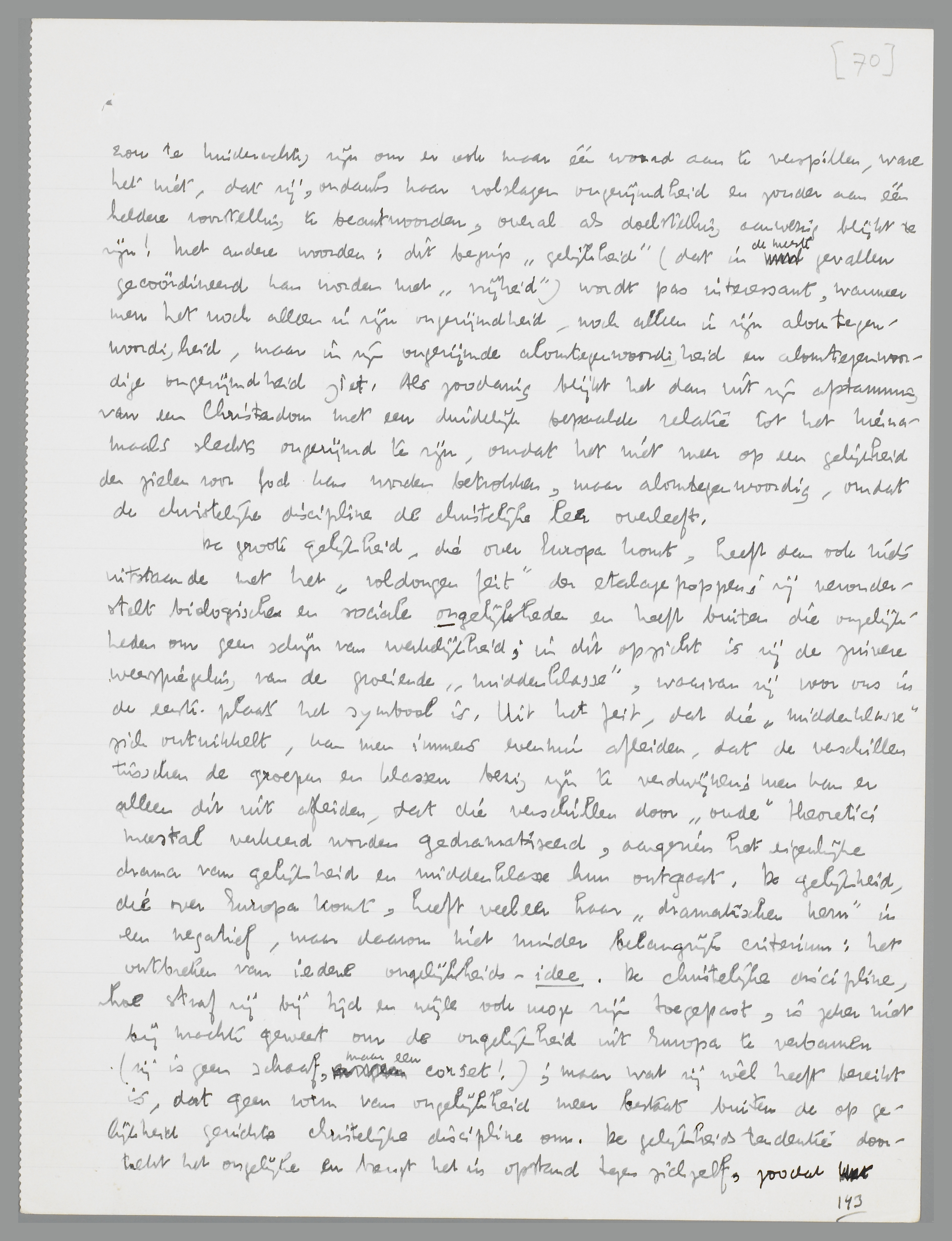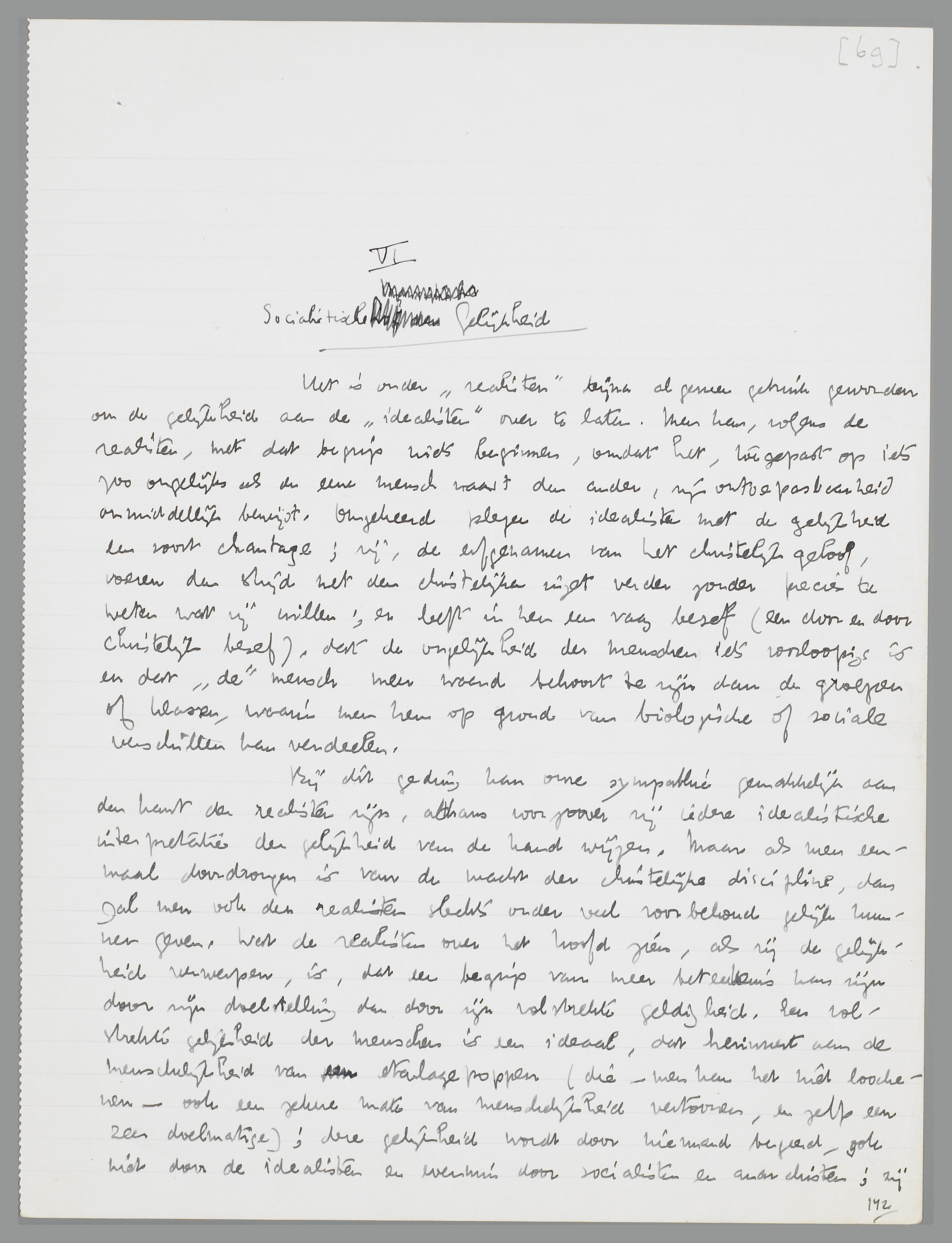 Het is onder ‘realisten’ bijna algemeen gebruik geworden om de gelijkheid aan de ‘idealisten’ over te laten. Men kan, volgens de realisten, met dat begrip niets beginnen, omdat het, toegepast op iets zoo ongelijks als den eenen mensch naast den anderen, zijn ontoepasbaarheid onmiddellijk bewijst. Omgekeerd plegen de idealisten met de gelijkheid een soort chantage; zij, de erfgenamen van het christelijk geloof, voeren den strijd met den christelijken inzet verder zonder precies te weten wat zij willen; er leeft in hen een vaag besef (een door en door christelijk besef), dat de ongelijkheid der menschen iets voorloopigs is en dat ‘de’ mensch meer waard behoort te zijn dan de groepen of klassen, waarin men hen op grond van biologische of sociale verschillen kan verdeelen.