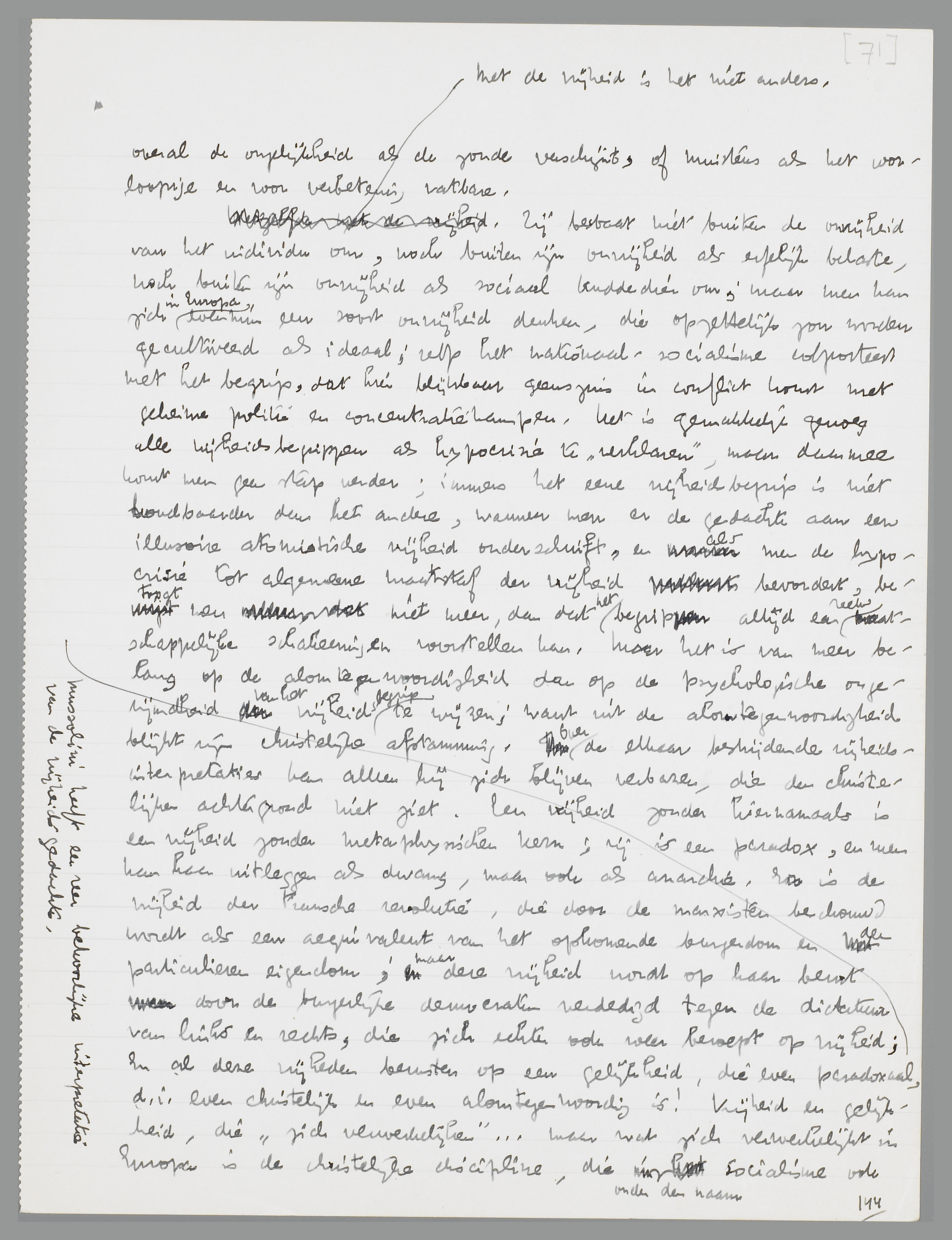 vrijheden berusten op een gelijkheid, die even paradoxaal, d.i. even christelijk en even alomtegenwoordig is! Vrijheid en gelijkheid, die ‘zich verwerkelijken’... maar wat zich verwerkelijkt in Europa is de christelijke discipline, die onder den naam socialisme ook den bourgeois zijn meerderheidsgevoel boven ‘het volk’ (het geïmproviseerde ongelijkheidsprivilege van het geld) nog ontnam, zoodat hij zich zelfs onder de reactie van het nationaal-socialisme laat aandienen als ‘volksgenoot’ en ‘kameraad’.