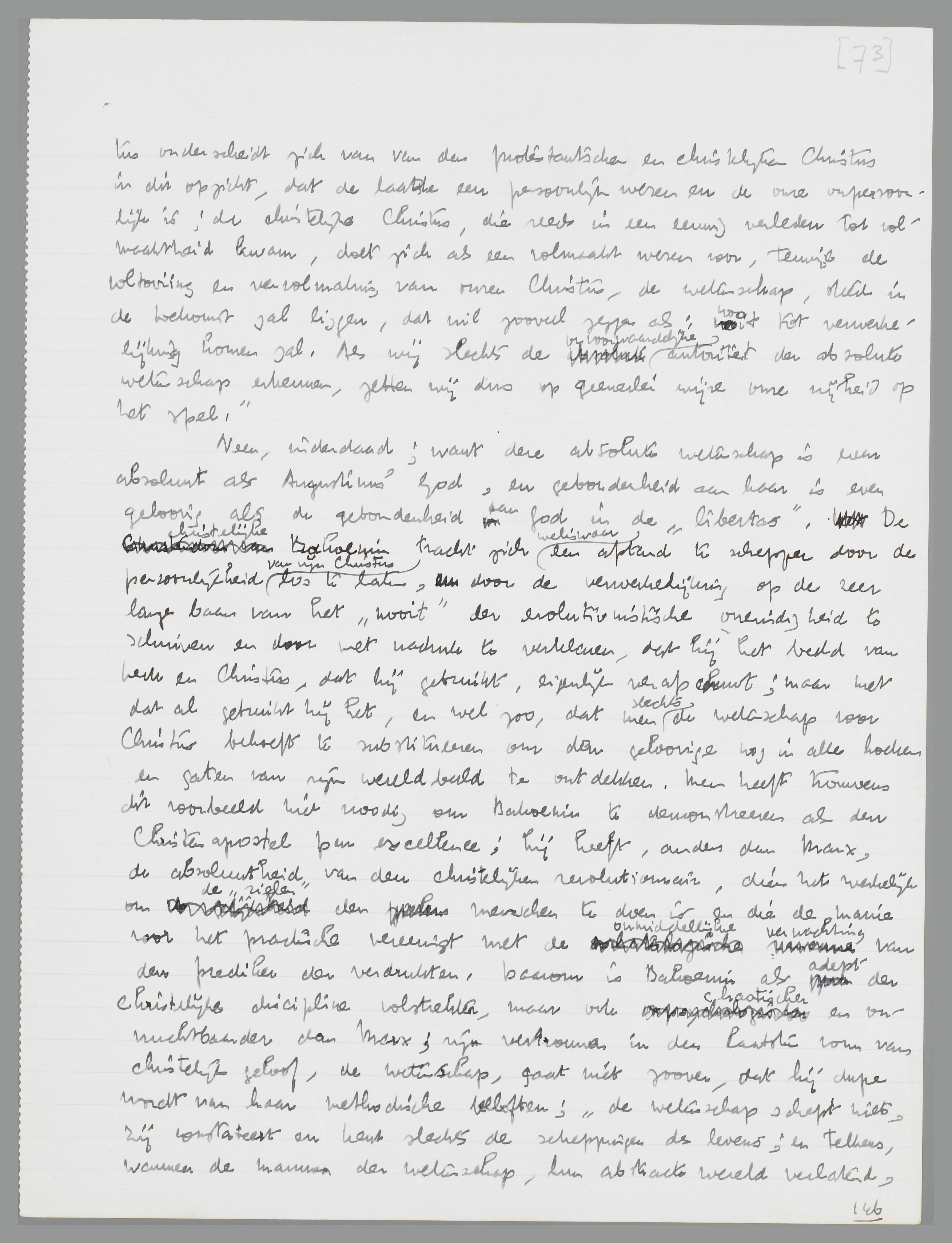 ‘In onze kerk - men sta mij een oogenblik toe dit woord te gebruiken, dat ik overigens verafschuw; beide, kerk en staat, zijn voor mij onverdraaglijk -, in onze kerk, zooals in de protestantsche kerk hebben wij een hoofd, een onzichtbaren Christus, de wetenschap, en zooals de protestanten, zelfs consequenter dan de protestanten, willen wij daarin noch paus, noch concilies, noch vergaderingen van onfeilbare kardinalen, noch bisschoppen en zelfs priesters dulden. Onze Christus onderscheidt zich van den protestantschen en christelijken Christus in dit opzicht, dat de laatste een persoonlijk wezen en de onze onpersoonlijk is; de christelijke Christus, die reeds in een eeuwig verleden tot volmaaktheid kwam, doet zich als een volmaakt wezen voor, terwijl de voltooiing en vervolmaking van onzen Christus, de wetenschap, steeds in de toekomst zal liggen, dat wil zooveel zeggen als: nooit tot verwerkelijking komen zal. Als wij slechts de onvoorwaardelijke autoriteit der absolute wetenschap erkennen, zetten