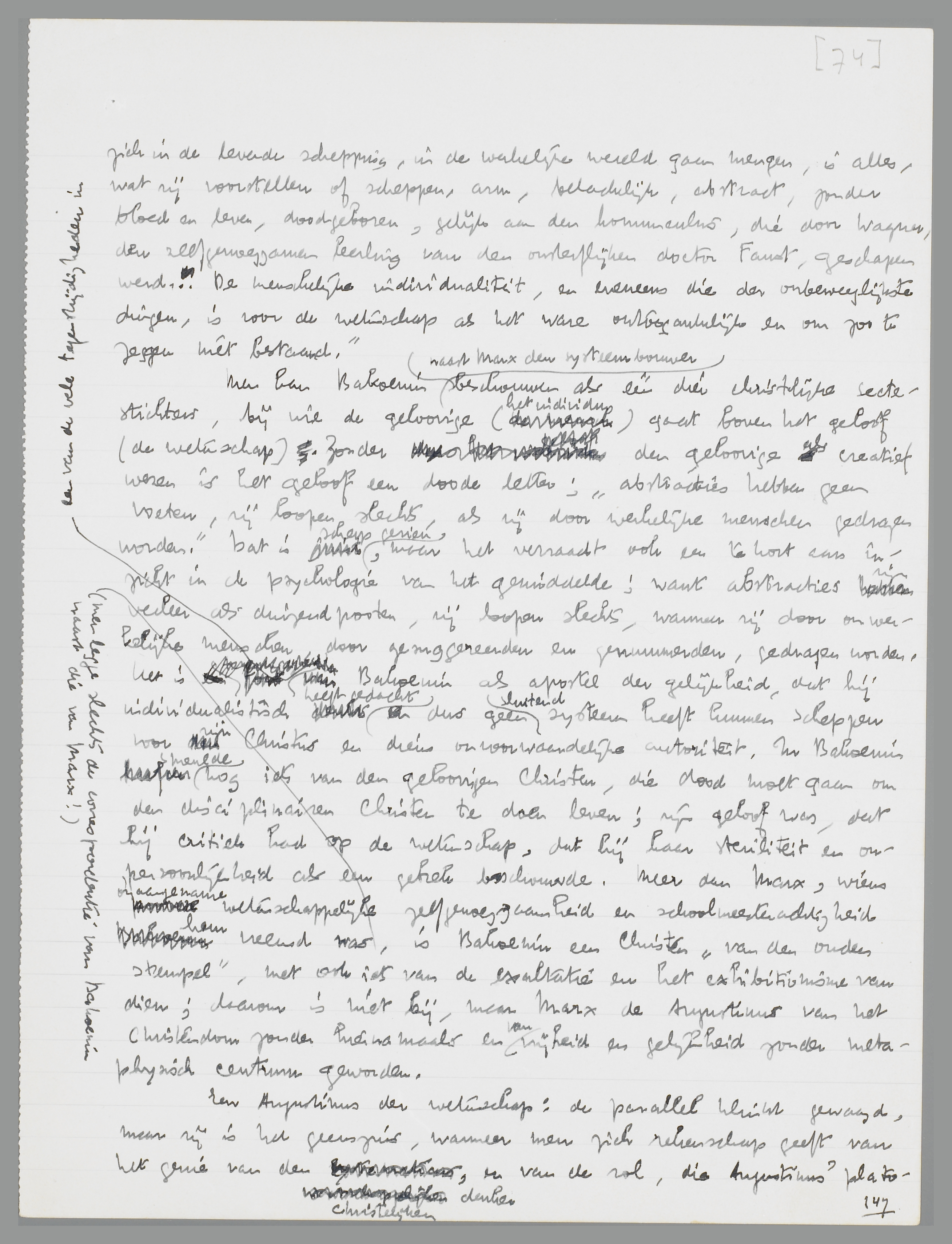 Christen te doen leven; zijn geloof was, dat hij critiek had op de wetenschap, dat hij haar steriliteit en onpersoonlijkheid als een gebrek beschouwde. Meer dan Marx, wiens onaangename wetenschappelijke zelfgenoegzaamheid en schoolmeesterachtigheid hem vreemd was (men legge slechts de correspondentie van Bakoenin naast die van Marx!), is Bakoenin een Christen ‘van den ouden stempel’, met ook iets van de exaltatie en het exhibitionisme van dien; daarom is niet hij, maar Marx de Augustinus van het Christendom zonder hiernamaals en van vrijheid en gelijkheid zonder metaphysisch centrum geworden.