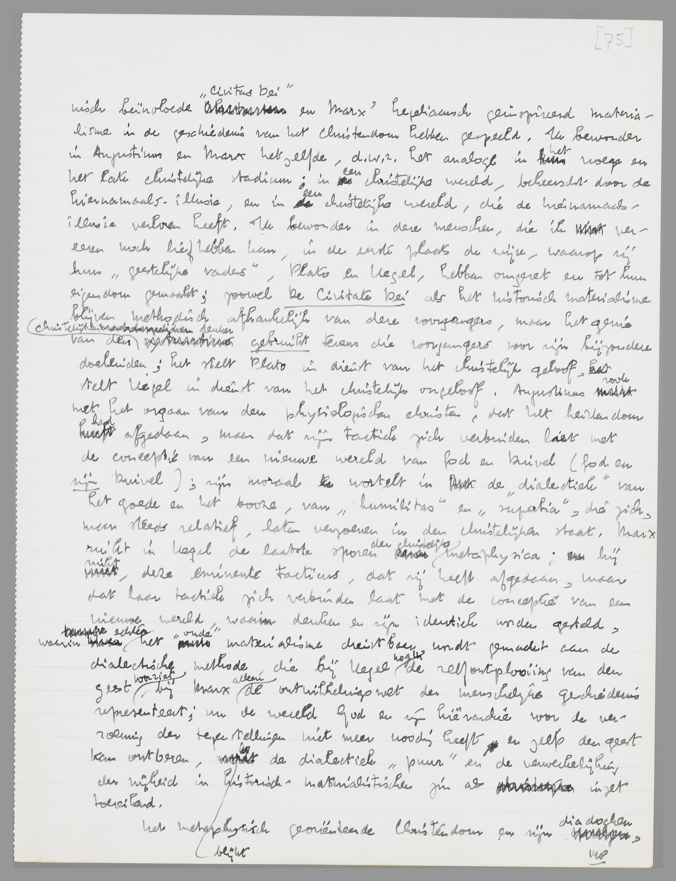 Een Augustinus der wetenschap: de parallel klinkt gewaagd, maar zij is het geenszins, wanneer men zich rekenschap geeft van het genie van den christelijken denker, en van de rol, die Augustinus' platonisch beïnvloede ‘Civitas Dei’ en Marx' hegeliaansch geïnspireerd materialisme in de geschiedenis van het Christendom hebben gespeeld. Ik bewonder in Augustinus en Marx hetzelfde, d.w.z. hun analoge beteekenis voor resp. het geloovige en het ongeloovige christendom; voor een christelijke wereld, beheerscht door de hiernamaals-illusie, en voor een christelijke wereld, die de hiernamaals-illusie verloren heeft. Ik bewonder in deze menschen, die ik vereeren noch liefhebben kan, in de eerste plaats de wijze, waarop zij hun ‘geestelijke vaders’, Plato en Hegel, hebben omgezet en tot hun eigendom gemaakt; zoowel De Civitate Dei als het historisch materialisme blijven methodisch afhan-