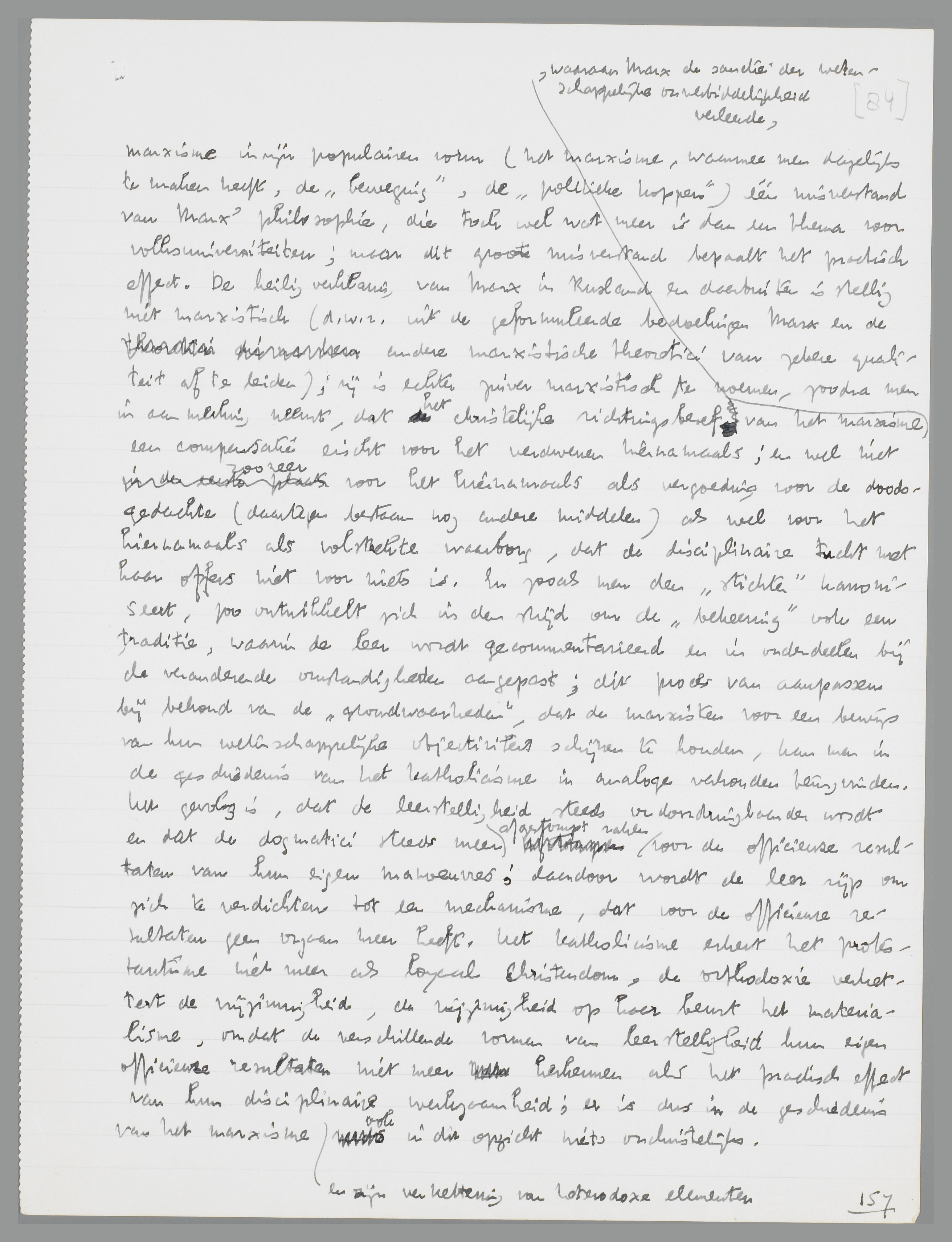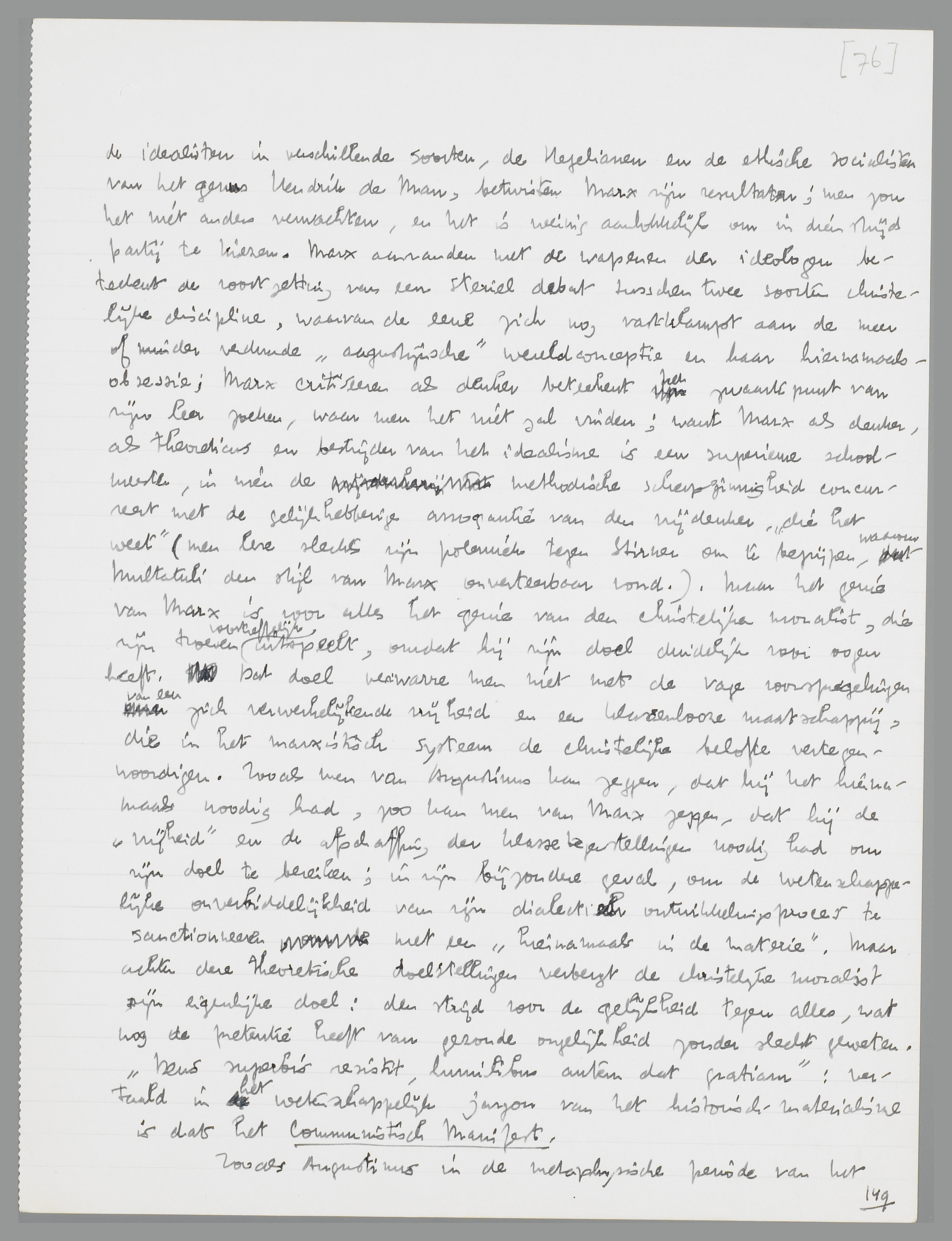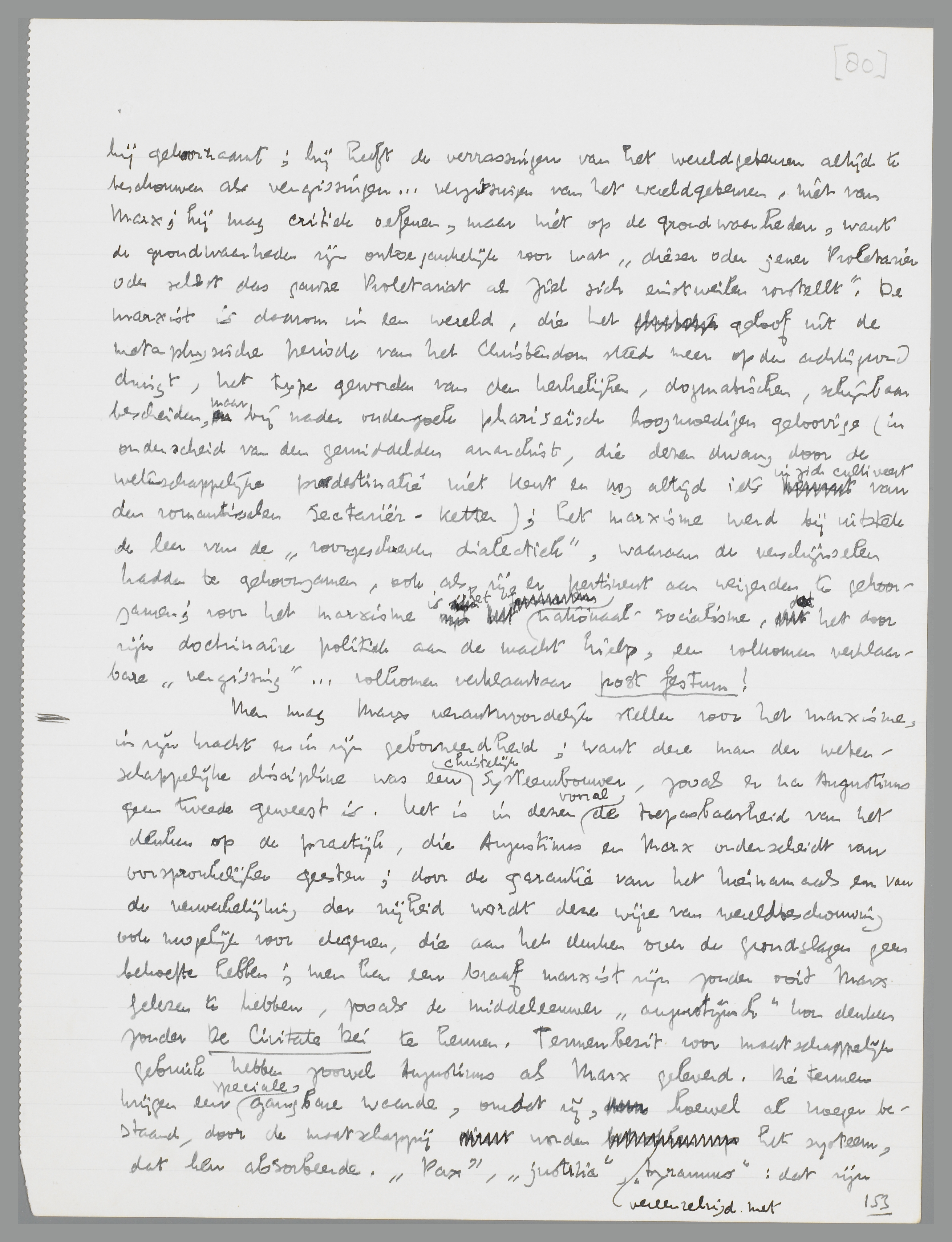 Men mag Marx verantwoordelijk stellen voor het marxisme, in zijn kracht en in zijn geborneerdheid; want deze man der wetenschappelijke discipline was een christelijk systeembouwer, zooals er na Augustinus geen tweede geweest is. Het is in dezen vooral de toepasbaarheid van het denken op de practijk, die Augustinus en Marx onderscheidt van oorspronkelijker geesten; door de garantie van resp. het hiernamaals en de verwerkelijking der vrijheid wordt deze wijze van wereldbeschouwing ook