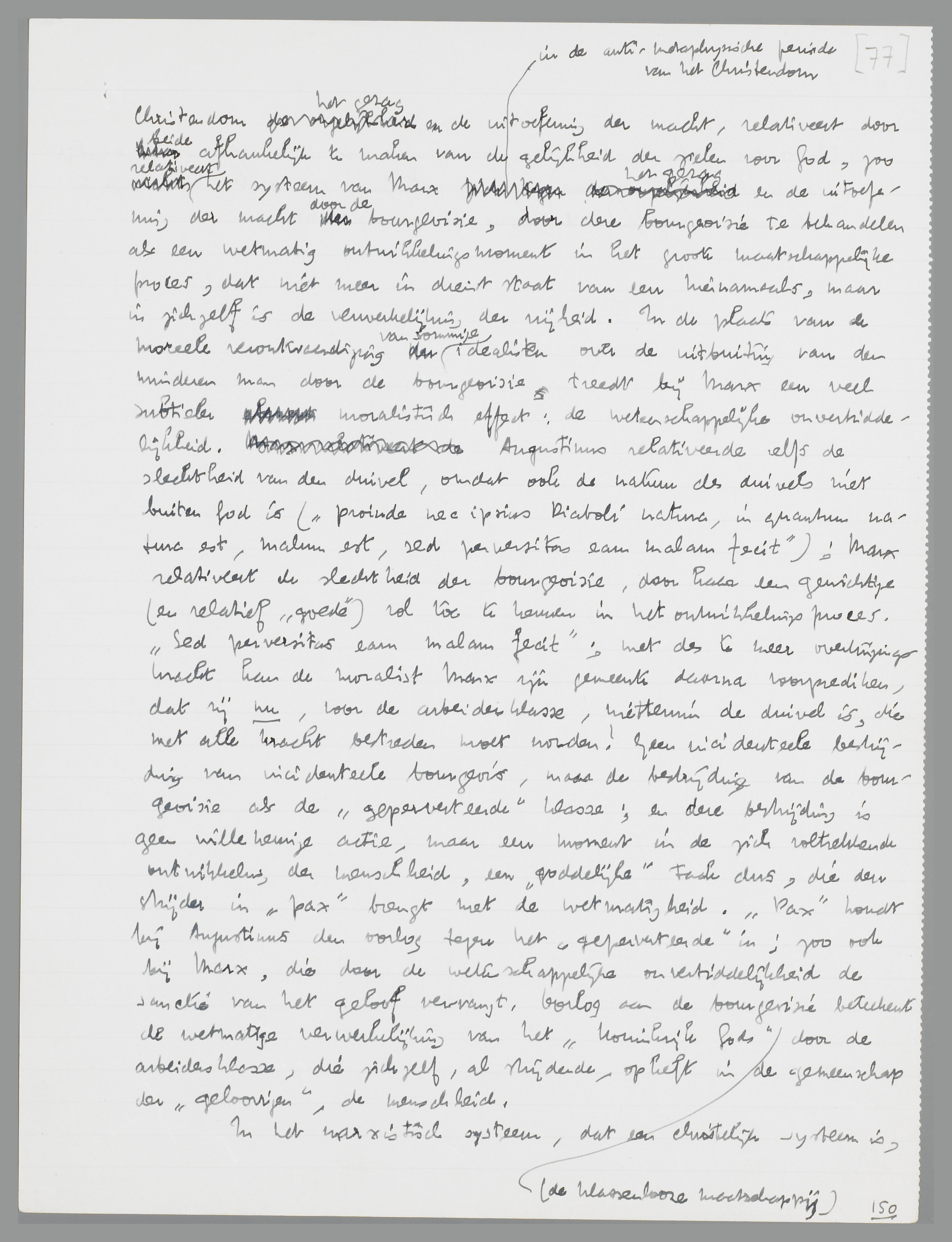 de natuur des duivels niet buiten God is (‘proinde nec ipsius Diaboli natura, in quantum natura est, malum est, sed perversitas eam malam fecit’); Marx relativeert de slechtheid der bourgeoisie, door haar een gewichtige (dus relatief ‘goede’) rol toe te kennen in het ontwikkelingsproces. ‘Sed perversitas eam malam fecit’; met des te meer overtuigingskracht kan de moralist Marx zijn gemeente daarna voorprediken, dat zij nu, voor de arbeidersklasse, niettemin de duivel is, die met alle kracht bestreden moet worden! Geen incidenteele bestrijding van incidenteele bourgeois, maar de bestrijding van de bourgeoisie als de ‘geperverteerde’ klasse; en deze bestrijding is geen willekeurige actie, maar een moment in de zich voltrekkende ontwikkeling der menschheid, een ‘goddelijk’ taak dus, die den strijder in harmonie (‘pax’) brengt met de wetmatigheid. ‘Pax’ houdt bij Augustinus den door het geloof gesanctionneerden oorlog tegen het ‘geperverteerde’ in; zoo ook bij Marx, die door de wetenschappelijke onverbiddelijkheid de sanctie van het geloof vervangt. Oorlog aan de bourgeoisie beteekent de wetmatige verwerkelijking van het ‘Koninkrijk Gods’ (de klassenlooze maatschappij) door de arbeidersklasse, die zichzelf, al strijdende, opheft in de gemeenschap der ‘geloovigen’, de menschheid.