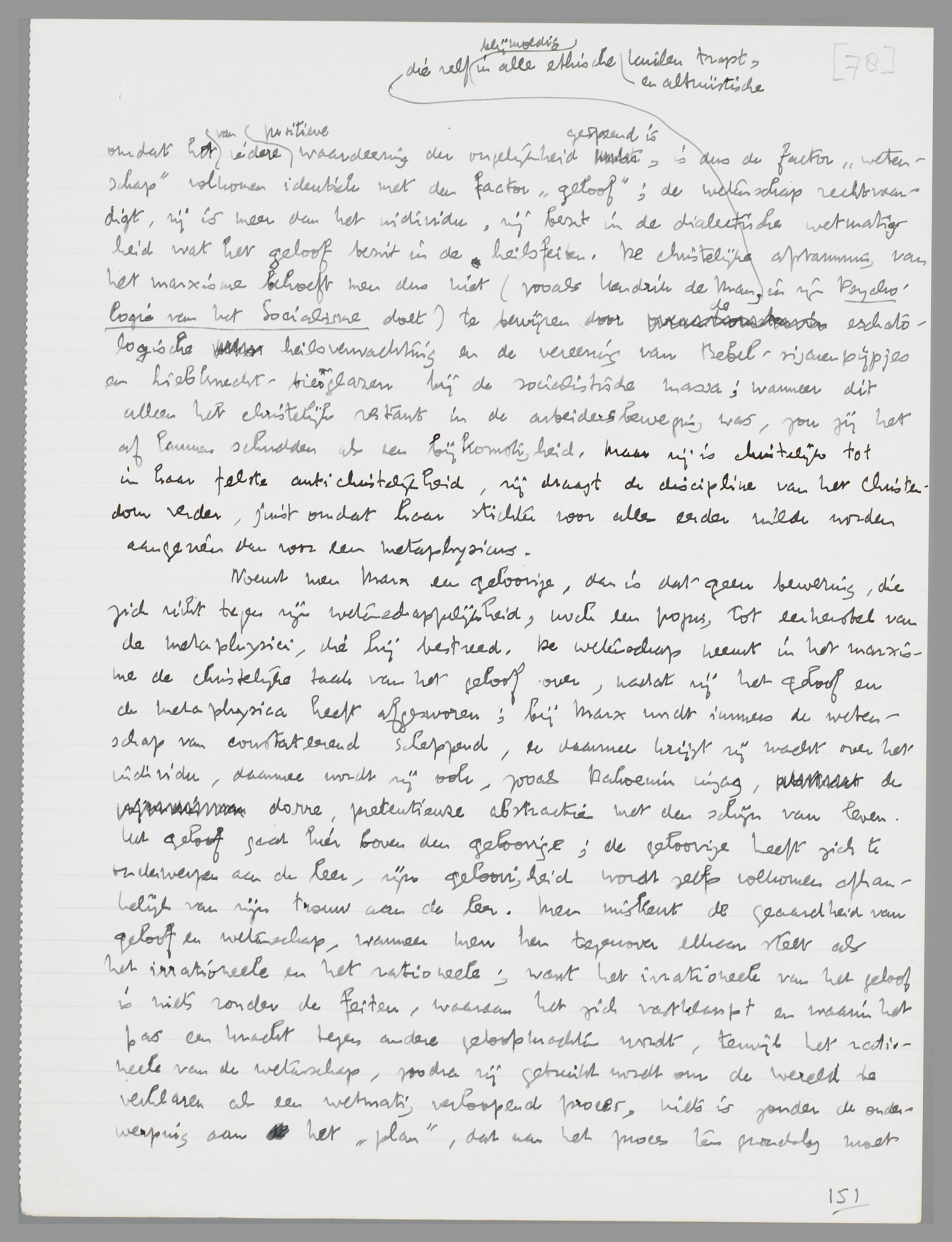 ‘wetenschap’ volkomen identiek met den ‘ouden’ factor ‘geloof’; de wetenschap rechtvaardigt, zij is meer dan het individu, zij bezit in de dialectische wetmatigheid wat het geloof bezit in de heilsfeiten. De christelijke afstamming van het marxisme behoeft men dus niet (zooals Hendrik de Man, die zelf blijmoedig in alle ethische en altruïstische kuilen trapt, in zijn Psychologie van het Socialisme doet) te bewijzen door de eschatologische heilsverwachting en de vereering van Bebel-sigarenpijpjes en Liebknecht-bierglazen bij de socialistische massa; wanneer dit alleen het christelijk restant in de arbeidersbeweging was, zou zij het af kunnen schudden als een bijkomstigheid. Maar zij is christelijk tot in haar felste anti-christelijkheid, zij draagt de discipline van het Christendom verder, juist omdat haar stichter voor alles eerder wilde worden aangezien dan voor een metaphysicus.