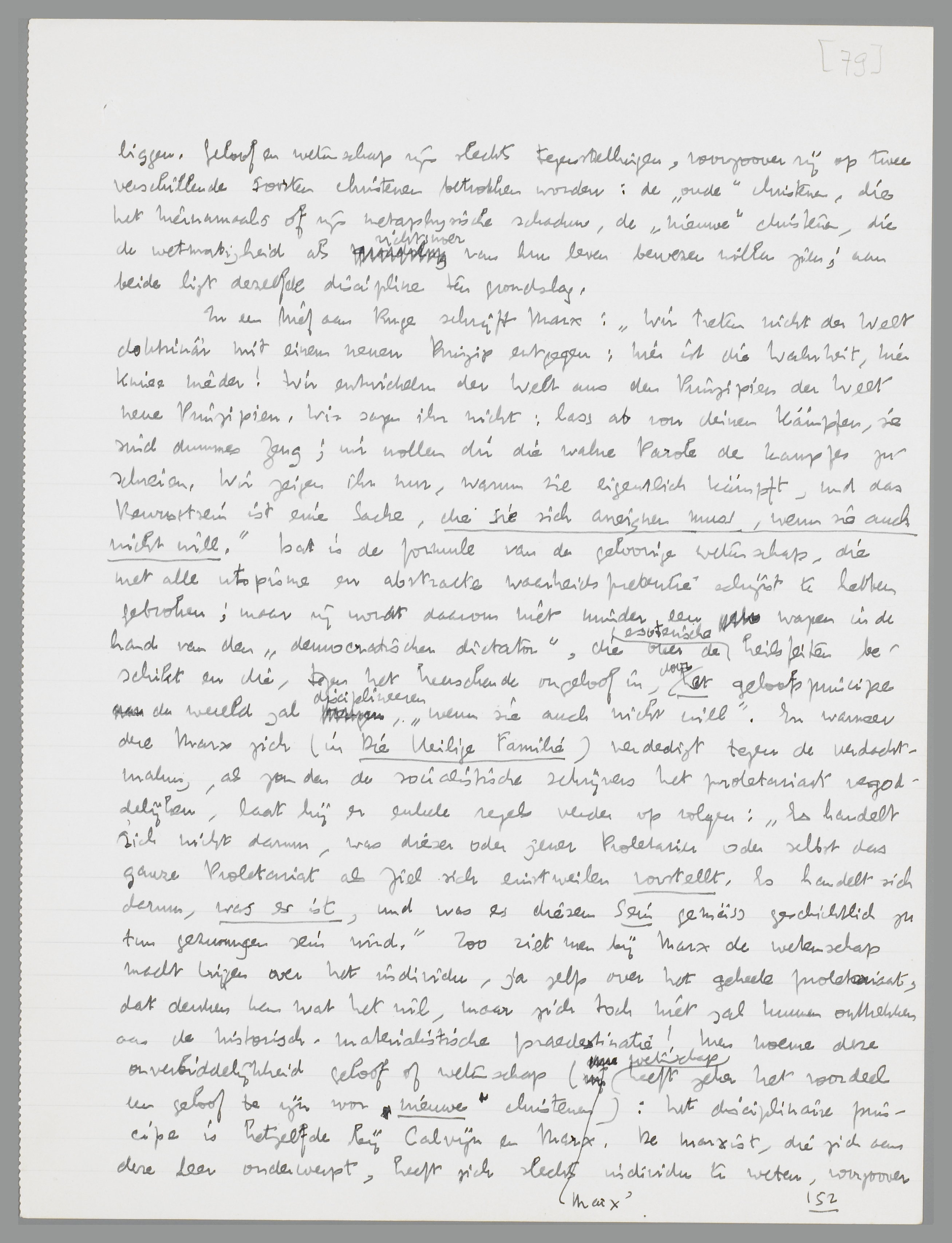 abstracte waarheidspretentie schijnt te hebben gebroken; maar zij wordt daarom niet minder een wapen in de hand van den ‘democratischen dictator’, die over de esoterische heilsfeiten beschikt en die, tegen het heerschende ongeloof in, door het geloofsprincipe de wereld zal disciplineeren ‘wenn sie auch nicht will’. En wanneer deze Marx zich (in Die Heilige Familie) verdedigt tegen de verdachtmaking, als zouden de socialistische schrijvers het proletariaat vergoddelijken, laat hij er enkele regels verder op volgen: ‘Es handelt sich nicht darum, was dieser oder jener Proletarier oder selbst das ganze Proletariat als Ziel sich einstweilen vorstellt. Es handelt sich darum, was es ist, und was es diesem Sein gemäss geschichtlich zu tun gezwungen sein wird.’ Zoo ziet men bij Marx de wetenschap macht krijgen over het individu, ja zelfs over het geheele proletariaat, dat denken kan wat het wil, maar zich toch niet zal kunnen onttrekken aan de historisch-materialistische praedestinatie! Men noeme deze onverbiddelijkheid geloof of wetenschap (Marx' wetenschap heeft zeker het voordeel een geloof te zijn voor nieuwe christenen): het disciplinaire principe is hetzelfde bij Calvijn en Marx. De marxist, die zich aan deze leer onderwerpt, heeft zich slechts individu te weten, voor zoover hij gehoorzaamt; hij heeft de verrassingen van het wereldgebeuren altijd te beschouwen als vergissingen... vergissingen van het wereldgebeuren, niet van Marx; hij mag critiek oefenen, maar niet op de grondwaarheden, want de