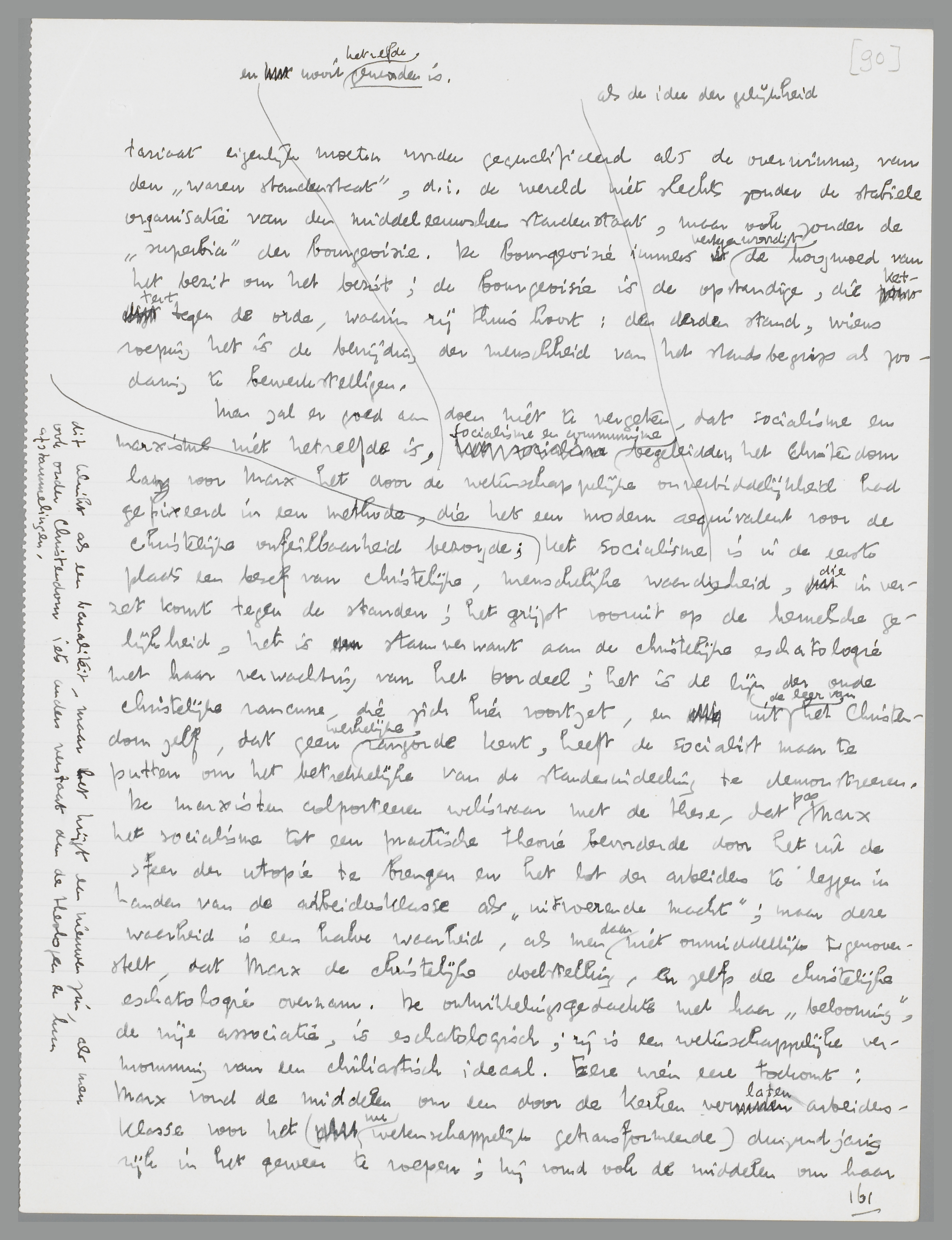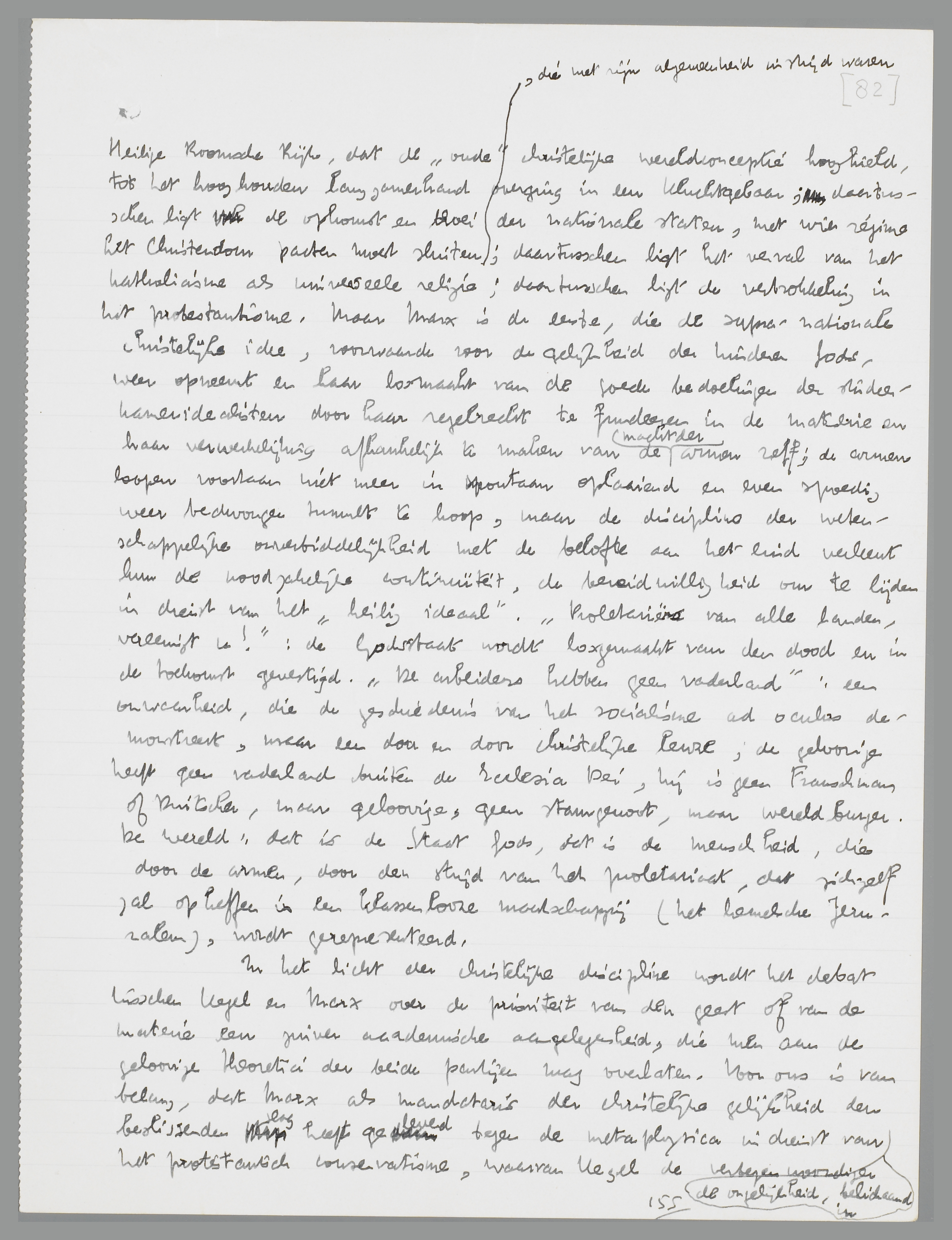 ligt de verbrokkeling in het protestantisme. Maar Marx is de denker, die de supra-nationale christelijke idee, voorwaarde voor de gelijkheid der kinderen Gods, weer opneemt en haar losmaakt van de goede bedoelingen der studeerkameridealisten door haar regelrecht te fundeeren in de materie en haar verwerkelijking afhankelijk te maken van de macht der armen zelf; de armen loopen voortaan niet meer in spontaan oplaaiend en even spoedig weer bedwongen tumult te hoop, maar de discipline der wetenschappelijke onverbiddelijkheid met de belofte aan het eind verleent hun de noodzakelijke continuïteit, de bereidwilligheid om te lijden in dienst van het ‘heilig ideaal’. ‘Proletariërs van alle landen vereenigt u!’: de Godsstaat wordt losgemaakt van den dood en in de toekomst gevestigd. ‘De arbeiders hebben geen vaderland’: een onwaarheid, die de geschiedenis van het socialisme ad oculos demonstreert, maar een door en door christelijke leuze; de geloovige heeft geen vaderland buiten de Ecclesia Dei, hij is geen Franschman of Duitscher, maar geloovige, geen stamgenoot, maar wereldburger. De wereld: dat is de Staat Gods, dat is de menschheid, die door de armen, door den strijd van het proletariaat, dat zichzelf zal opheffen in een klassenlooze maatschappij (het hemelsche Jeruzalem), wordt gerepresenteerd.