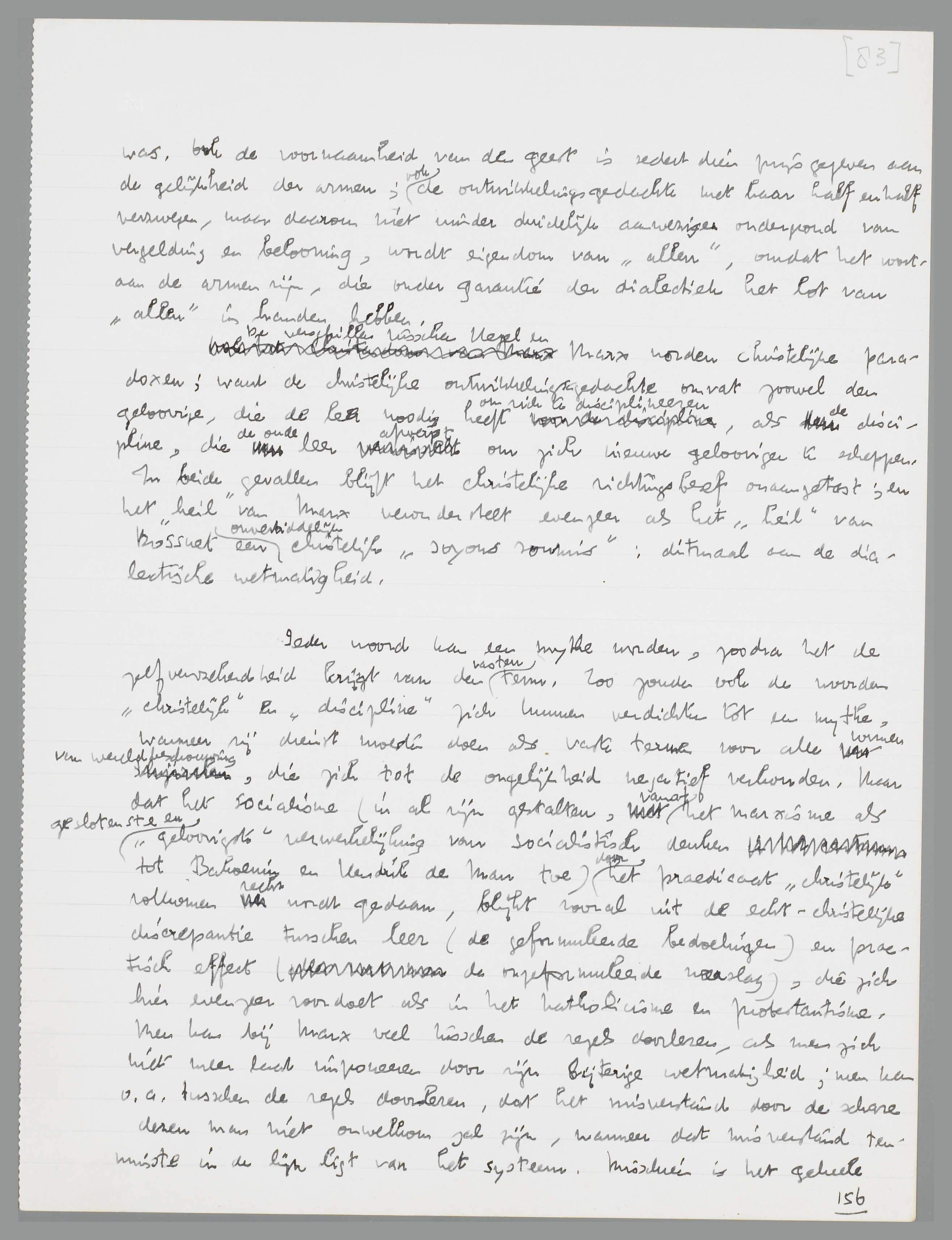 De verschillen tusschen Hegel en Marx worden christelijke paradoxen; want de christelijke ontwikkelingsgedachte omvat zoowel den geloovige, die de leer noodig heeft om zich te disciplineeren, als de discipline, die de oude leer afwerpt om zich nieuwe geloovigen te scheppen. In beide gevallen blijft het christelijke richtingsbesef onaangetast; en het ‘heil’ van Marx veronderstelt evenzeer als het ‘heil’ van Bossuet een onverbiddelijk christelijk ‘soyons soumis’, al wordt de onderwerping ditmaal aan de dialectische wetmatigheid geëndosseerd.