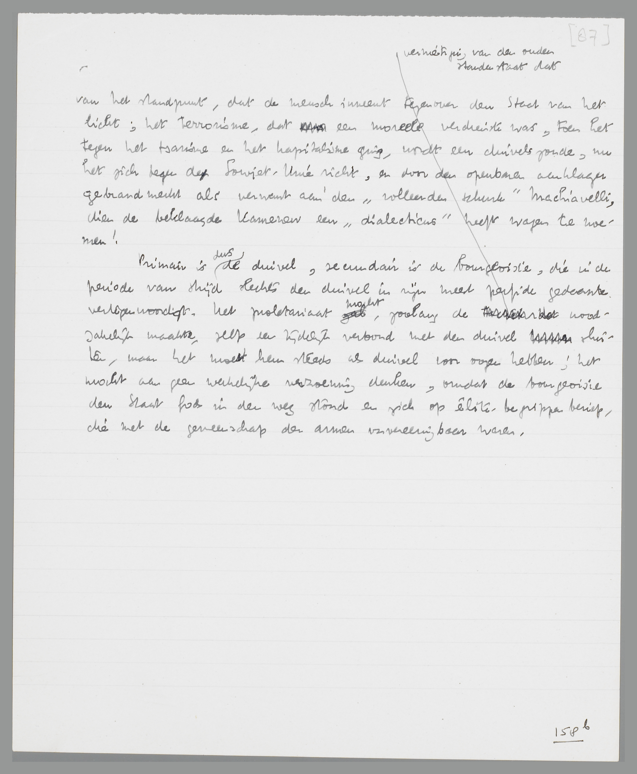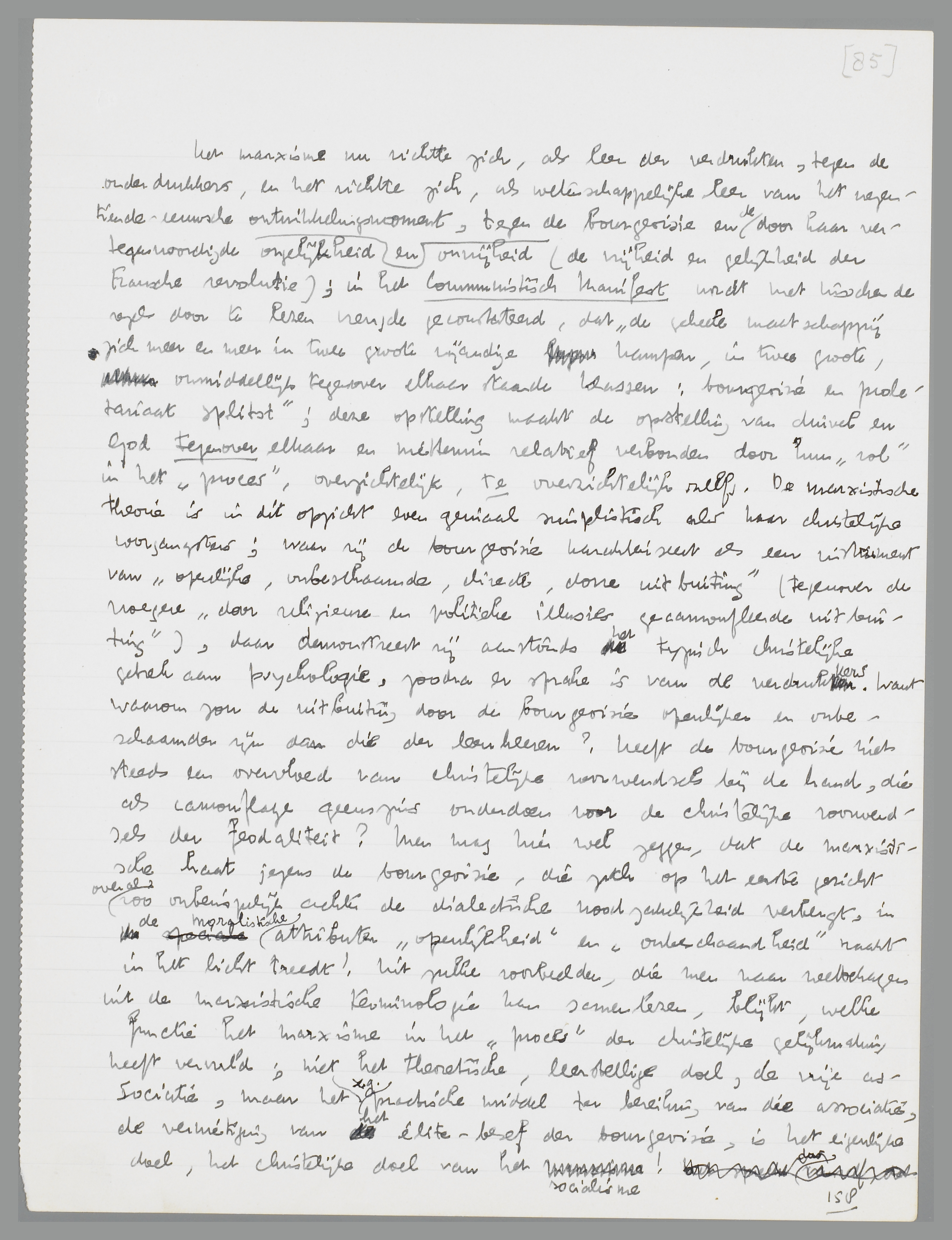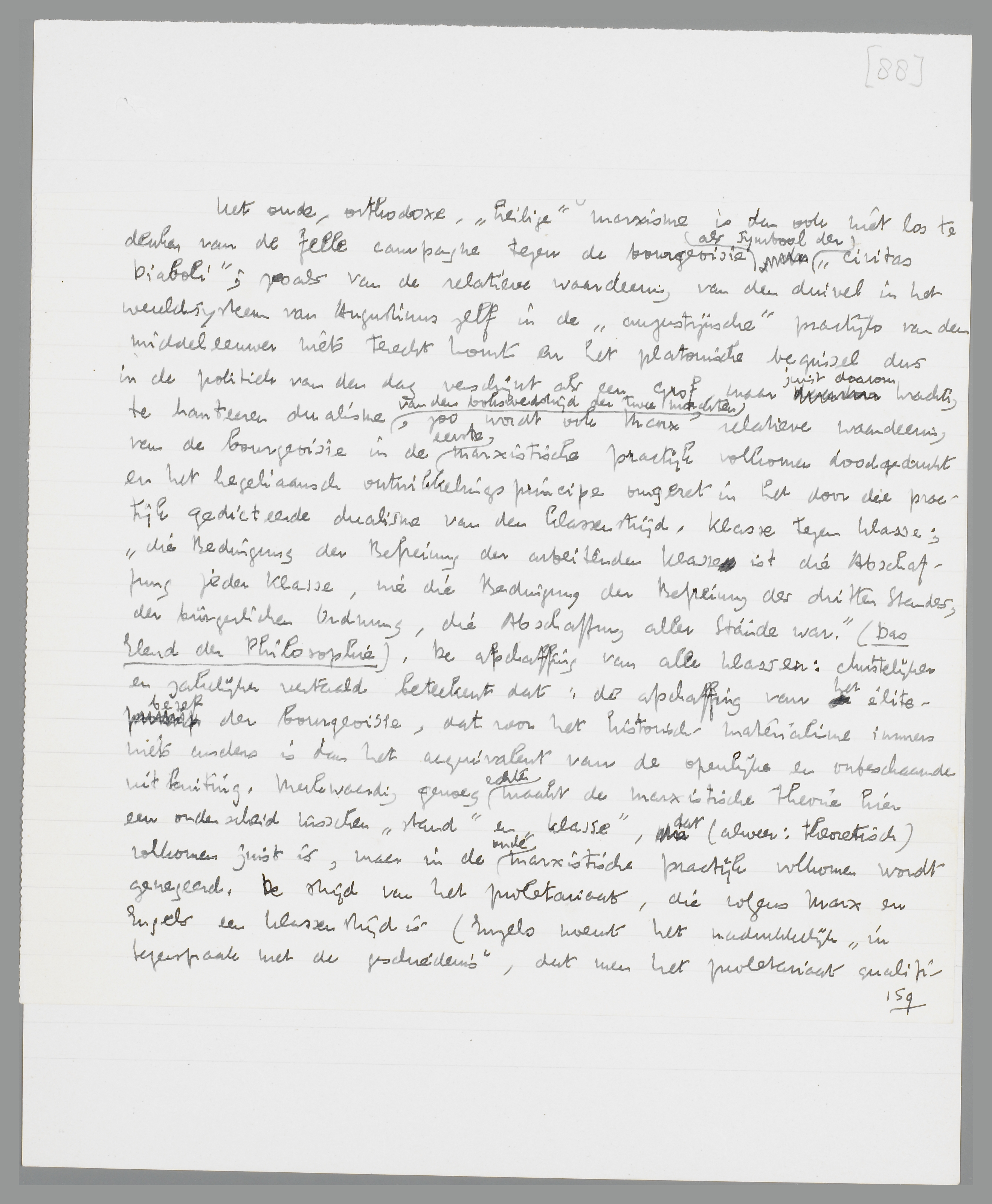 Het oude, orthodoxe, ‘heilige’ marxisme is dan ook niet los te denken van de felle campagne tegen de bourgeoisie als symbool der ‘Civitas Diaboli’; zooals van de relatieve waardeering van den duivel in het wereldsysteem van Augustinus zelf in de ‘augustijnsche’ practijk van den middeleeuwer niets terecht komt en het platonische beginsel dus in de politiek van den dag verschijnt als een grof maar juist daarom krachtig te hanteeren dualisme van den bokswedstrijd der twee machten, zoo wordt ook Marx' relatieve waardeering van de bourgeoisie in de echte marxistische practijk volkomen doodgedrukt en het hegeliaansch ontwikkelingsprincipe omgezet in een moralistisch gesteld dualisme van den klassenstrijd. Klasse tegen klasse; ‘die Be-