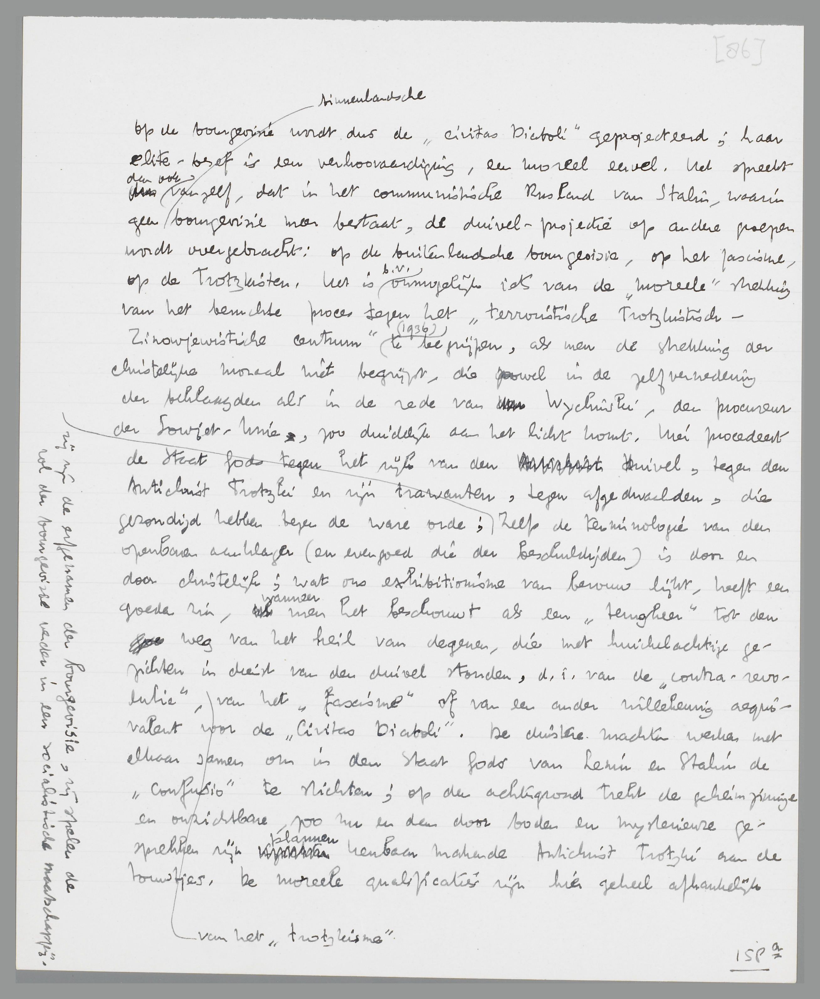 chinski, den procureur der Sowjet-Unie, zoo duidelijk aan het licht komt. Hier procedeert de Staat Gods tegen het rijk van den Duivel, tegen den Antichrist Trotzki en zijn trawanten, tegen afgedwaalden, die gezondigd hebben tegen de ware orde; zij behooren tot het duivelsrijk der bourgeoisie, zij spelen de rol der bourgeoisie verder in een socialistische maatschappij. Zelfs de terminologie van den openbaren aanklager, en evengoed die der beschuldigden, is door en door christelijk; wat ons exhibitionisme van berouw lijkt, heeft een goeden zin, wanneer men het beschouwt als een ‘terugkeer’ tot den weg van het heil van degenen, die met huichelachtige gezichten in dienst van den duivel stonden, d.i. van de ‘contra-revolutie’, van het ‘trotzkisme’, van het ‘fascisme’ of van een ander willekeurig aequivalent voor de ‘Civitas Diaboli’. De duistere machten werken met elkaar samen om in den Staat Gods van Lenin en Stalin de ‘confusio’ te stichten; op den achtergrond trekt de geheimzinnige en onzichtbare, zoo nu en dan door boden en mysterieuze gesprekken zijn plannen kenbaar makende Antichrist Trotzki aan de touwtjes. De moreele qualificaties zijn hier geheel afhankelijk van het standpunt, dat de mensch inneemt tegenover den Staat van het licht; het terrorisme, dat een moreele verdienste was, toen het tegen het tsarisme en het kapitalisme ging, wordt een duivelszonde, nu het zich tegen de Sowjet-Unie richt, en door den openbaren aanklager gebrandmerkt als verwant aan