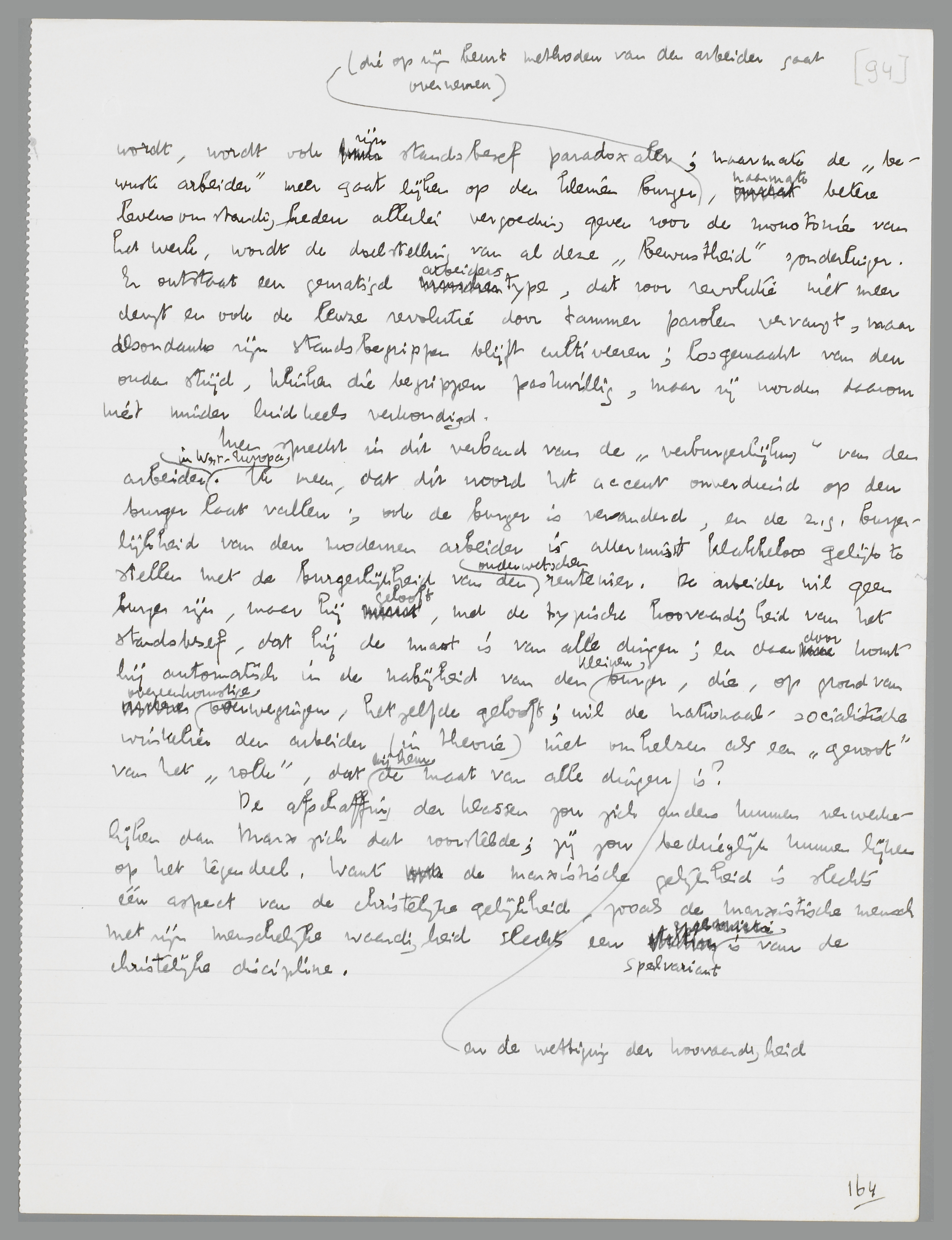 Men spreekt in dit verband van de ‘verburgerlijking’ van den arbeider in West-Europa. Ik meen, dat dit woord het accent onverdiend op den burger laat vallen; ook de burger is veranderd, en de z.g. burgerlijkheid van den modernen arbeider is allerminst klakkeloos gelijk te stellen met de burgerlijkheid van den ouderwetschen rentenier. De arbeider wil geen burger zijn, maar hij gelooft, met de typische hoovaardigheid van het standsbesef, dat hij de maat is van alle dingen; en daardoor komt hij automatisch in de nabijheid van den kleinen burger, die, op grond van overeenkomstige overwegingen, hetzelfde gelooft; wil de nationaal-socialistische winkelier den arbeider (in theorie) niet omhelzen als een ‘genoot’ van het ‘volk’, dat bij hèm de maat van alle dingen en de wettiging der hoovaardigheid is?
