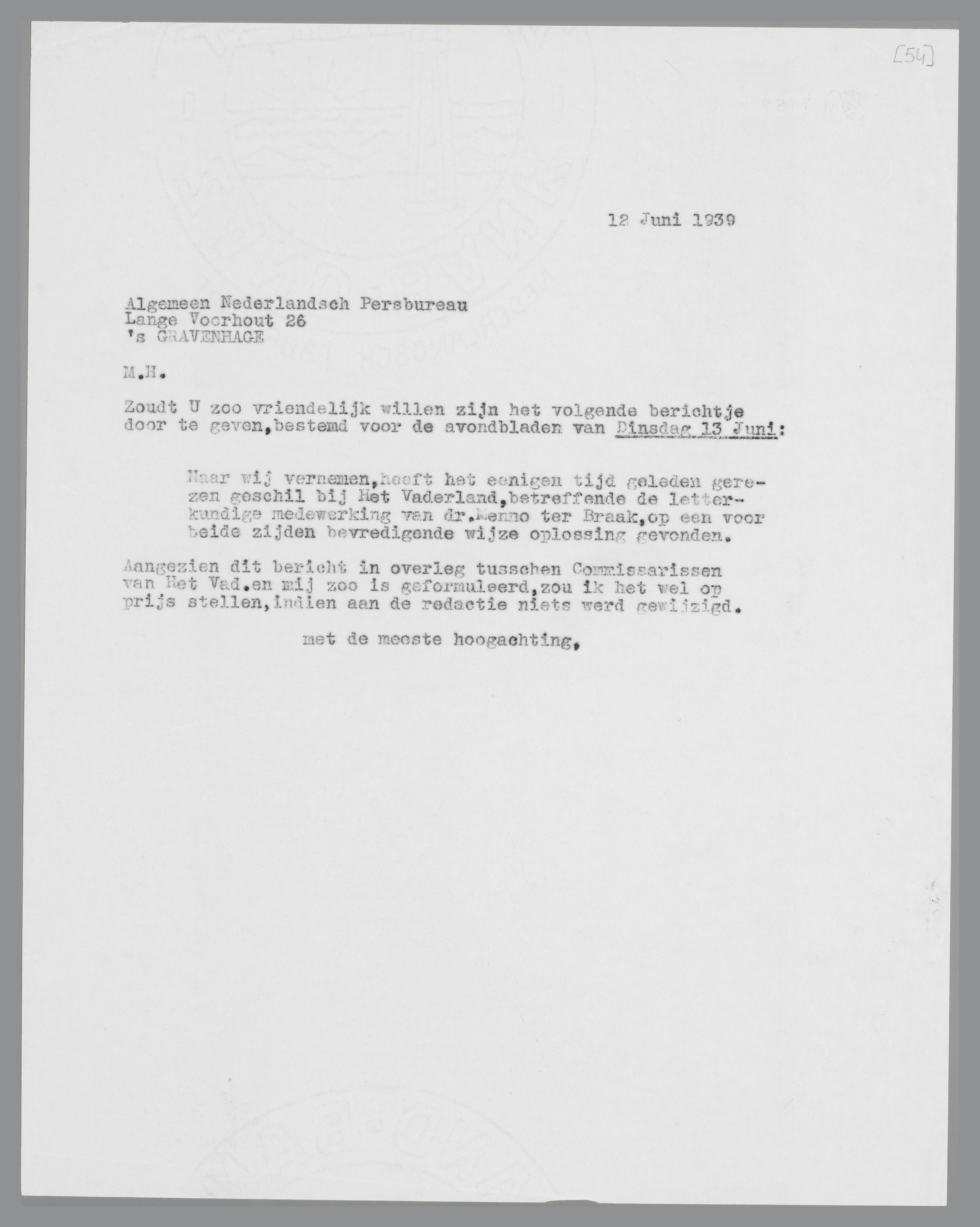 Briefwisseling Menno ter Braak - Algemeen Nederlandsch Persbureau