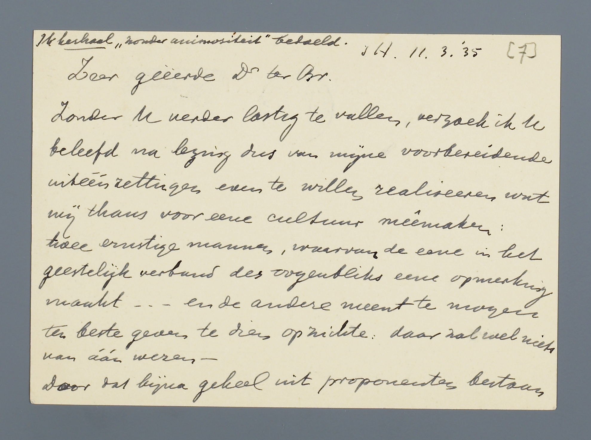Zonder U verder lastig te vallen, verzoek ik U beleefd na lezing dus van mijne voorbereidende uitéénzettingen even te willen realiseeren wat wij thans voor eene cultuur meemaken: twee ernstige mannen, waarvan de eene in het geestelijk verband des oogenbliks eene opmerking maakt... en de andere meent te mogen ten beste geven te dien opzichte: daar zal wel niets van áán wezen -
