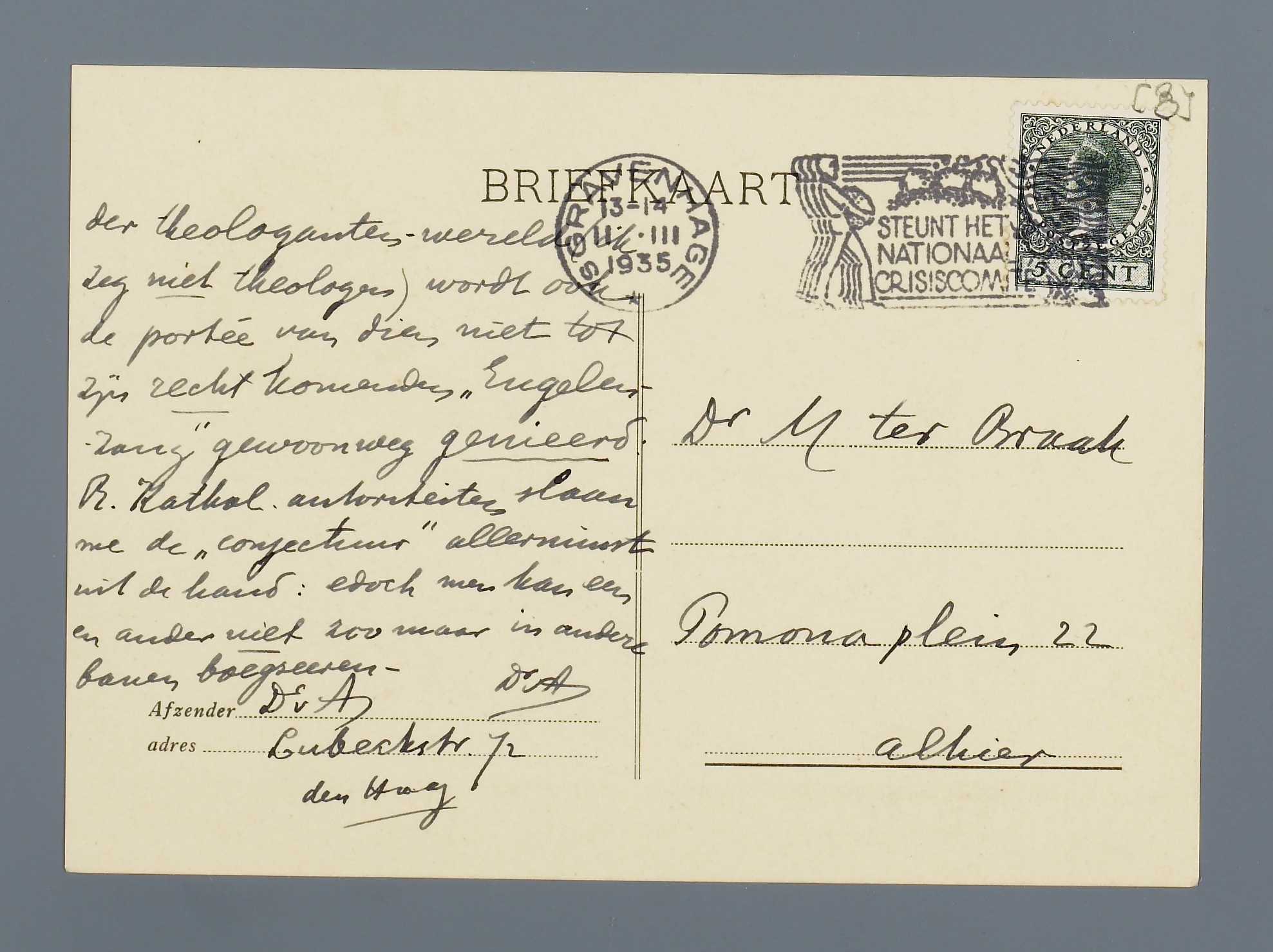 Door dat bijna geheel uit proponenten bestaan der theologanten-wereld (ik zeg niet theologen) wordt ook de portée van dien niet tot zijn recht komenden ‘Engelenzang’ gewoonweg genieerd: R. Kathol. autoriteiten slaan me de ‘conjectuur’ allerminst uit de hand: edoch men kan een en ander niet zoo maar in andere banen boegseeren.
