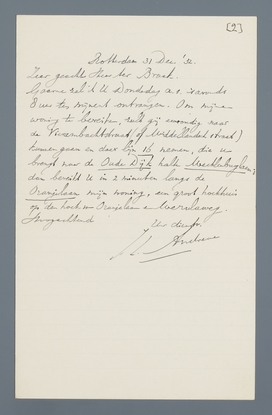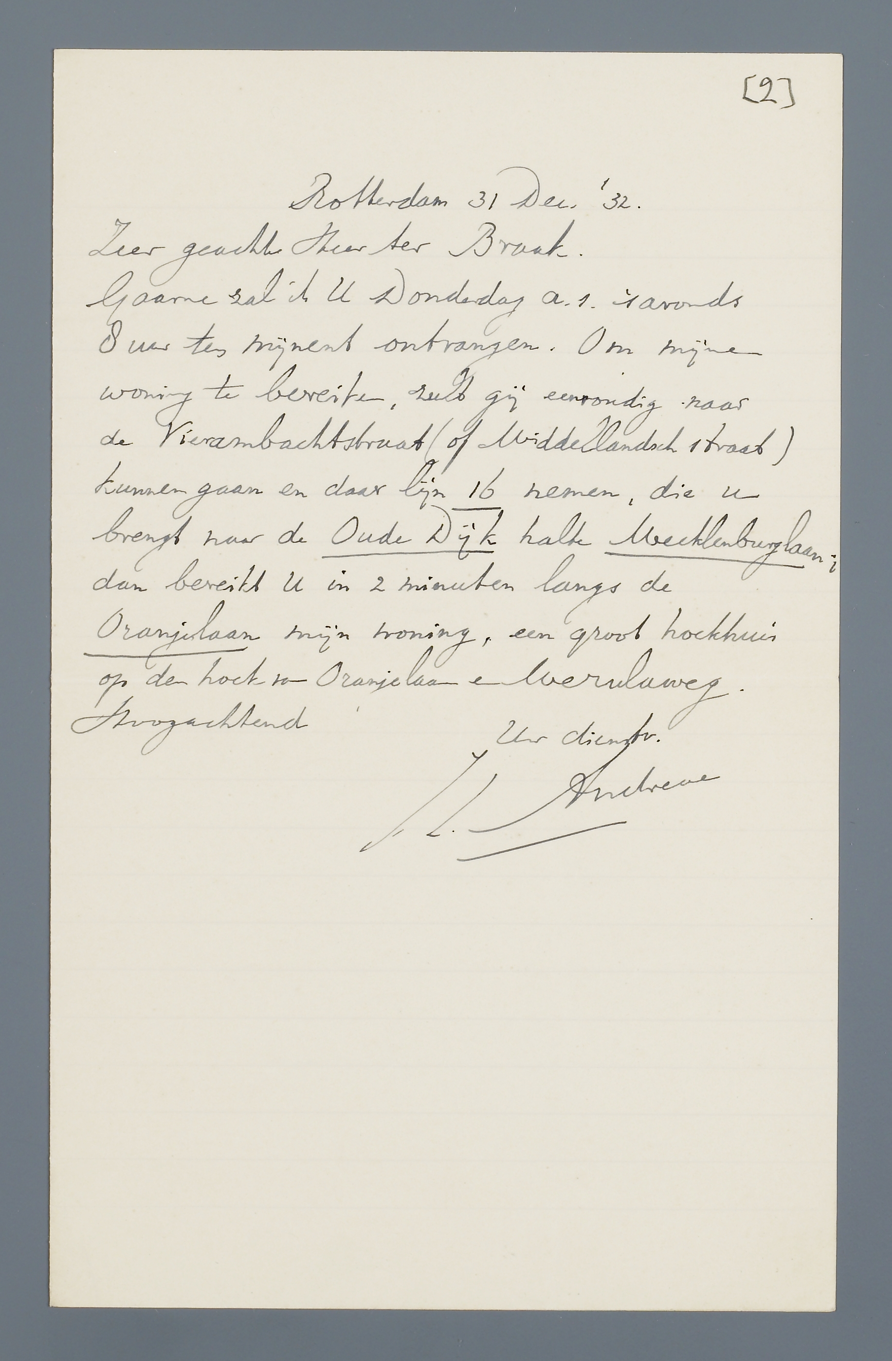 Gaarne zal ik U Donderdag a.s. 's avonds ten mijnent ontvangen. Om mijnen woning te bereiken, zult gij eenvoudig naar de Vierambachtstraat (of Middellandschstraat) kunnen gaan en daar lijn 16 nemen, die U brengt naar de Oude Dijk halte Mecklenburglaan; dan bereikt U in twee minuten langs de Oranjelaan mijn woning, een groot hoekhuis op den hoek van Oranjelaan en Merulaweg.
