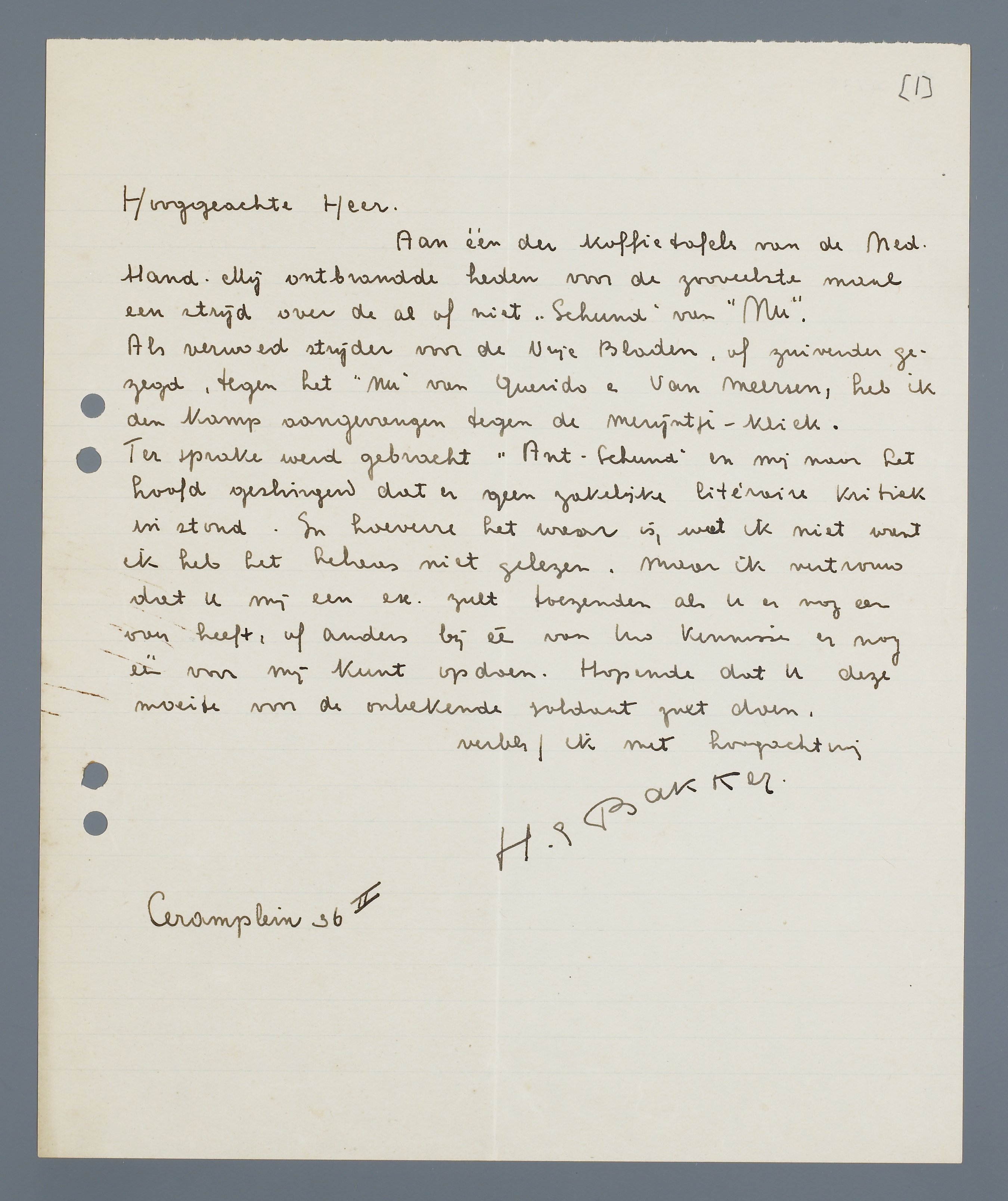 Ter sprake werd gebracht ‘Anti-Schund’ en mij naar het hoofd geslingerd dat er geen zakelijke literaire kritiek in stond. In hoeverre het waar is, weet ik niet want ik heb het helaas niet gelezen. Maar ik vertrouw dat u mij een ex. zult toezenden als u er nog een over heeft, of anders bij één van uw kennissen er nog één voor mij kunt opdoen. Hopende dat u deze moeite voor de ombekende soldaat zult doen.