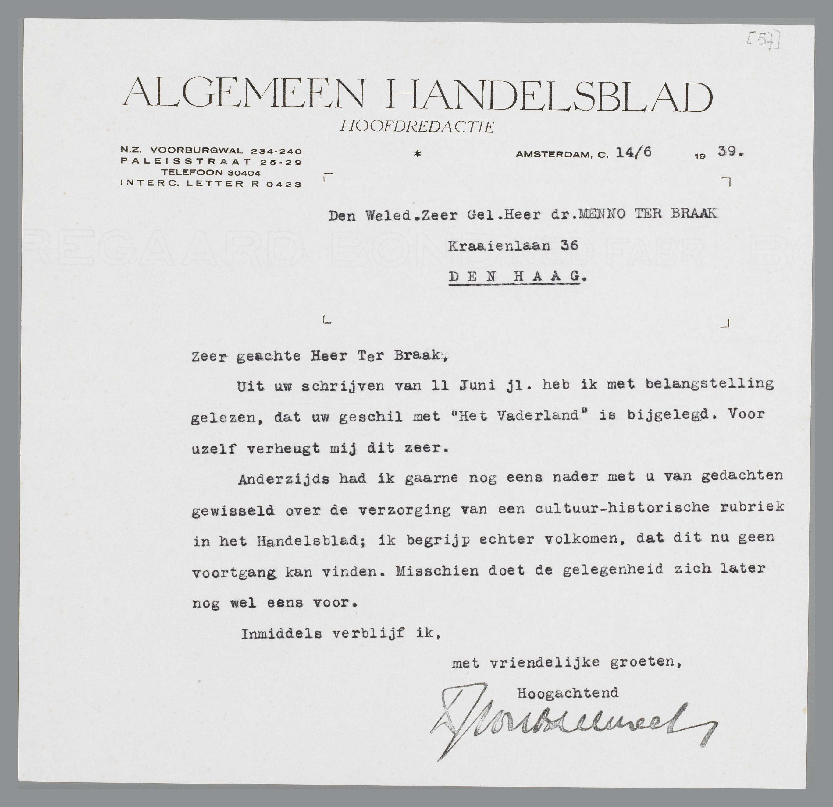Anderzijds had ik gaarne nog eens met u van gedachten gewisseld over de verzorging van een cultuur-historische rubriek in het Handelsblad; ik begrijp echter volkomen, dat dit nu geen voortgang kan vinden. Misschien doet de gelegenheid zich later nog wel eens voor.