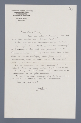 Dank voor jelui boekenzending, die als altijd zeer welkom was. Cheque ingesloten. Ik ben nog altijd in afwachting van de beslissing in Den Haag. Het is blijkbaar niet zoo eenvoudig! Op het moment is hier ook weer gemorrel met de [leeszaal] subsidie, nu van provinciewege. Men dringt daar op verdere verlaging aan. Geen aangenaam vooruitzicht, want ten slotte zal ik het dan ook wel in 't salaris merken.