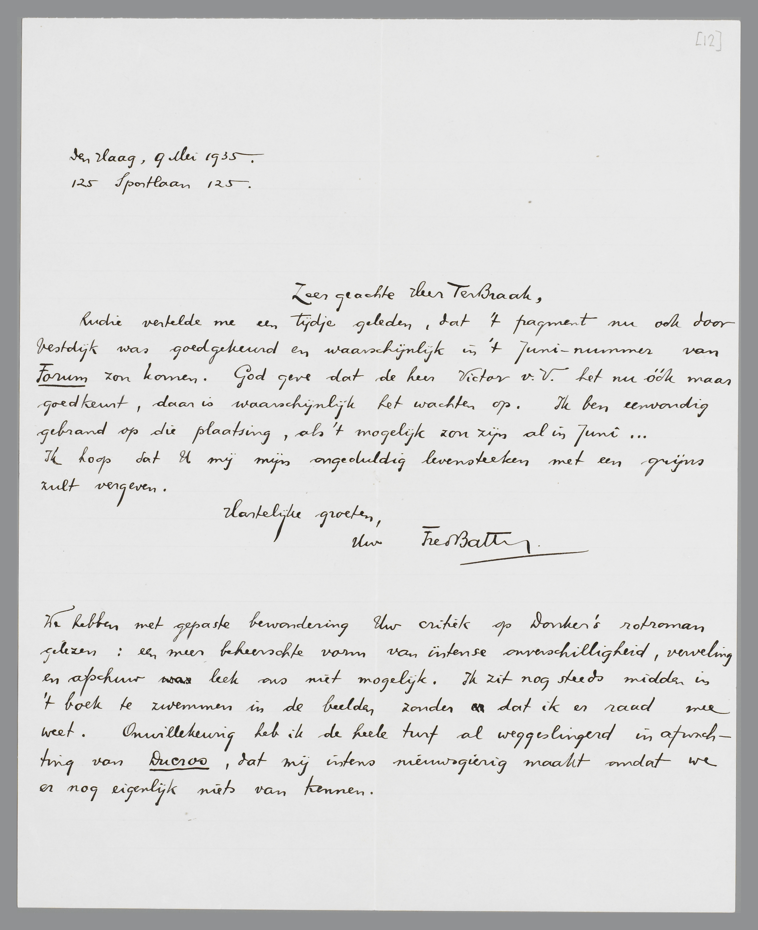 We hebben met gepaste bewondering Uw critiek op Donker's rotroman gelezen: een meer beheerschte vorm van intense onverschilligheid, verveling en afschuw leek ons niet mogelijk. Ik zit nog steeds midden in 't boek te zwemmen in de beelden zonder dat ik er raad mee weet. Onwillekeurig heb ik de heele turf al weggeslingerd in afwachting van Ducroo, dat mij intens nieuwsgierig maakt omdat we er nog eigenlijk niets van kennen.