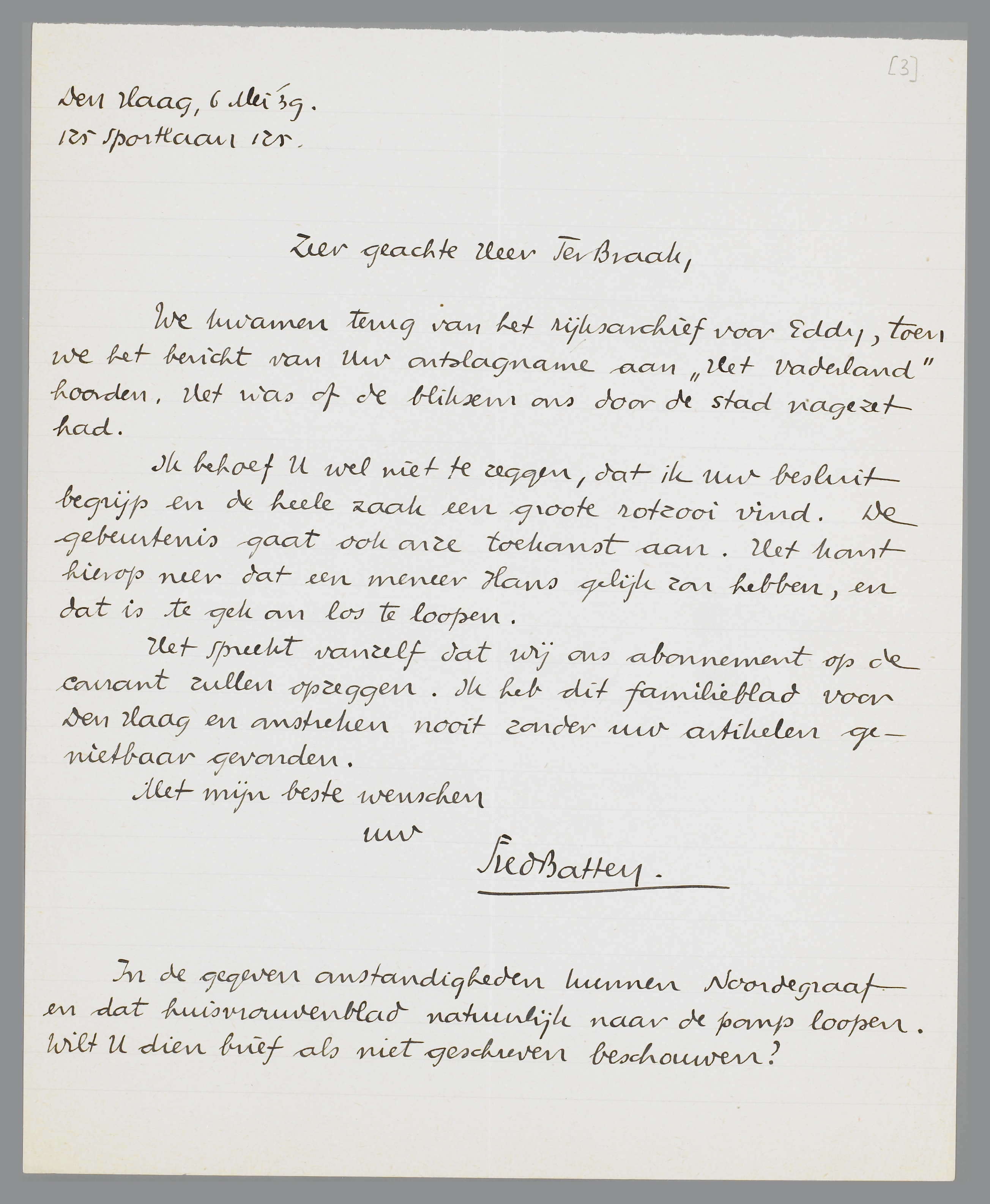 We kwamen terug van het rijksarchief voor Eddy, toen we het bericht van Uw ontslagname aan ‘Het Vaderland’ hoorden. Het was of de bliksem ons door de stad nagezet had.