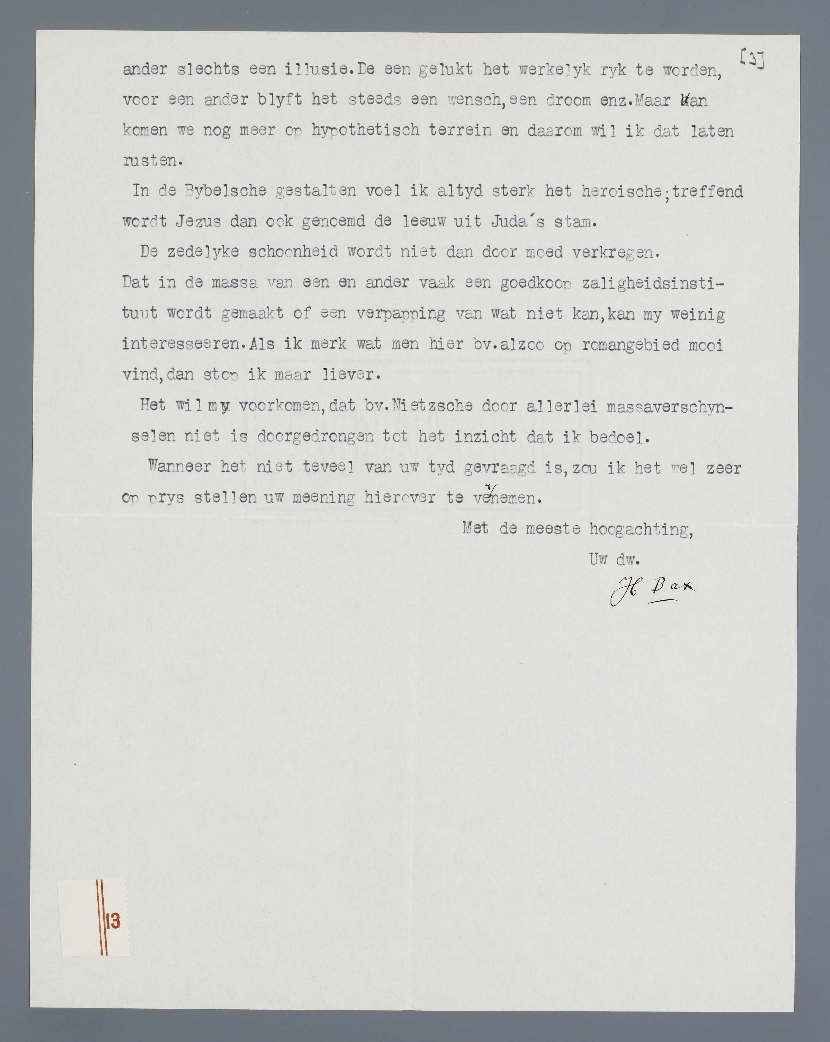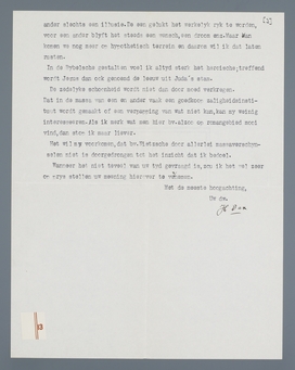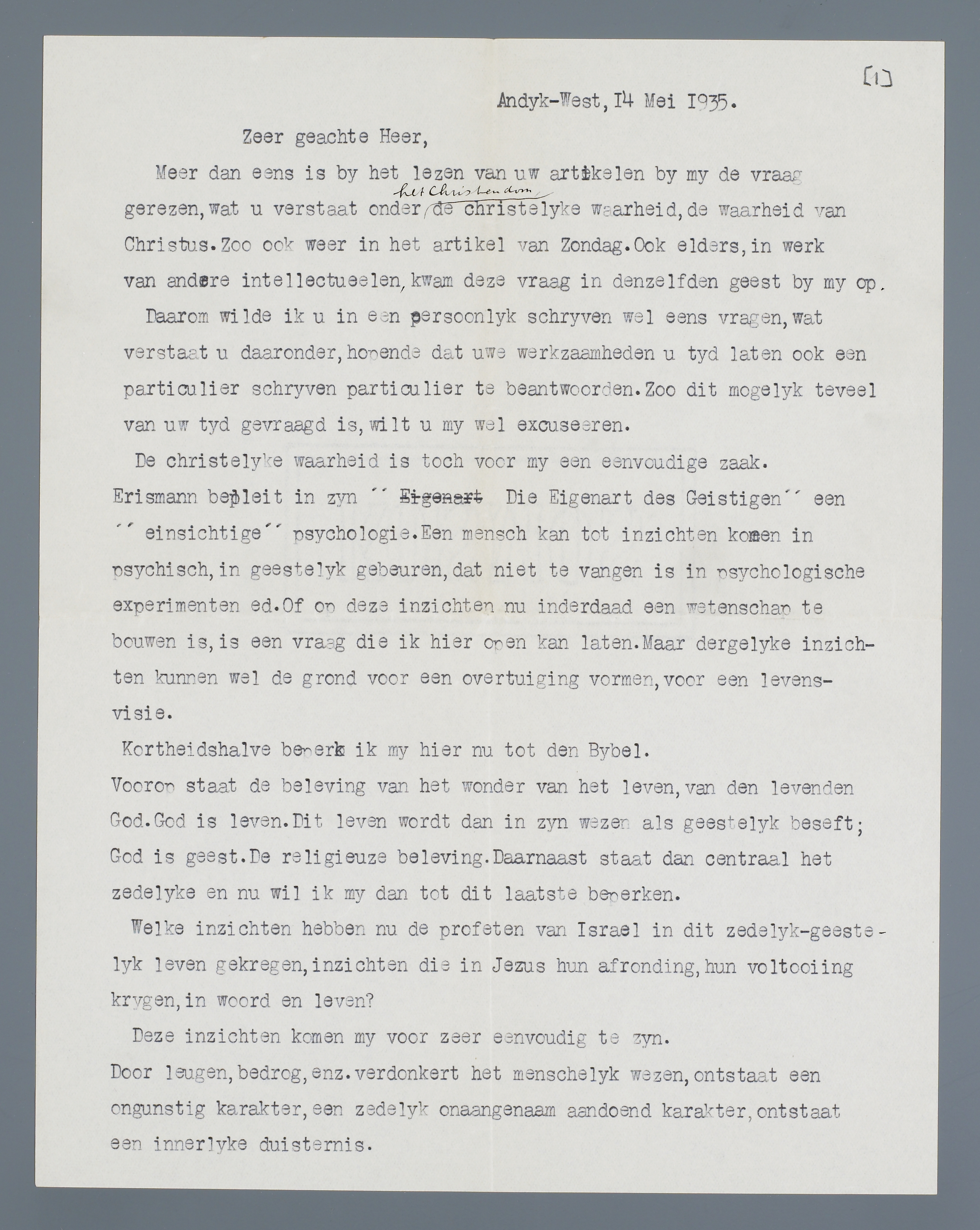 Meer dan eens is by het lezen van uw artikelen by my de vraag gerezen, wat u verstaat onder het Christendom de christelyke waarheid, de waarheid van Christus. Zoo ook weer in het artikel van Zondag. Ook elders, in werk van andere intellectueelen, kwam deze vraag in denzelfden geest by my op. Daarom wilde ik u in een persoonlyk schryven wel eens vragen, wat verstaat u daaronder, hopende dat uwe werkzaamheden u tyd laten ook een particulier schryven particulier te beantwoorden. Zoo dit mogelyk teveel van uw tyd gevraagd is, wilt u my wel excuseeren.