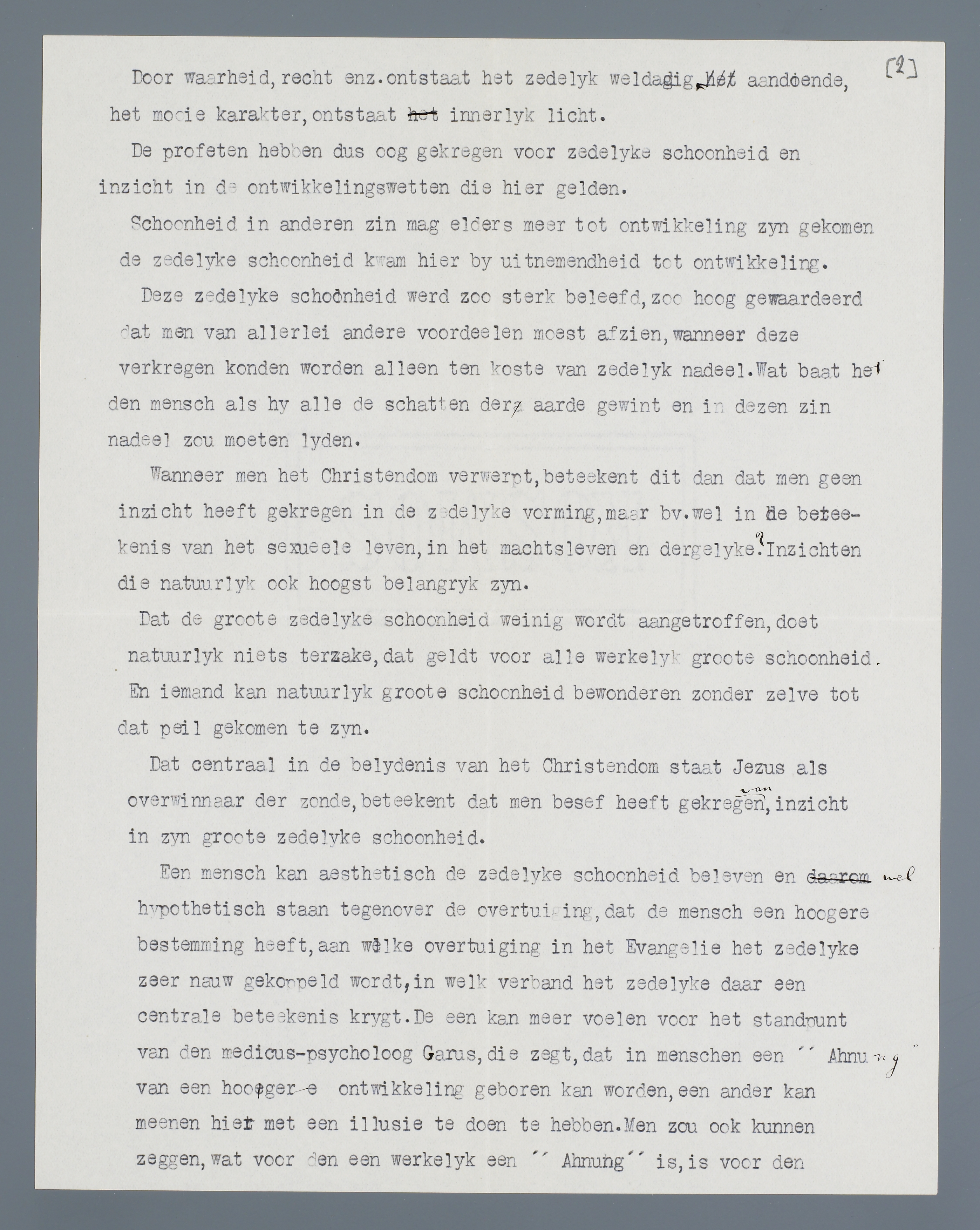 Een mensch kan aesthetisch de zedelyke schoonheid beleven en hypothetisch staan tegenover de overtuiging, dat de mensch een hoogere bestemming heeft, aan welke overtuiging in het Evangelie het zedelyke zeer nauw gekoppeld wordt, in welk verband het zedelyke daar een centrale beteekenis krygt. De een kan meer voelen voor het standpunt van den medicus-psycholoog Garus, die zegt, dat in menschen een ‘Ahnung’ van een hoogere ontwikkeling geboren kan worden, een ander kan meenen hier met een illusie te doen te hebben. Men zou ook kunnen zeggen, wat voor den een werkelyk een ‘Ahnung’ is, is voor den ander slechts een illusie. De een gelukt het werkelyk ryk te worden, voor een ander blyft het steeds een wensch, een droom enz. Maar dan komen we nog meer op hypothetisch terrein en daarom wil ik dat laten rusten.