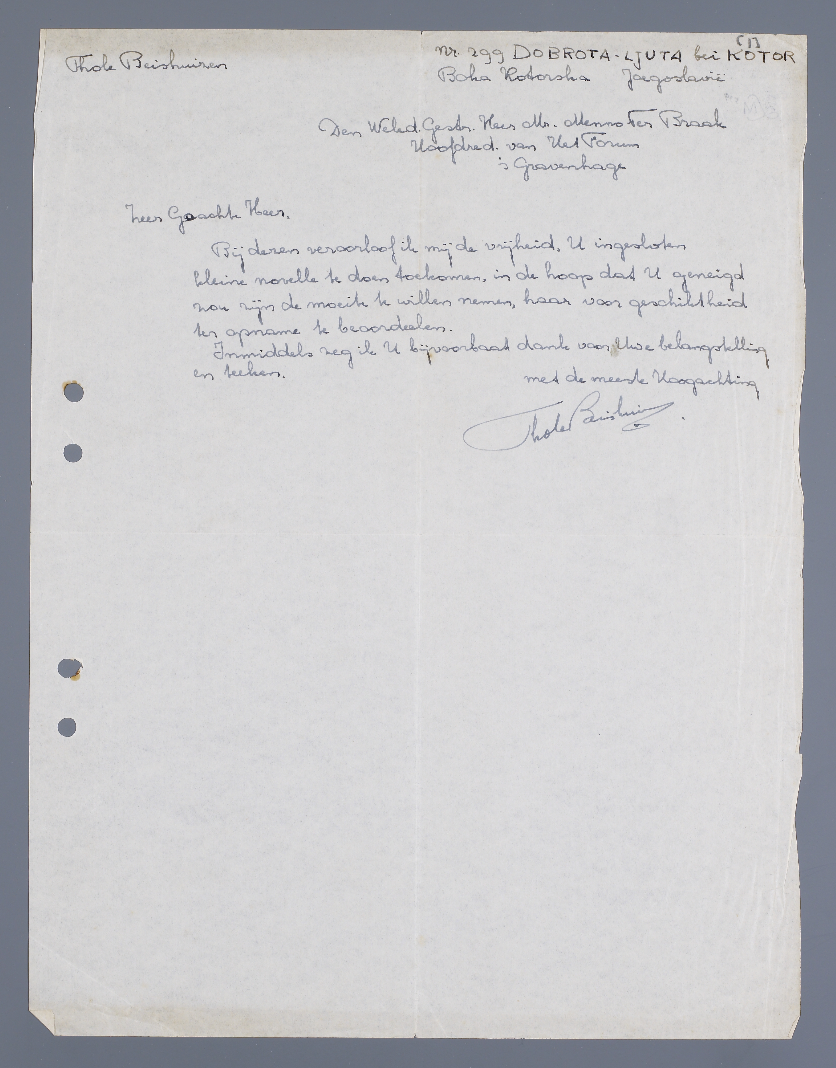 Bij dezen veroorloof ik mij de vrijheid, U ingesloten kleine novelle te doen toekomen, in de hoop dat U geneigd zou zijn de moeite te willen nemen, haar voor geschiktheid ter opname te beoordelen.
