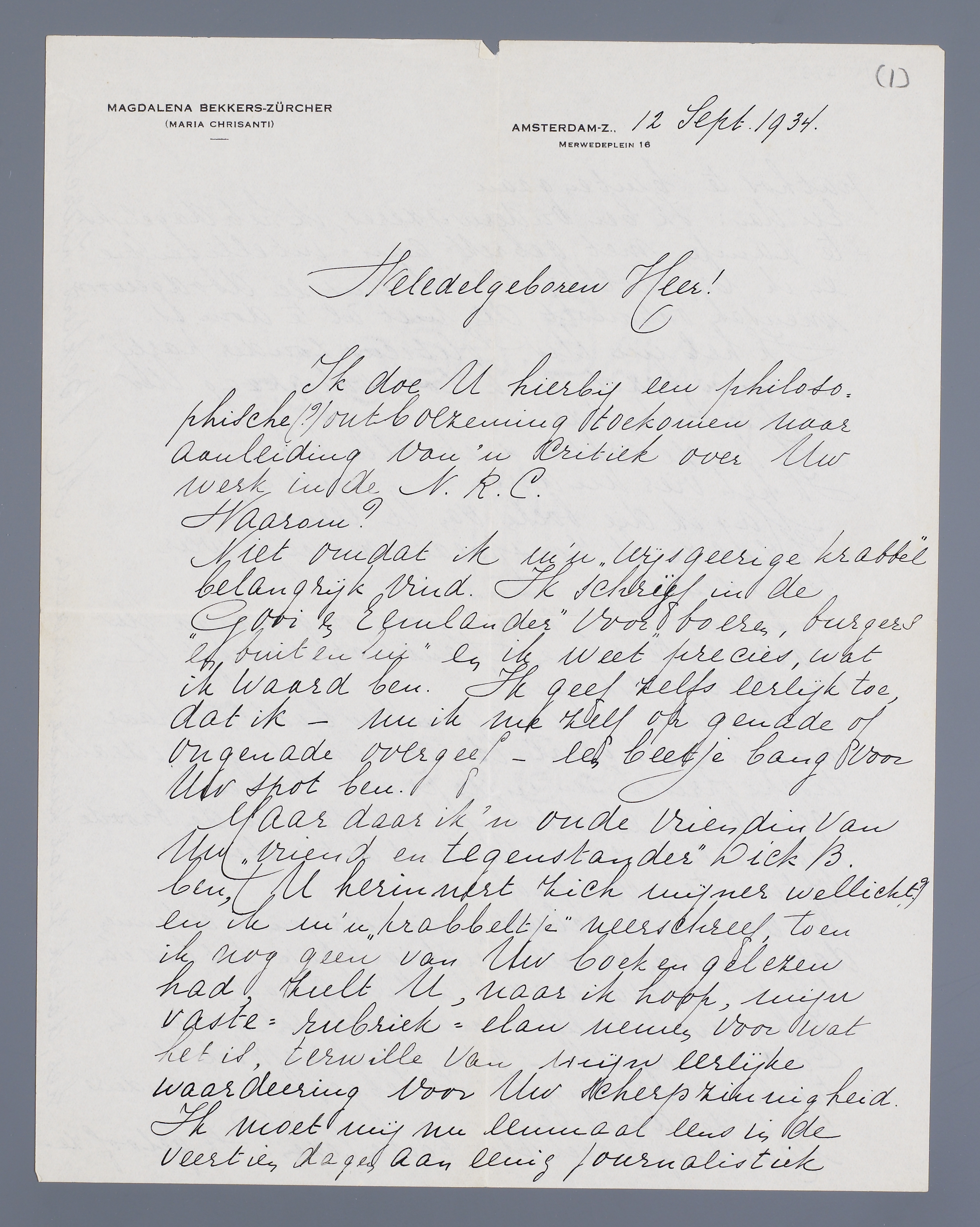 Ik doe U hierbij een philosophische(?) ontboezeming toekomen naar aanleiding van 'n critiek over Uw werk in de N.R.C.
