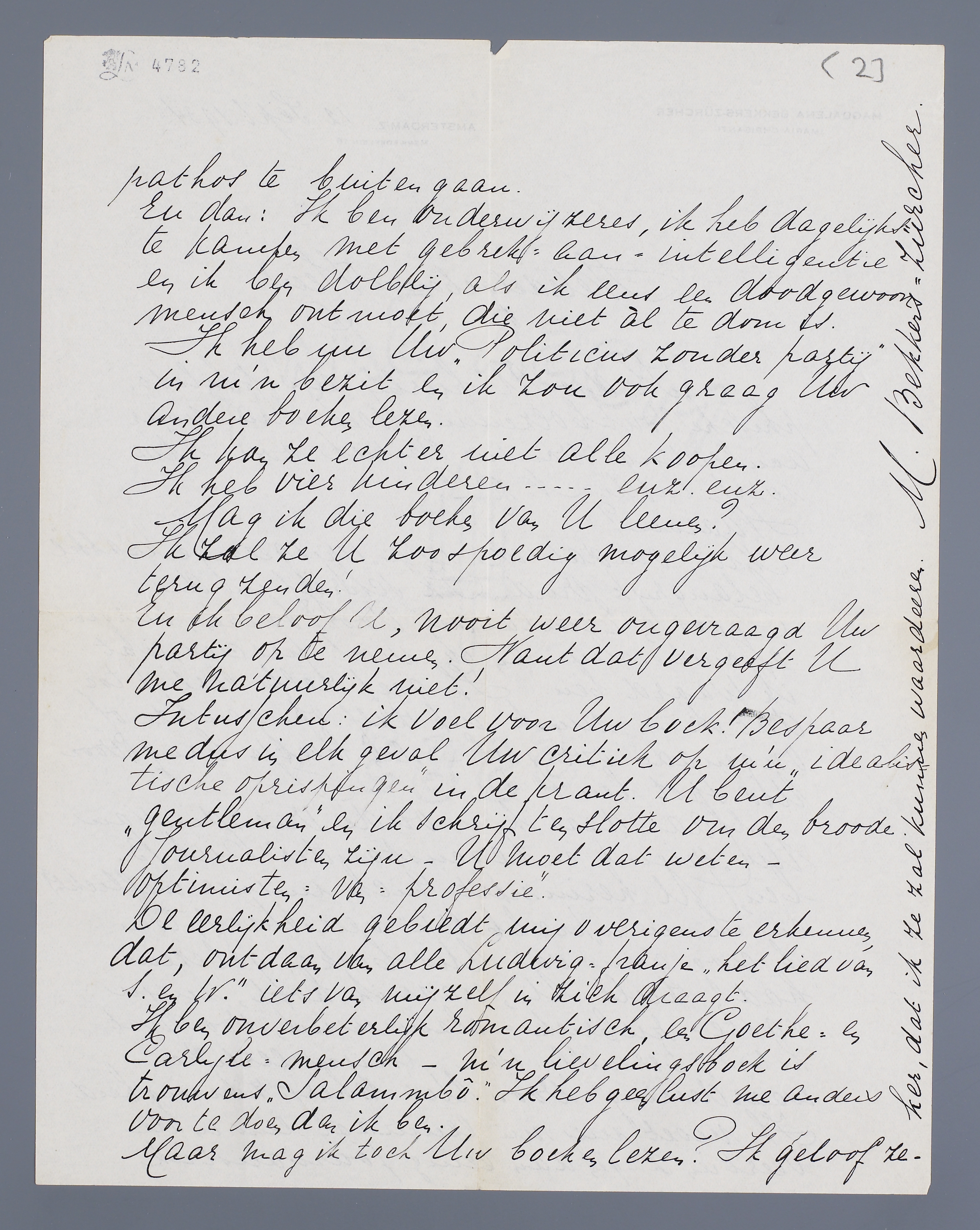 Ik ben onverbeterlijk romantisch, een Goethe- en Carlyle-mensch - m'n lievelingsboek is trouwens ‘Salammbô’. Ik heb geen lust me anders voor te doen dan ik ben.