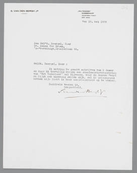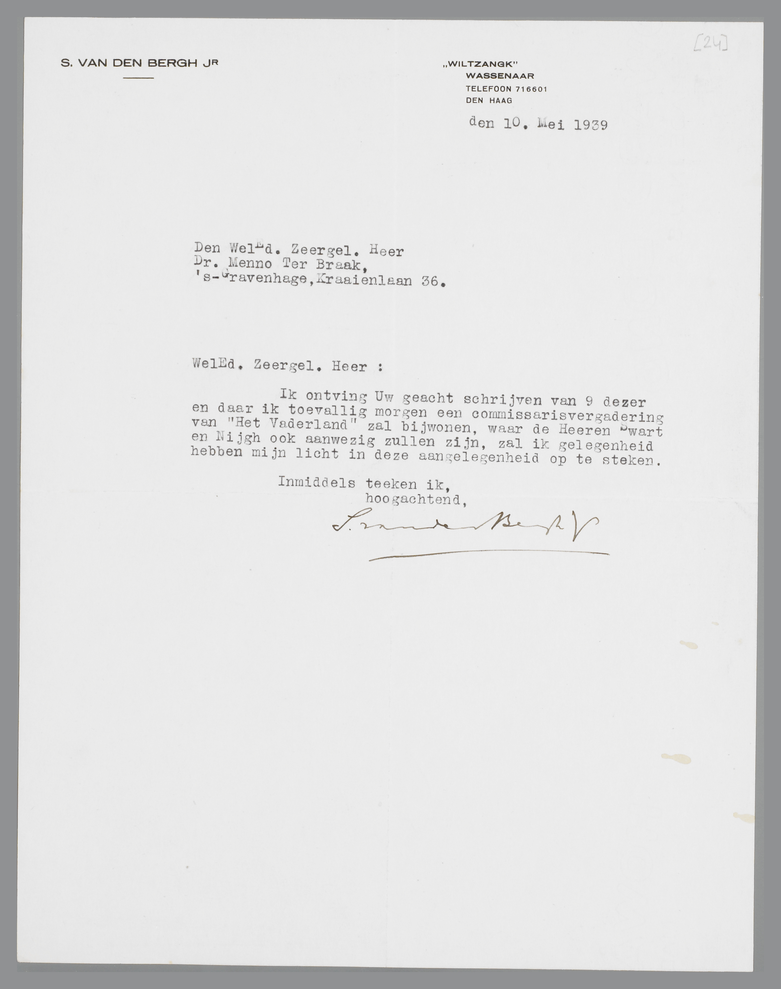 Ik ontving Uw geacht schrijven van 9 dezer en daar ik toevallig morgen een commissarisvergadering van ‘Het Vaderland’ zal bijwonen, waar de Heeren Swart en Nijgh ook aanwezig zullen zijn, zal ik gelegenheid hebben mijn licht in deze aangelegenheid op te steken.