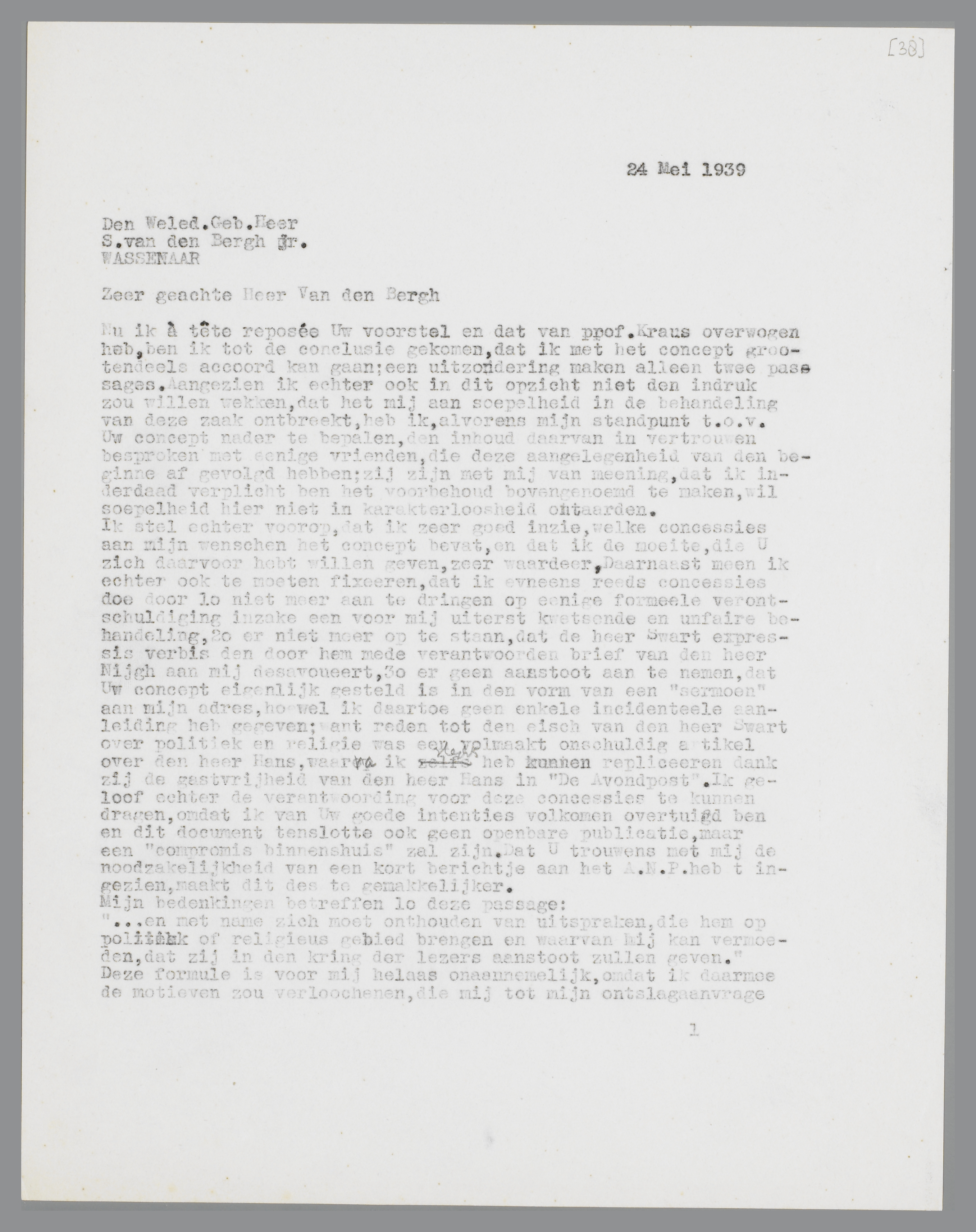 Ik stel echter voorop, dat ik zeer goed inzie, welke concessies aan wenschen het concept bevat, en dat ik de moeite, die U zich daarvoor hebt willen geven, zeer waardeer. Daarnaast meen ik echter ook te moeten fixeeren, dat ik eveneens reeds concessies doe door 1e niet meer aan te dringen op eenige formeele verontschuldigding inzake een voor mij uiterst kwetsende en unfaire behandeling, 2e er niet meer op te staan, dat de heer Swart expressis verbis den door hem mede verantwoorden brief van den heer Nijgh aan mij desavoueert, 3e er geen aanstoot aan te nemen, dat Uw concept eigenlijk gesteld is in den vorm van een ‘sermoen’ aan mijn adres, hoewel ik daartoe geen enkele incidenteele aanleiding heb gegeven; want reden tot den eisch van den heer Swart over politiek en religie was een volmaakt onschuldig artikel over den heer Hans, waarna ik slechts heb kunnen repliceeren dank zij de gastvrijheid van den heer Hans in ‘De Avondpost’. Ik geloof echter de verantwoording voor deze concessies te kunnen dragen, omdat ik van Uw goede intenties volkomen overtuigd ben en dit document tenslotte ook geen openbare publicatie, maar een ‘compromis binnenshuis’ zal zijn. Dat U trouwens met mij de noodzakelijkheid van een kort berichtje aan het A.N.P. hebt ingezien, maakt dit des te gemakkelijker.
