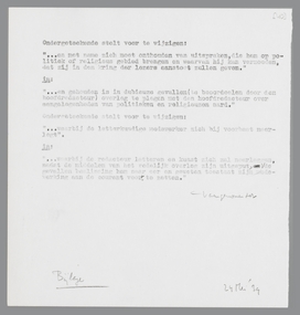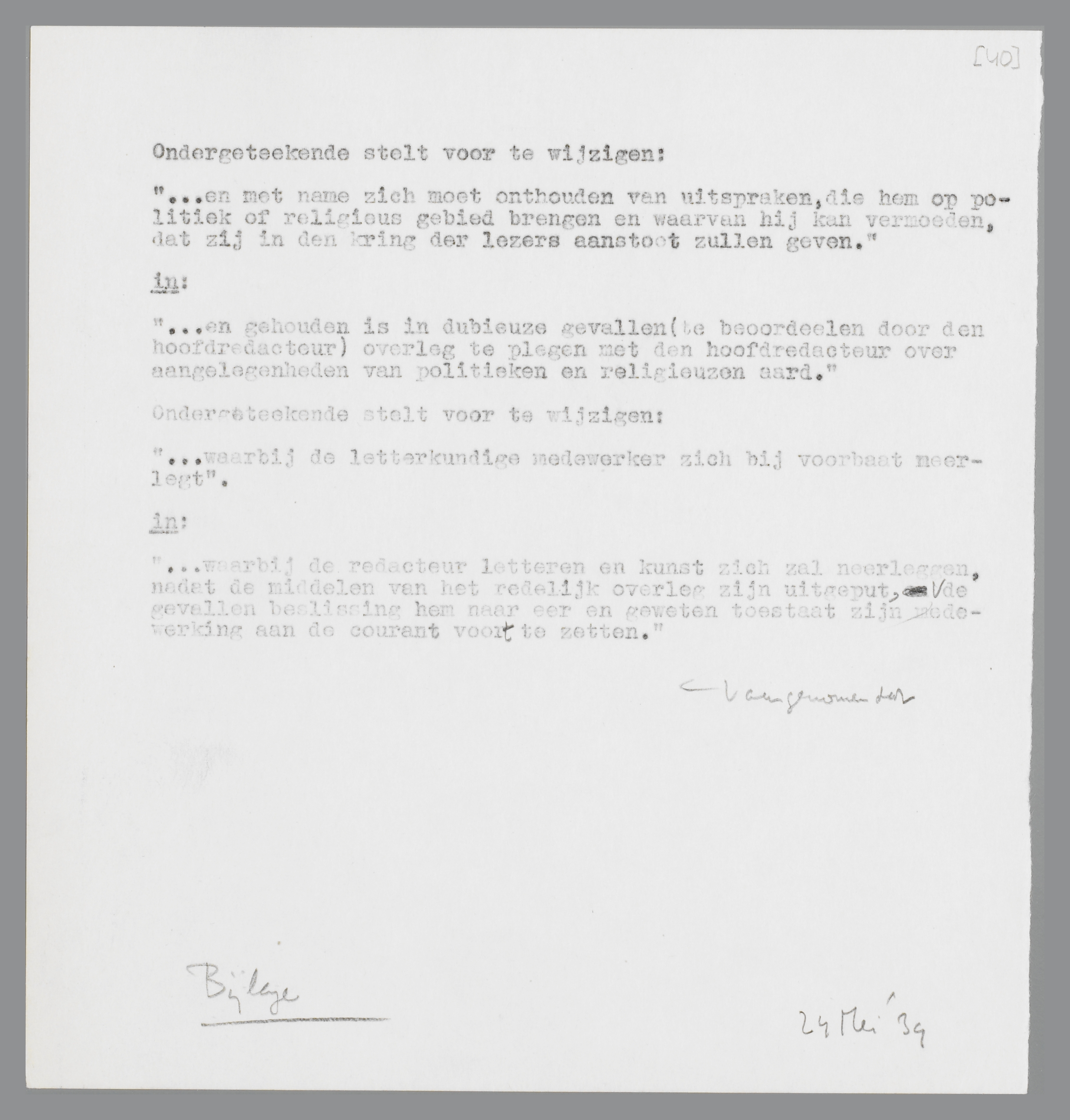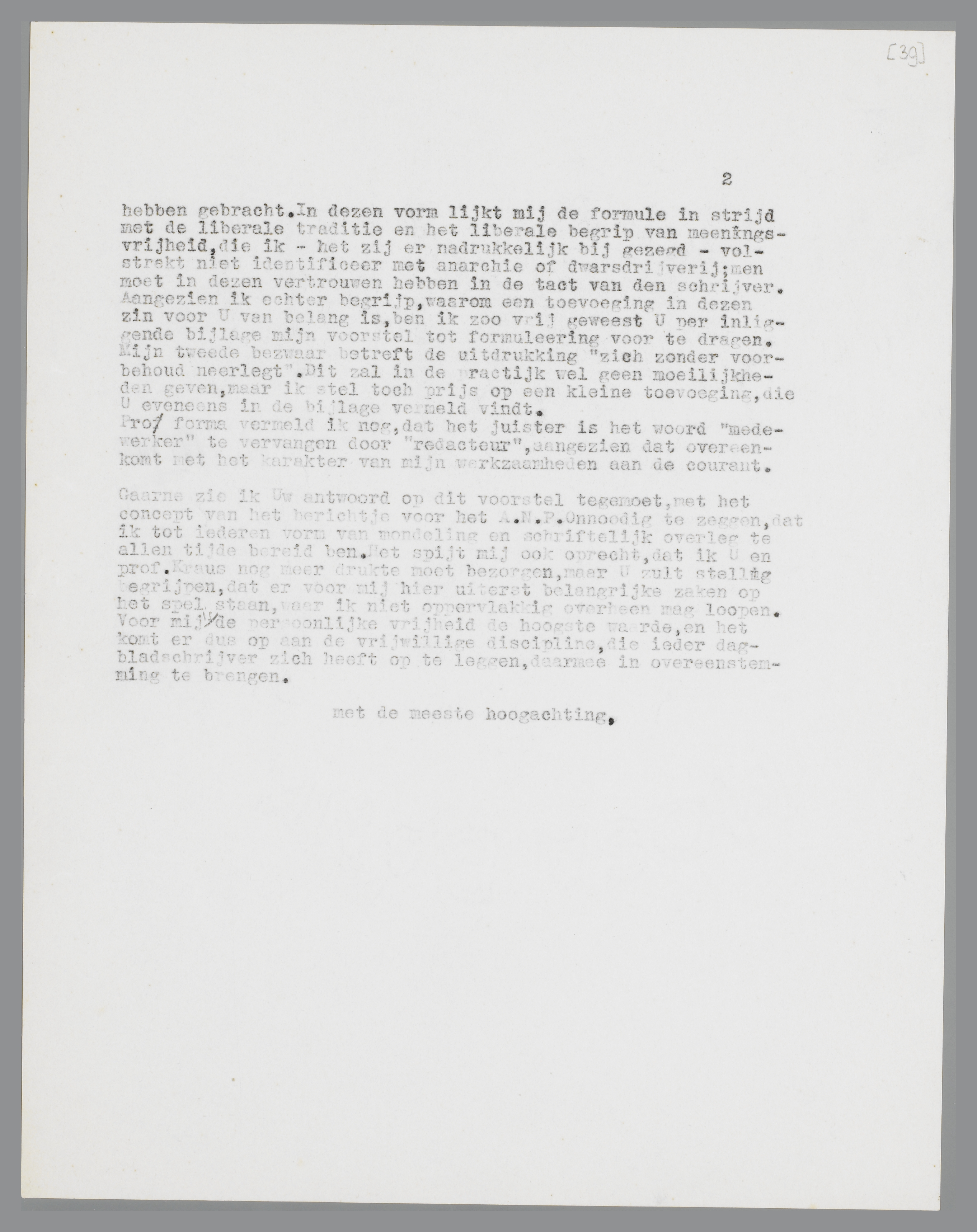 Deze formule is voor mij helaas onaannemelijk, omdat ik daarmee de motieven zou verloochenen, die mij tot mijn ontslagaanvrage hebben gebracht. In dezen vorm lijkt mij de formule in strijd met de liberale traditie en het liberale begrip van meeningsvrijheid, die ik - het zij er nadrukkelijk bij gezegd - volstrekt niet indentificeer met anarchie of dwarsdrijverij; men moet in dezen vertrouwen hebben in de tact van den schrijver. Aangezien ik echter begrijp, waarom een toevoeging in dezen zin voor U van belang is, ben ik zoo vrij geweest U per inliggende bijlage mijn voorstel tot formuleering voor te dragen. Mijn tweede bezwaar betreft de uitdrukking ‘zich zonder voorbehoud neerlegd’. Dit zal in de practijk wel geen moeilijkheden geven, maar ik stel toch prijs op een kleine toevoeging, die U eveneens in de bijlage vindt.
