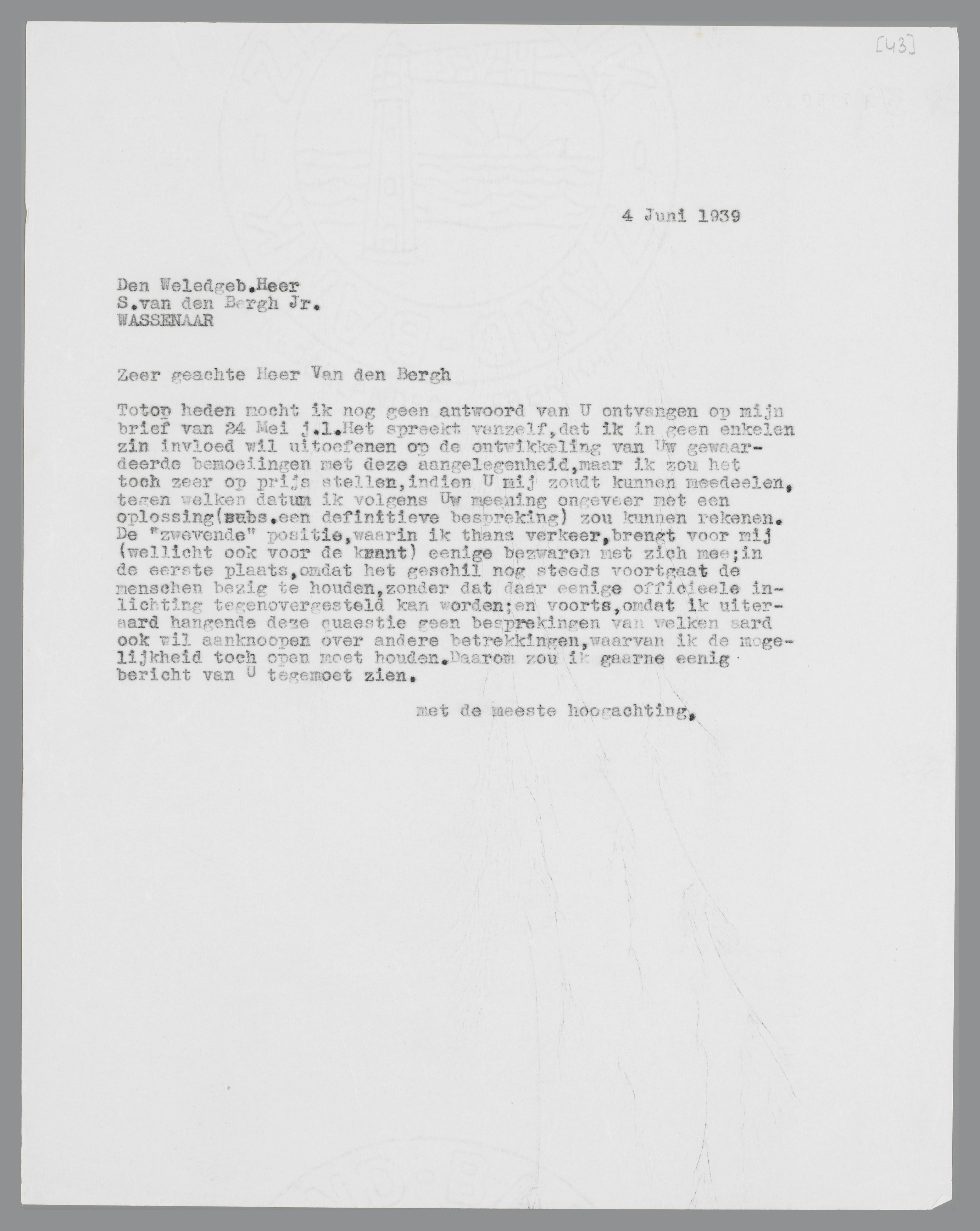 Tot op heden mocht ik nog geen antwoord van U ontvangen op mijn brief van 24 Mei j.l. Het spreekt vanzelf, dat ik in geen enkelen zin invloed wil uitoefenen op de ontwikkeling van Uw gewaardeerde bemoeiingen met deze aangelegenheid, maar ik zou het toch zeer op prijs stellen, indien U mij zoudt kunnen meedeelen, tegen welken datum ik volgens Uw meening ongeveer met een oplossing (subs. een de definitieve bespreking) zou kunnen rekenen. De ‘zwevende’ positie, waarin ik thans verkeer, brengt voor mij (wellicht ook voor de krant) eenige bezwaren met zich mee; in de eerste plaats, omdat het geschil nog steeds voortgaat de menschen bezig te houden, zonder dat daar eenige officieele inlichting tegenovergesteld kan worden; en voorts, omdat ik uiteraard hangende deze quaestie geen besprekingen van welken aard ook wil aanknoopen over andere betrekkingen, waarvan ik de mogelijkheid toch open moet houden. Daarom zou ik gaarne eenig bericht van U tegemoet zien.