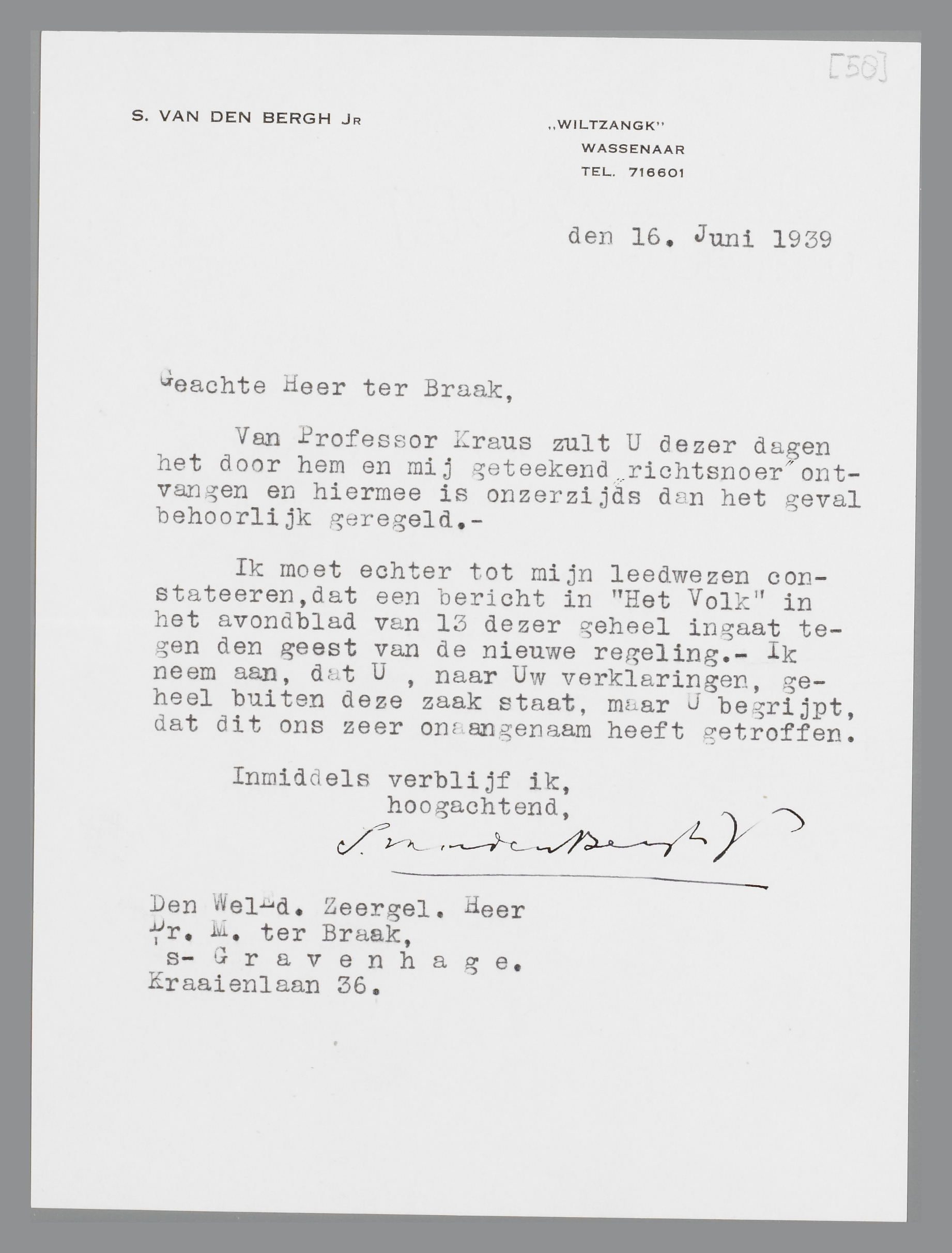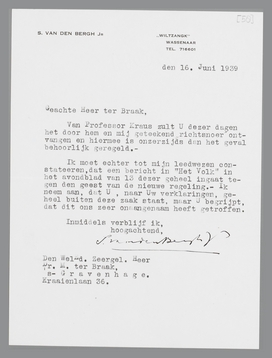 Ik moet echter tot mijn leedwezen constateeren, dat een bericht in ‘Het Volk’ in het avondblad van 13 dezer geheel ingaat tegen den geest van den nieuwe regeling. - Ik neem aan, dat U, naar Uw verklaringen, geheel buiten deze zaak staat, maar U begrijpt, dat dit ons zeer onaangenaam heeft getroffen.