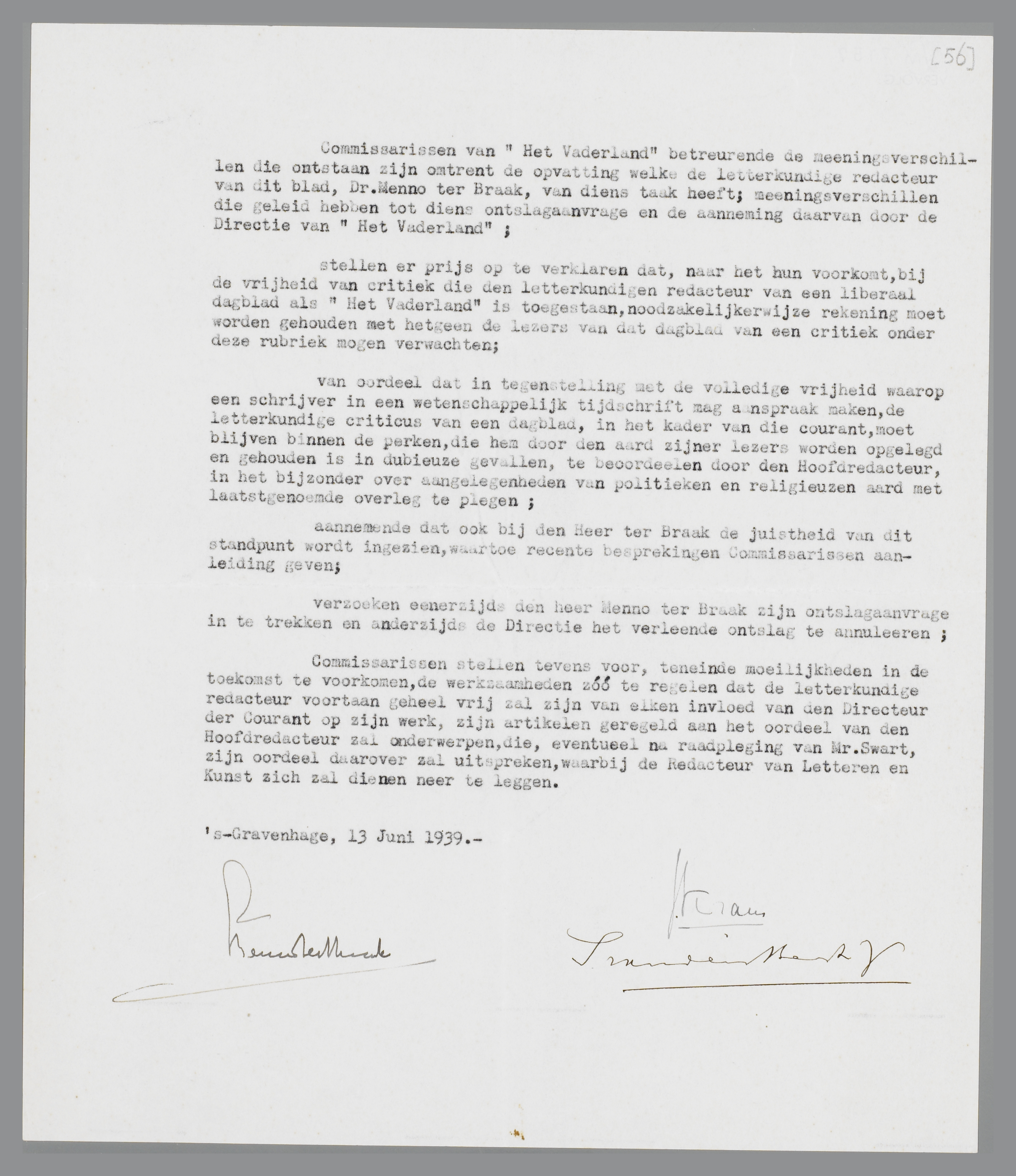 Commissarissen van ‘Het Vaderland’, betreurende de meeningsverschillen die ontstaan zijn omtrent de opvatting welke de letterkundige redacteur van dit blad Dr. Menno ter Braak van diens taak heeft; meeningsverschillen, die geleid hebben tot diens onstlagaanvrage en de aanneming daarvan door den directeur van ‘Het Vaderland’;