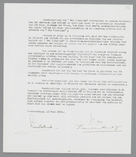 Naar aanleiding van Uw schrijven van 16 Juni j.l deel ik U mede, dat ik van prof. Kraus dezer dagen twee exemplaren van het ‘richtsnoer’ ontving, waarvan ik er één aan hem terugzond, voorzien van mijn handteekening. Ook voor mij is hiermee het ‘geschil’ definitief afgedaan, en ik spreek de hoop uit, dat het in de toekomst voor geen van beide ‘partijen’ noodig zal zijn zich op dit document te beroepen; dan beantwoordt het m.i. aan den geest van onderling overleg, waarop onze overeenkomst werd gebaseerd.