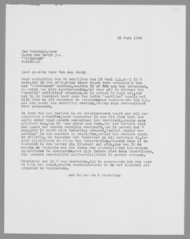 De toon van het bericht in de Arbeiderspers heeft ook mij onaangenaam getroffen, maar aangezien ik aan dit blad noch aan eenig ander blad nadere commentaar heb verstrekt, zooals onze afspraak was, kan ik daar niets aan doen. Dat het bericht niet den geest der nieuwe regeling weergeeft, ben ik geheel met U eens. Het is nooit mijn bedoeling geweest, ‘geheel zonder beperking’ in een courant te schrijven, zooals het bericht zegt; de wrijving, die tusschen Het Vaderland en mij ontstaan is, betrof uitsluitend de wijze van samenwerking. Wanneer deze in de toekomst in den besten zin liberaal zal zijn, dan ben ik de eerste om bepaalde aan het wezen der journalistiek inhaerente beperkingen te aanvaarden. Het zijn immers niet deze beperkingen, die iemands geestelijke onafhankelijkheid in gevaar brengen.