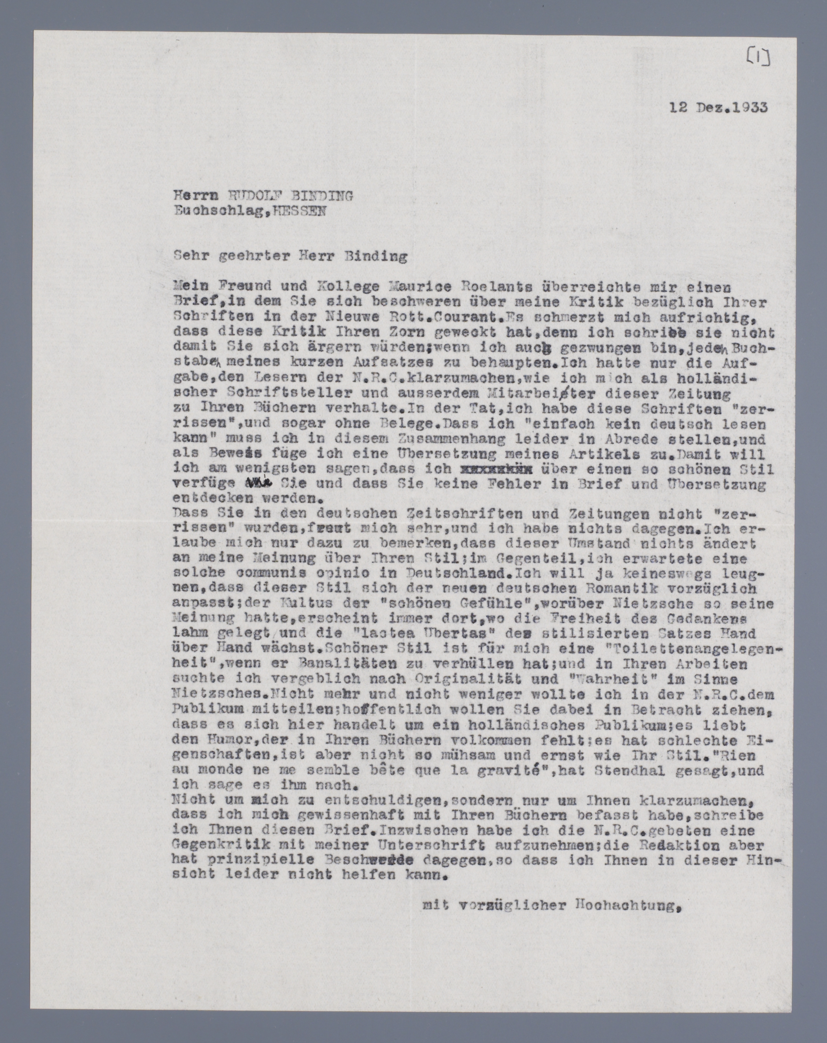 Mein Freund und Kollege Maurice Roelants überreichte mir einen Brief, in dem Sie sich beschweren über meine Kritik bezüglich Ihrer Schriften in der Nieuwe Rott. Courant. Es schmerzt mich aufrichtig, dass diese Kritik Ihren Zorn geweckt hat, denn ich schrieb sie nicht damit Sie sich ärgern würden; wenn ich auch gezwungen bin, jeden Buchstaben meines kurzen Aufsatzes zu behaupten. Ich hatte nur die Aufgabe, den Lesern der N.R.C. klarzumachen, wie ich mich als holländischer Schriftsteller und ausserdem Mitarbeiter dieser Zeitung zu Ihren Büchern verhalte. In der Tat, ich habe diese Schriften ‘zerrissen’, und sogar ohne Belege. Dass ich ‘einfach kein deutsch lesen kann’ muss ich in diesem Zusammenhang leider in Abrede stellen, und als Beweis füge ich eine Übersetzung meines Artikels zu. Damit will ich am wenigsten sagen, dass ich über einen so schönen Stil verfüge wie Sie und dass Sie keine Fehler in Brief und Übersetzung entdecken werden.