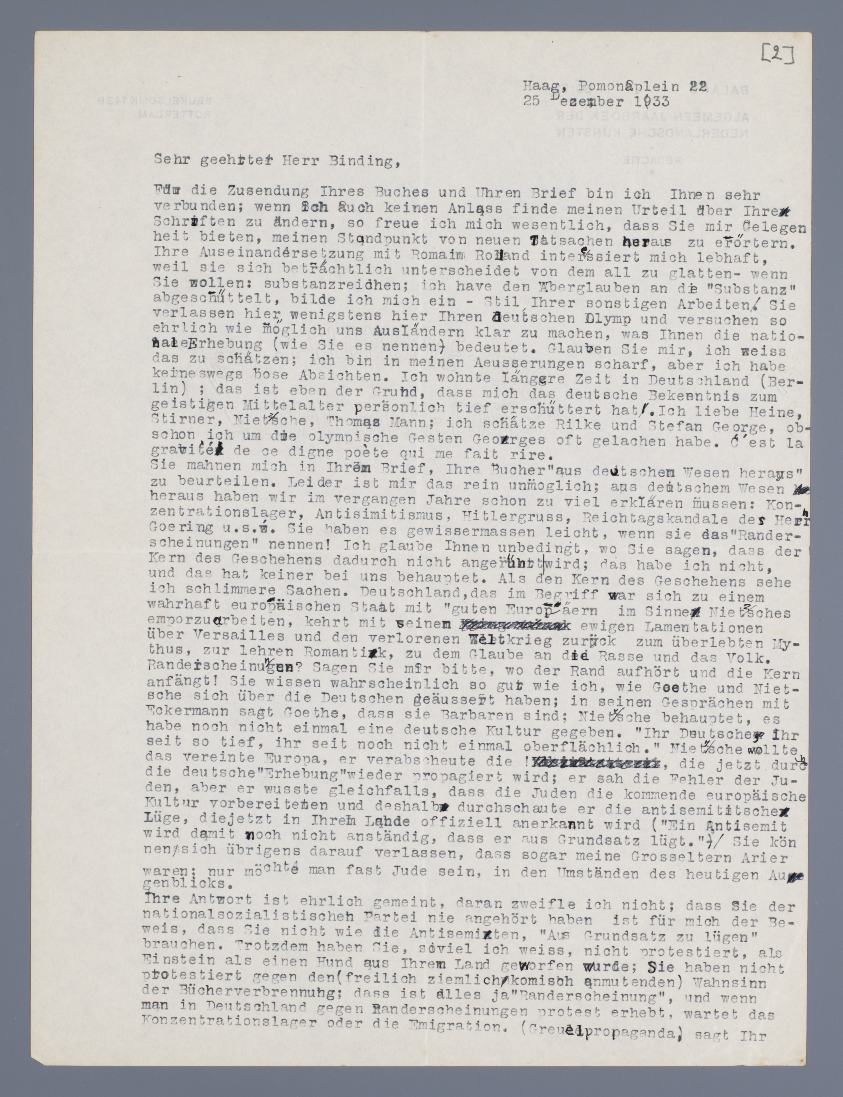 Ihre Antwort ist ehrlich gemeint, daran zweifle ich nicht; dass Sie der nationalsozialistischen Partei nie angehört haben ist für mich der Beweis, dass Sie nicht wie die Antisemiten, ‘Aus Grundsatz zu lügen’ brauchen. Trotzdem haben Sie, soviel ich weiss, nicht protestiert, als Einstein als einen Hund aus Ihrem Land geworfen wurde; Sie haben nicht protestiert gegen den (freilich ziemlich komisch anmutenden) Wahnsinn der Bücherverbrennung; dass ist alles ja ‘Randerscheinung’, und wenn man in Deutschland gegen Randerscheinungen protest erhebt, wartet das Konzentrationslager oder die Emigration. [‘Greuelpropaganda’], sagt Ihr Minister [Goebbels], diese neue Randerscheidung der deutschen Kultur; ich habe, schade für ihn, in meinem Besitz das reizende Büchlein ‘Juden sehen Dich an’, selbstverständlich auch eine kleine Randererscheinung. Warum protestieren Sie nicht? Weil (in Ihren eigenen Worten) ‘nicht jeder sagen kann was er will’. Solange Sie feierlich, platonisch, religiös, mystisch, tief und noch einmal tief bleiben, solange wird kein S.A. Mann Sie belästigen; Ihre ‘Universalität’, das weiss man ganz genau, ist harmlos wenn Sie nicht mehr sagen. Wahrhaftig, ich liebe Herrn Feuchtwanger und Emil Ludwig nicht mehr wie Sie (wahrscheinlich); ich kann aber deswegen noch nicht einsehen, warum es nötig ist, das ‘Germany puts the clock back’ und die alten Dekorationen des Volksmythus wieder neu aufgeputzt werden sollen. Der Versailler Vertrag war eine Lüge, gewiss, nicht grösser, und nicht kleiner als die neue Lüge der Rassenreinheit, und wir Holländer sind davon eben so überzeugt wie Sie; aber Ihre Nation hat weder Frankreich noch die Inflation Ihnen genommen, Sie haben diese Tragödie enszeniert, Sie haben diesen Vertrag immer und immer wieder verkuppelt mit dem nationalen Martyrium. Ich frage: warum konnte das Individuum in Deutschland unter der Republik von Weimar nicht frei und unabhängig leben, warum musste das Nationalgefühl immer verantwortlich gemacht werden für die romantischen Träumereien über die Vergangenheit?